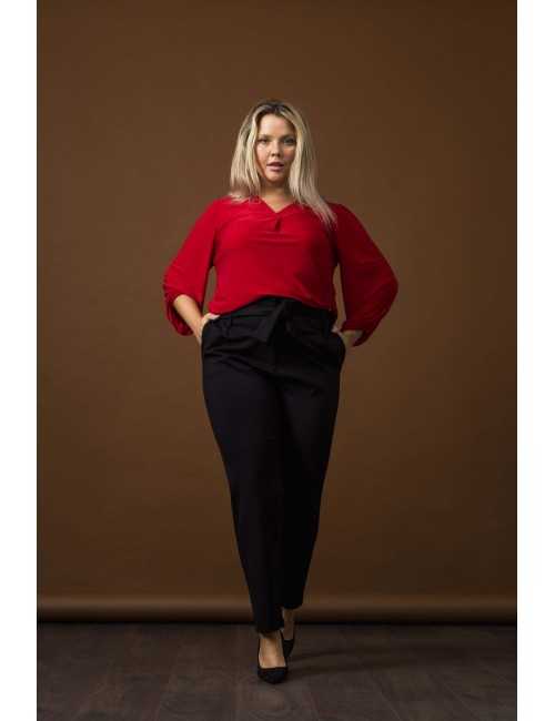 Pantalón de punto roma liso, cintura alta con pliegues, cierre delantero, bolsillos laterales. Cinturón de la misma tela con lazo. Colección: Otoño Invierno Disponible en Tallas Grandes Producto de diseño y fabricación propia. Somos una marca de confección de ropa con más de 50 años de experiencia Modelo: Altura 1.63m y está vistiendo la talla 2XL, en color rojo. Modelo: Altura 1.63m y está vistiendo la talla 2XL, en color camello y negro. Composición: 64%Viscosa 31%Poliamida 5%Elastano