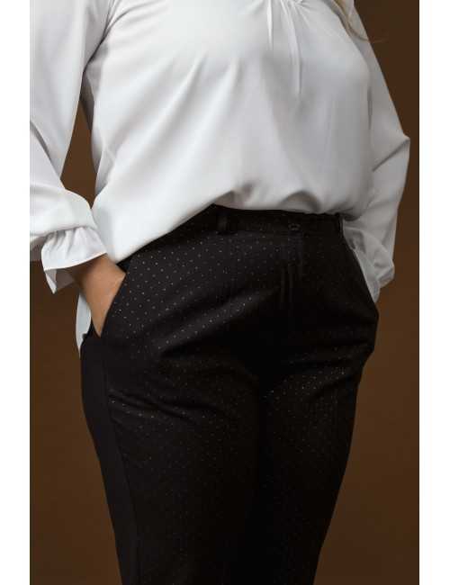 Pantalones de tejido con estampado de lurex, cierra con botón y cremallera y tiene bolsillos laterales. Colección: Otoño Invierno Disponible en Tallas Grandes Producto de diseño y fabricación propia. Somos una marca de confección de ropa con más de 50 años de experiencia Modelo: Altura 1.70m y está vistiendo la talla 46. Composición: 66%Poliéster 31%Viscosa 3%Elastano