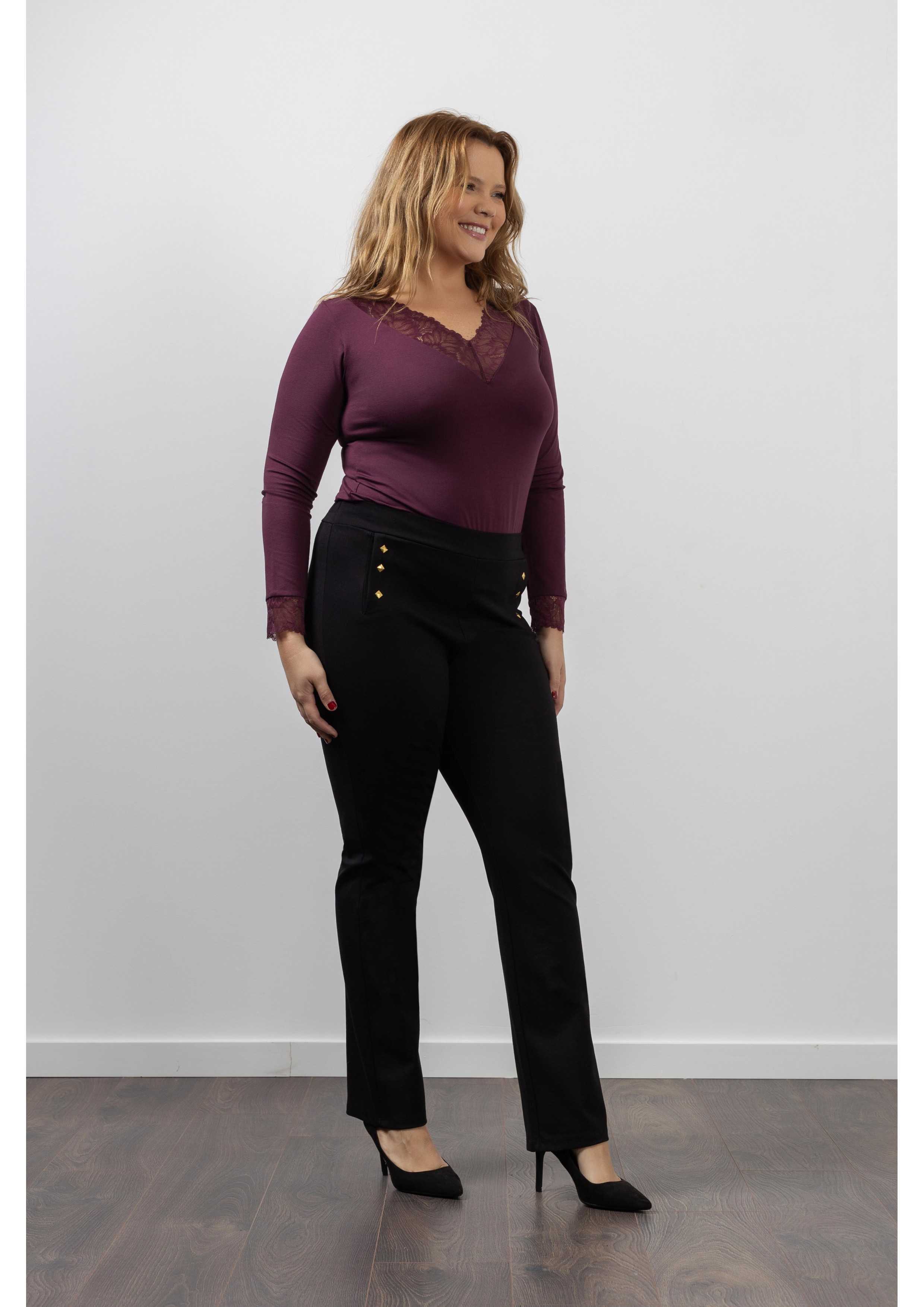 Pantalón de punto liso, elástico en la espalda, frente con vistas y transferencia de estrella aplicada. Colección: Otoño Invierno Disponible en Tallas Grandes Producto de diseño y fabricación propia. Somos una marca de confección de ropa con más de 50 años de experiencia. Modelo: Altura 1.70m y está usando la talla 2XL. Composición: 64%Viscosa 31%Poliamida 5%Elastano