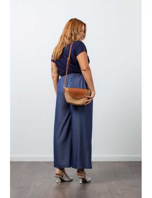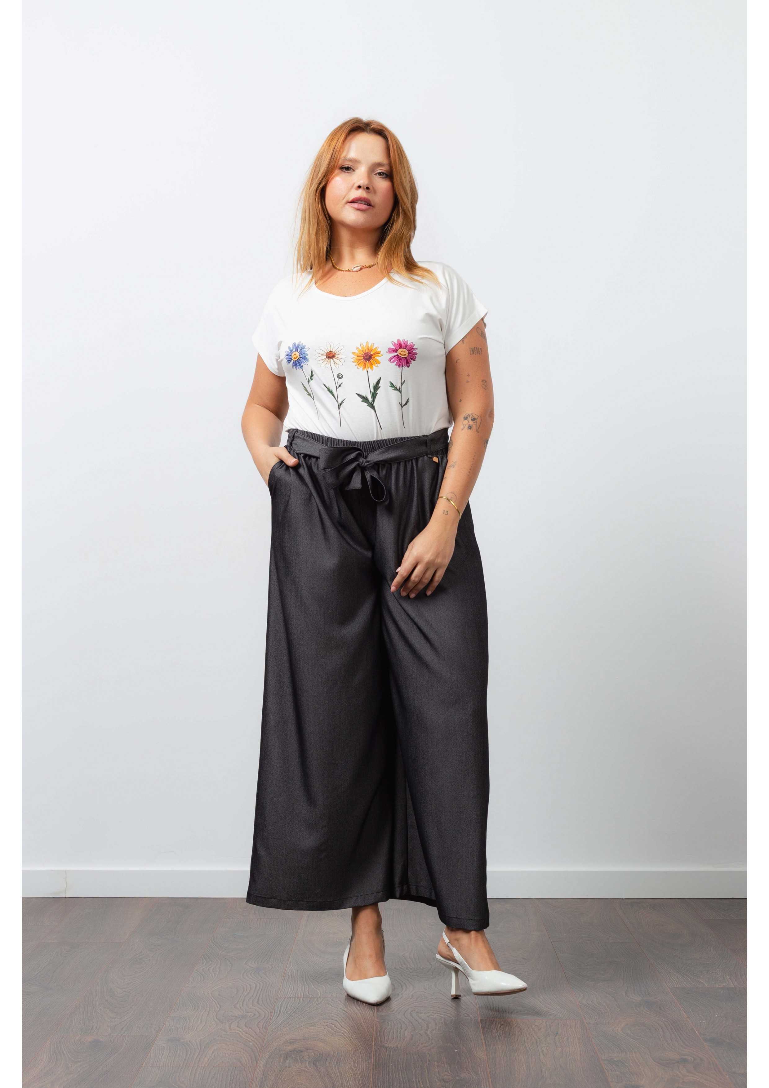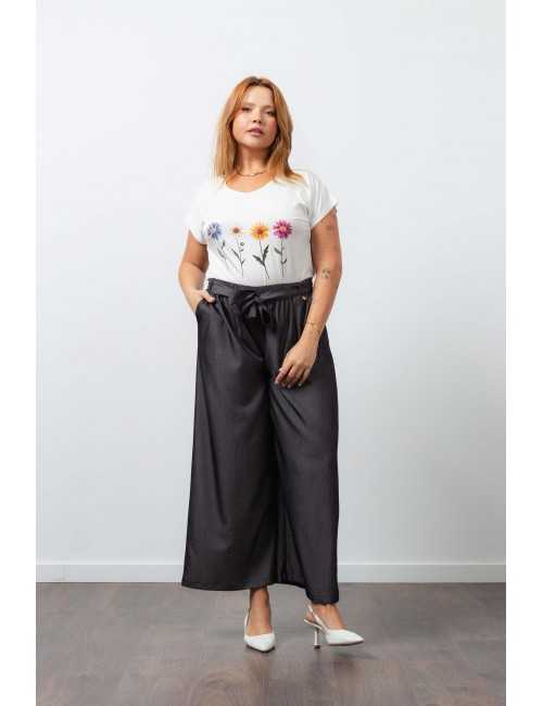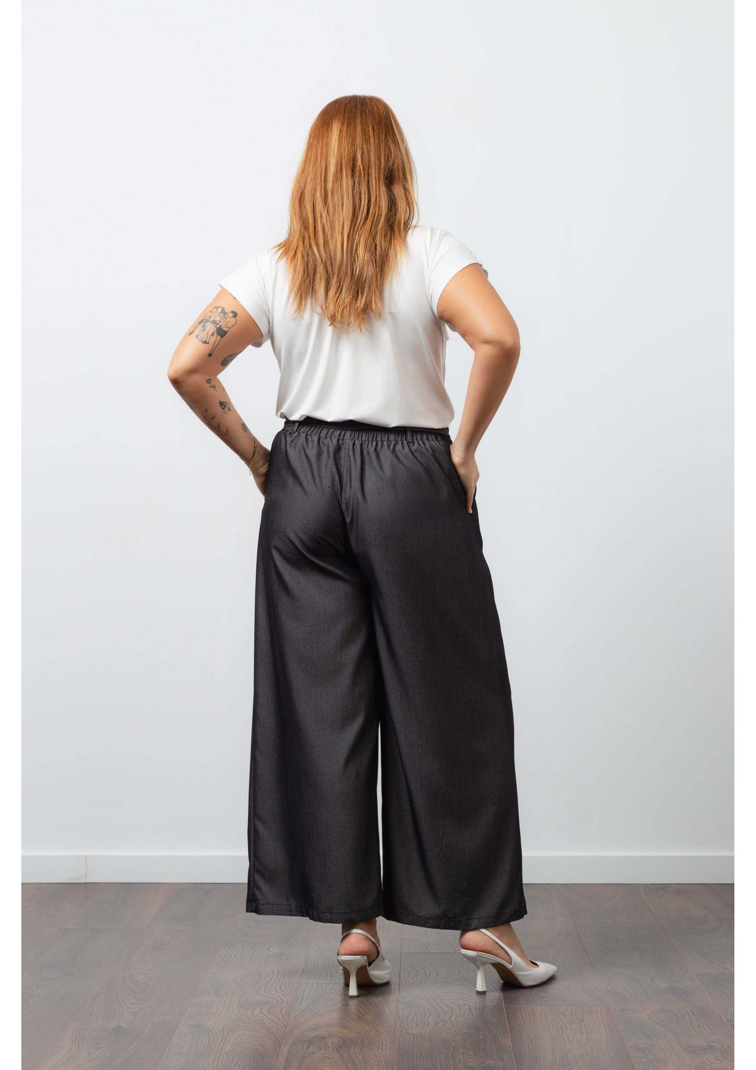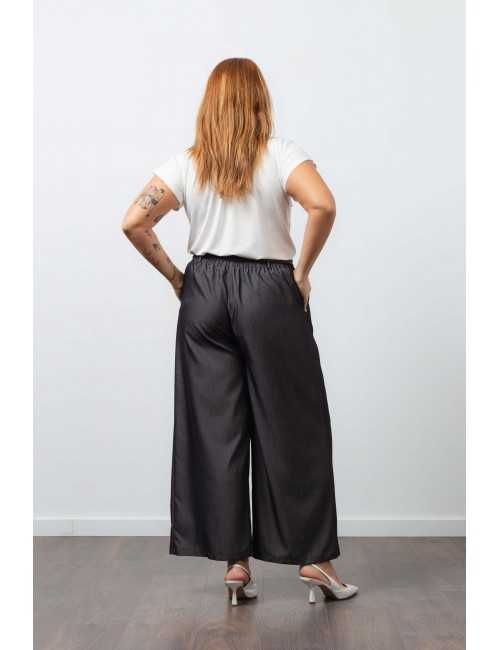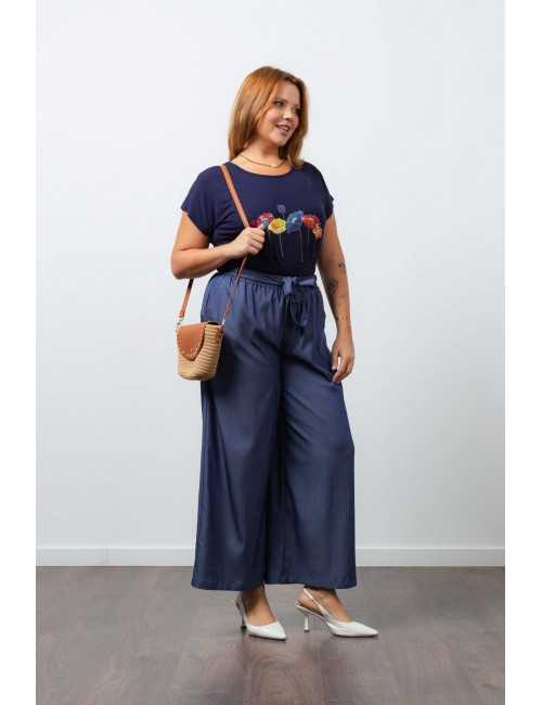Pantalones culotte de tela lisa, denim, cinturón con elástico recubierto, y con cinturón con hebillas. Bolsillos laterales, tapeta a juego. Colección: Primavera Verano Disponible en Tallas Grandes Producto de diseño y fabricación propia. Somos una marca de confección de ropa con más de 50 años de experiencia Modelo: Altura 1.70m y está vistiendo la talla XL. Composición: 94%Poliéster 6%Elastano