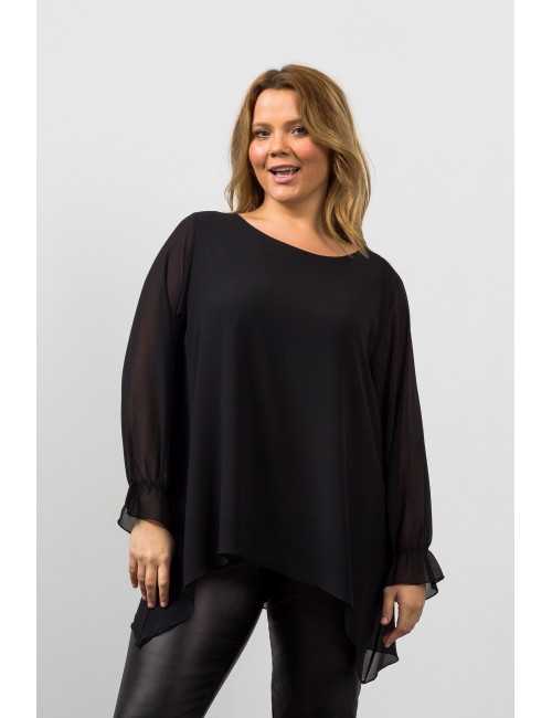 Túnica de tejido liso, fino. Modelo evasé con picos laterales, manga larga con elástico. Acabados en rolinho. Colección: Primavera Verano Disponible en Tallas Grandes Producto de diseño y fabricación propia. Somos una marca de confección de ropa con más de 50 años de experiencia Modelo: Altura 1.70m y está usando la talla 2XL, en negro y azul. Modelo: Altura 1.67m y está usando la talla 5XL, en rojo. Composición: Exterior: 100%Poliéster | Forro: 94%Poliéster 6%Elastano