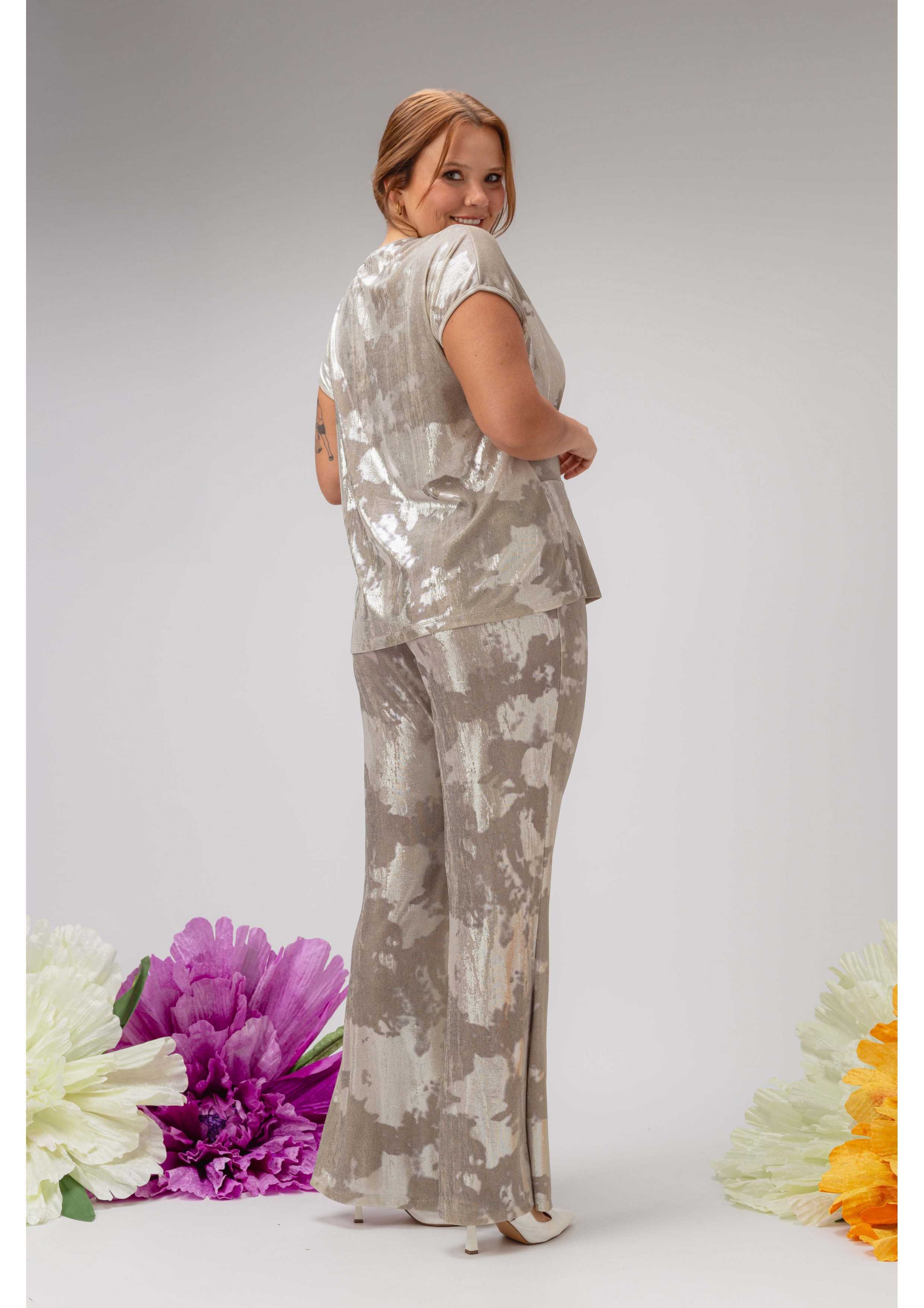 Pantalón de punto con brillo, banda elástica en la cintura. Modelo de campana | Colección: Primavera Verano | Modelo: Altura 1,70m y está usando la talla 2XL