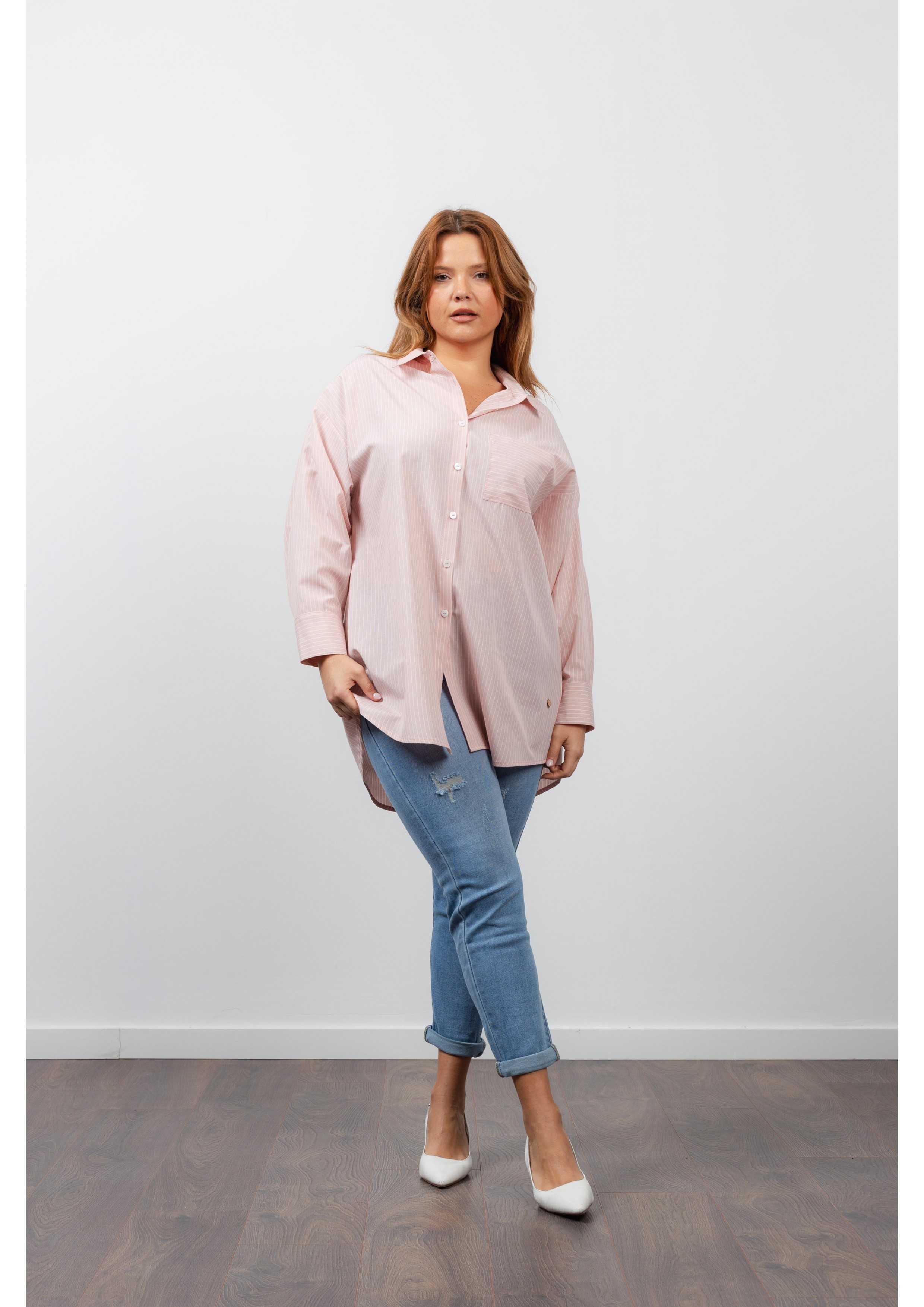 Blusa de tela a rayas con bolsillo en la parte delantera, manga larga con puño, escapulario en la espalda con macho, modelo oversize | Colección: Primavera Verano | Modelo 1 (Altura 1,67m) viste la talla 5XL en color Azul | Modelo 2 (Altura 1,70m) viste la talla 2XL en color salmón y azul