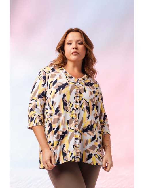 Camiseta de malha estampada con manga 3/4, modelo evasé. Escote en pico con volantes. Colección: Primavera Verano Disponible en Tallas Grandes Producto de diseño y fabricación propia. Somos una marca de confección de ropa con más de 50 años de experiencia Modelo: Altura 1.70m y está usando la talla 2XL. Composición: 95%Poliéster 5%Elastano