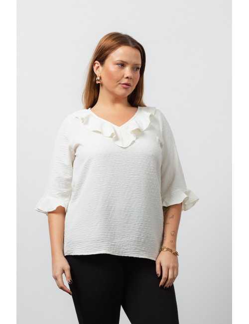 Túnica en tejido liso con relieve, escote en pico con volante, manga 3/4 con volantes. Acabados con arrollado | Colección: Primavera Verano | Modelo: Altura 1,70m y está usando la talla 2XL
