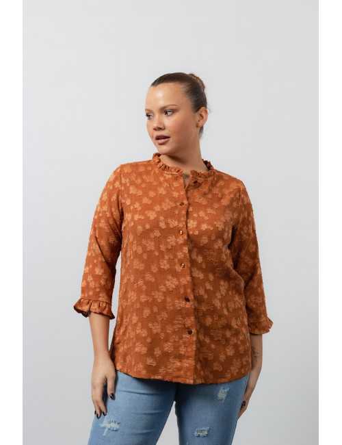 Blusa de tela lisa con relieve, manga 3/4 con volantes. Escote a padre con volantes. Botones del mismo color | Colección: Primavera Verano | Modelo: Altura 1,70m y está usando la talla XL