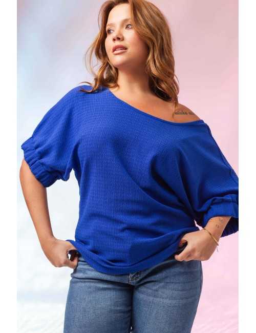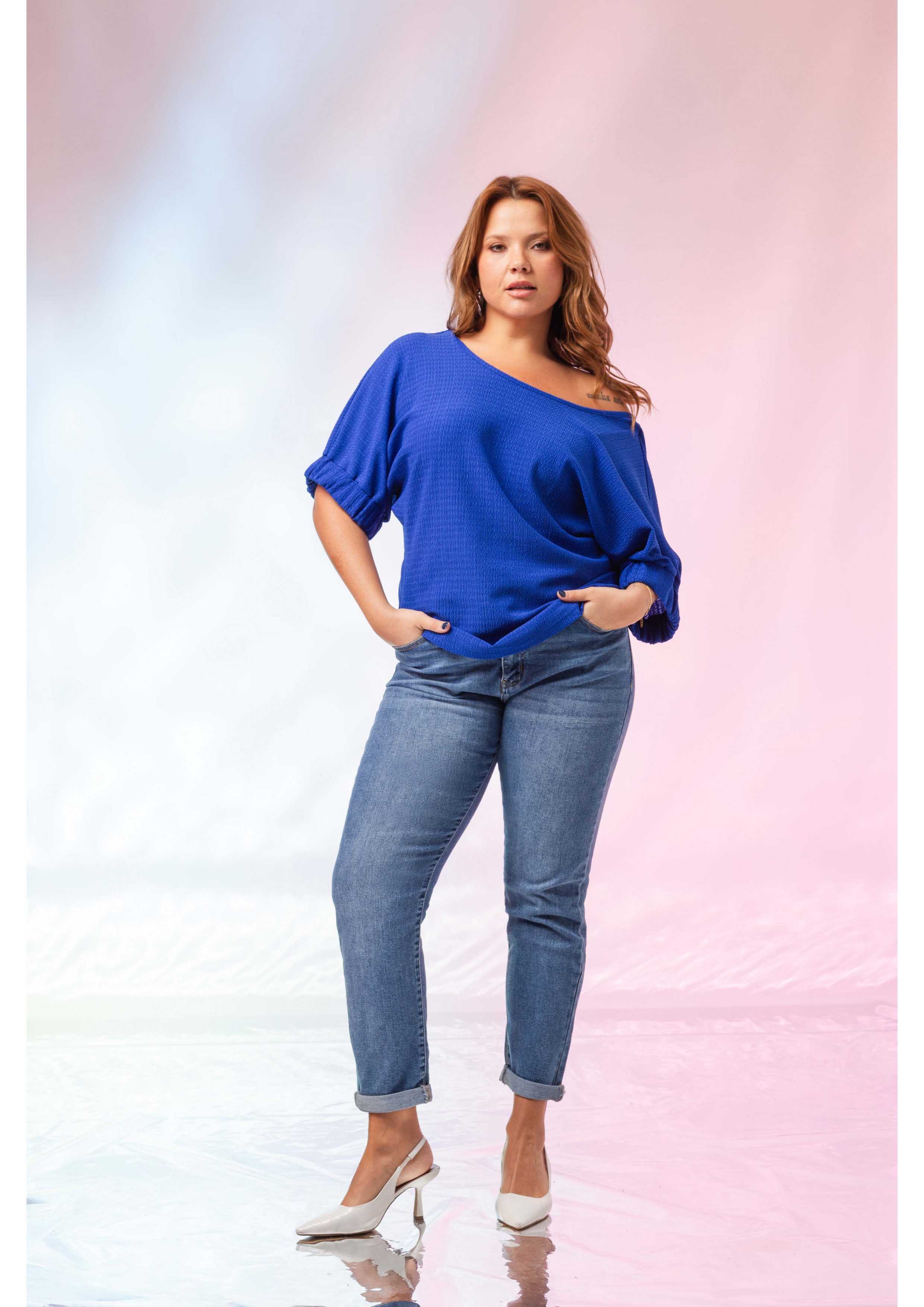 Túnica de punto liso, con relieve, escote redondo y fondo en la parte delantera y trasera. Mangas murciélago con puños altos con elástico | Colección: Primavera Verano | Modelo: Altura 1,70m y está vistiendo la talla 2XL