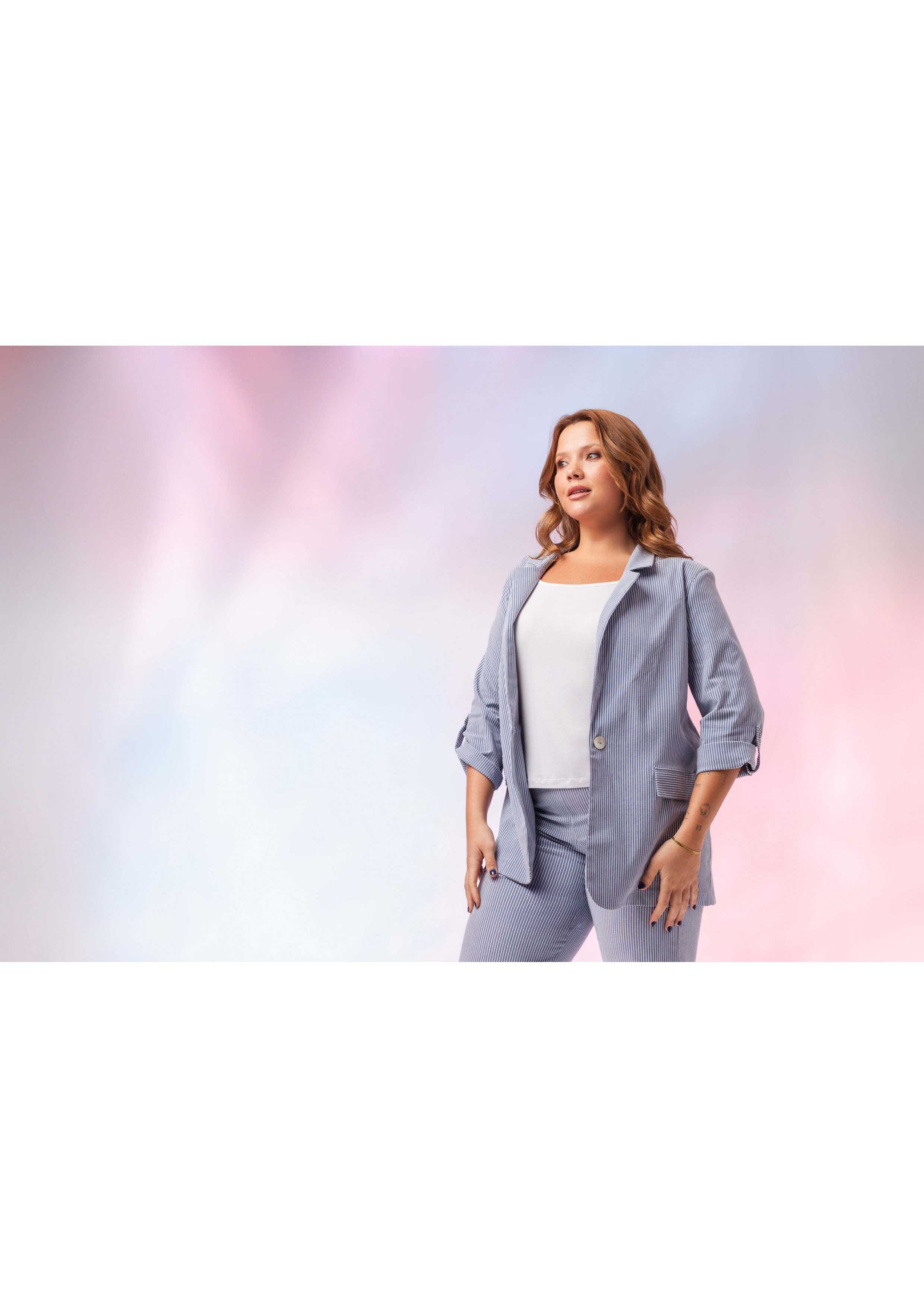Blazer en tejido de raya vertical, Vueltos en la parte frontal, solapas aplicadas a medida. Manga 3/4 con presillas. Corte en la espalda | Colección: Primavera Verano | Modelo: Altura 1.70m y está vistiendo la talla 2XL