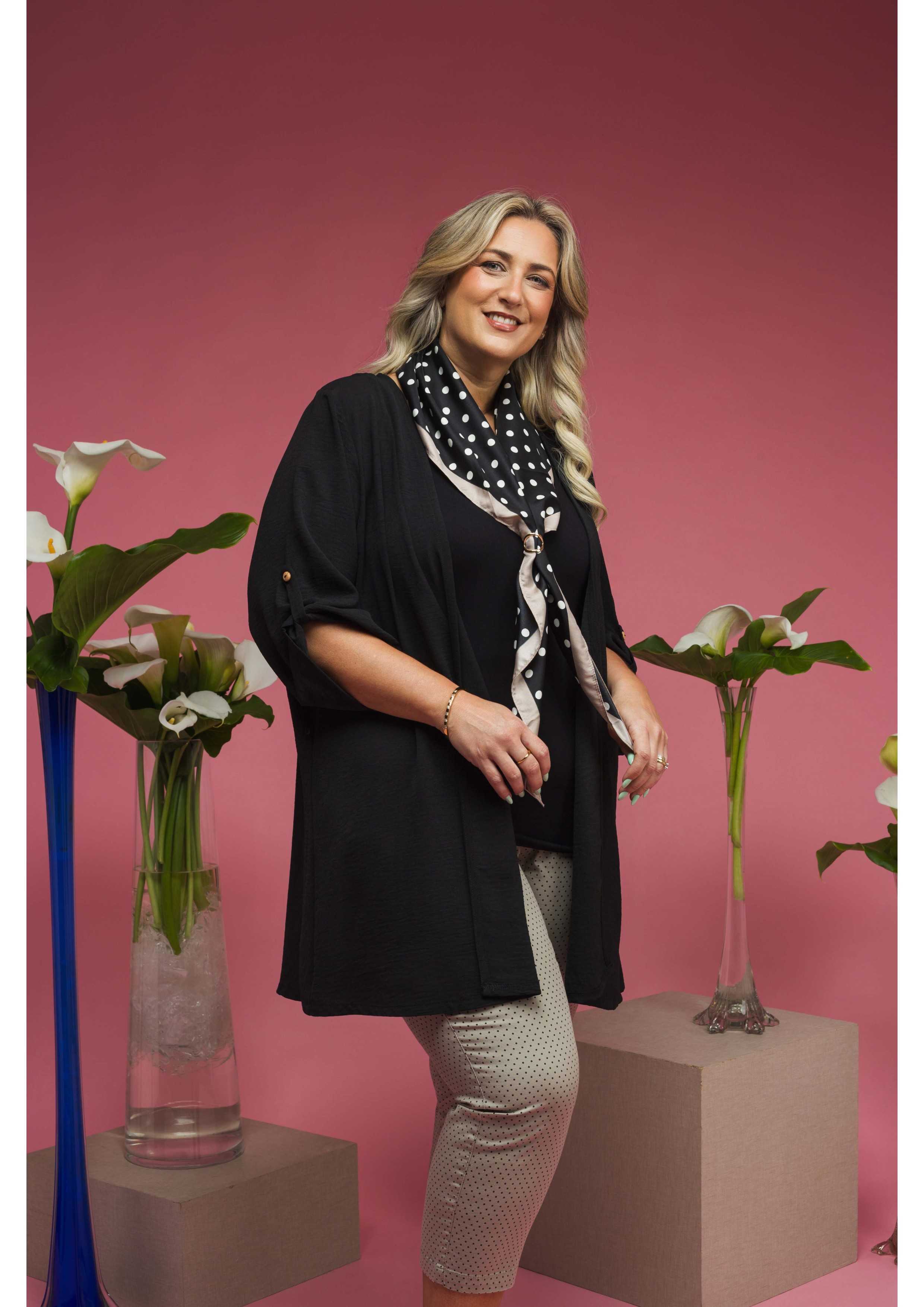 Abrigo de tejido liso, manga 3/4 con presilla y botón de madera. Frente con acabado en colorete. Colección: Primavera Verano Disponible en Tallas Grandes Producto de diseño y fabricación propia. Somos una marca de confección de ropa con más de 50 años de experiencia Modelo: Altura 1.70m y está usando la talla XL. Composición: 100%Poliéster