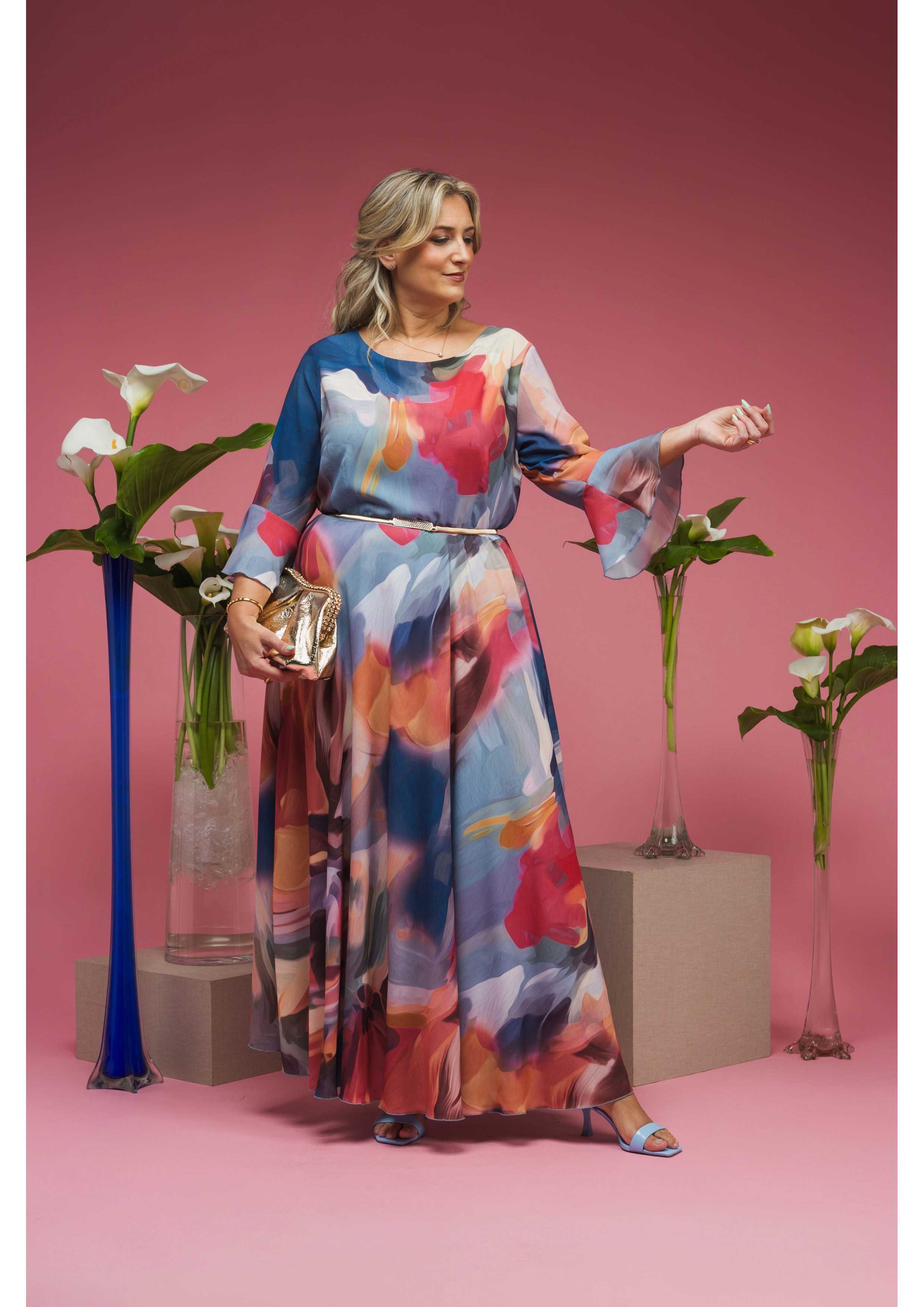 Vestido en tejido estampado, forrado. Manga 3/4 con volante. Cierre en la espalda, pinzas en el pecho. Falda evasé. Modelo ceremonia. Colección: Otoño Invierno Disponible en Tallas Grandes Producto de diseño y fabricación propia. Somos una marca de confección de ropa con más de 50 años de experiencia Modelo: Altura 1.70m y está vistiendo la talla 2XL. Nota: El color del cinturón puede variar entre plateado y dorado. Composición: 100%Poliéster|94%Poliéster 6%Elastano