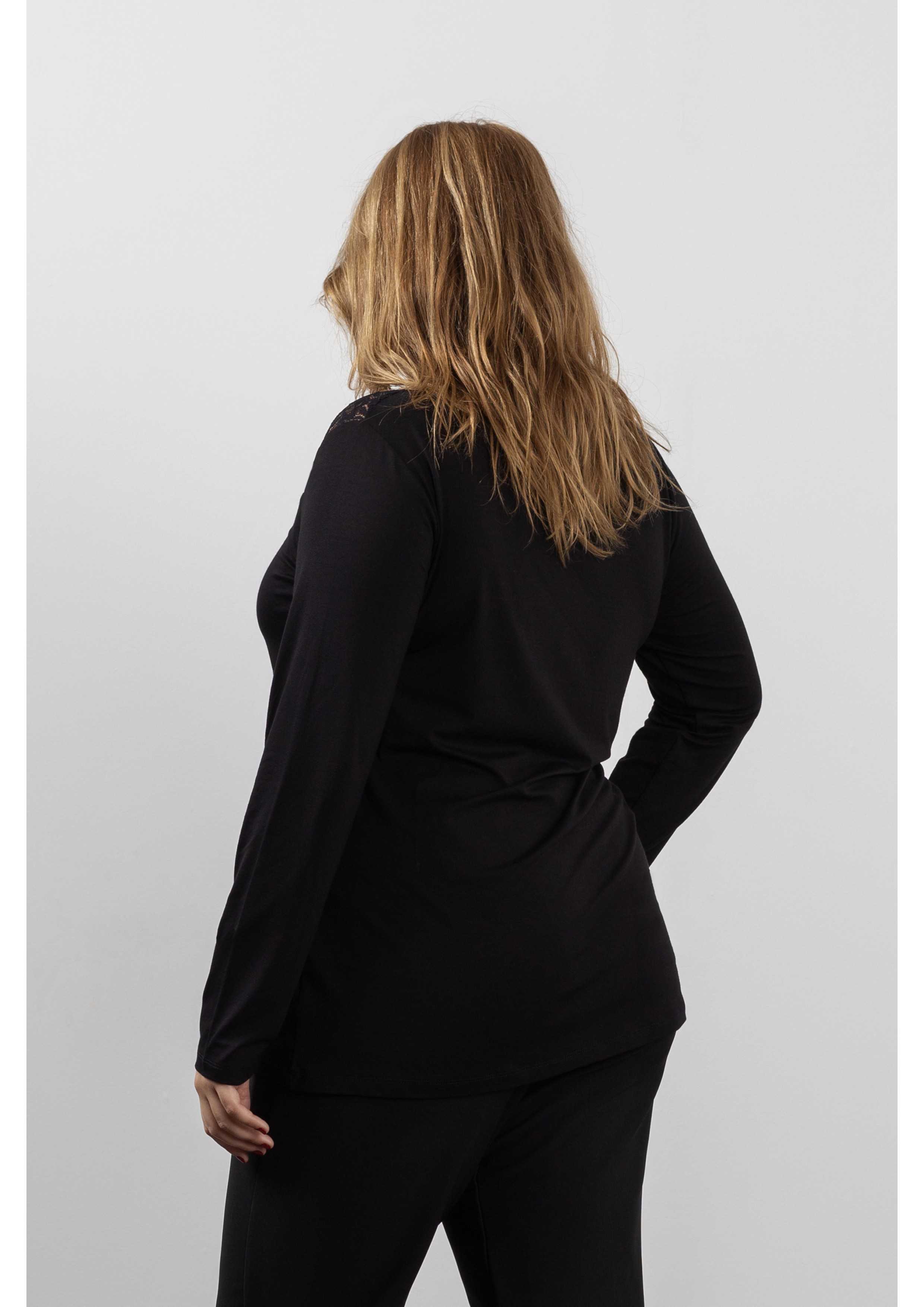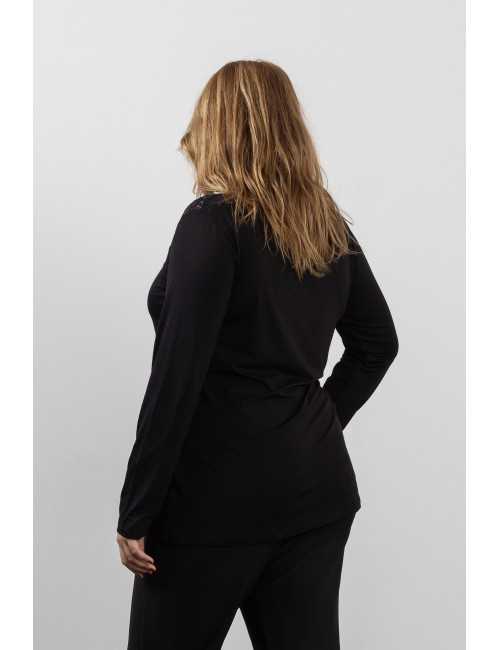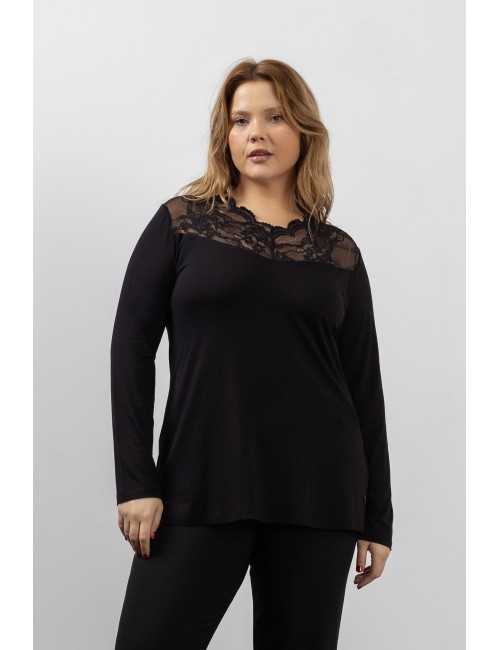 Jersey de punto liso, escapulario en la parte delantera en encaje. Manga larga. Colección: Otoño Invierno Disponible en Tallas Grandes Producto de diseño y fabricación propia. Somos una marca de confección de ropa con más de 50 años de experiencia Modelo: Altura 1.70m y está vistiendo la talla 2XL. Composición: 94%Viscosa 6%Elastano