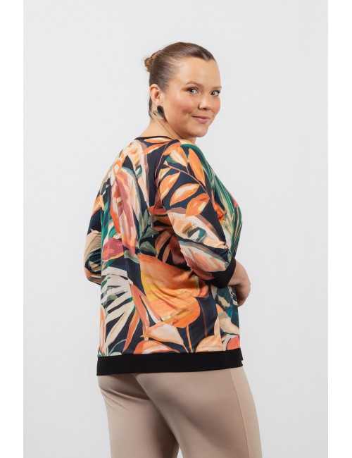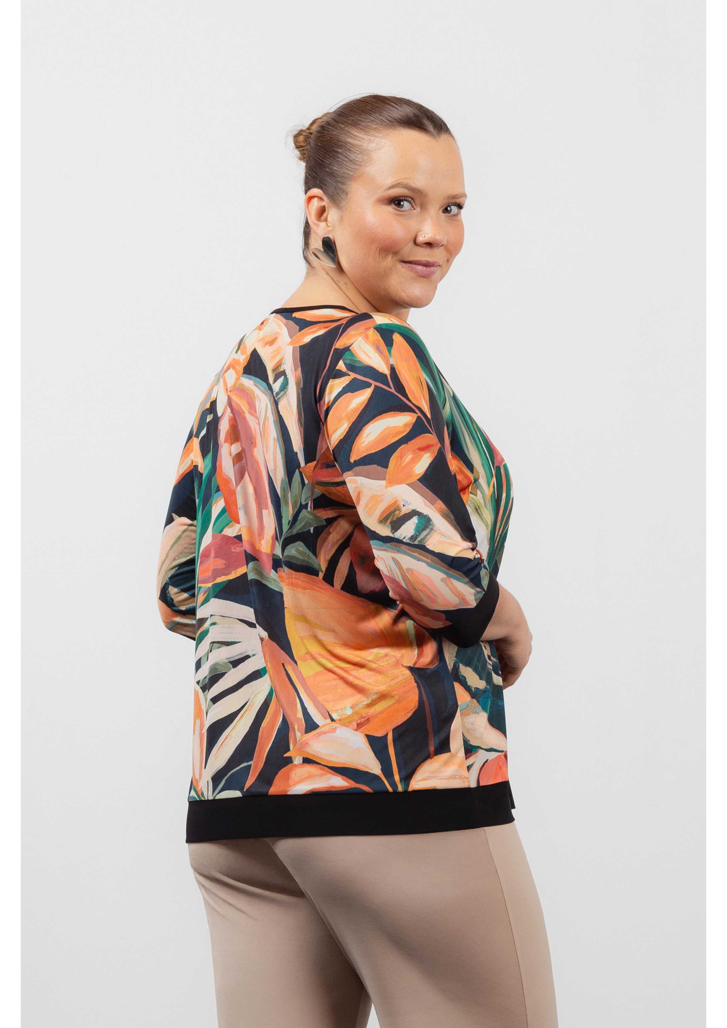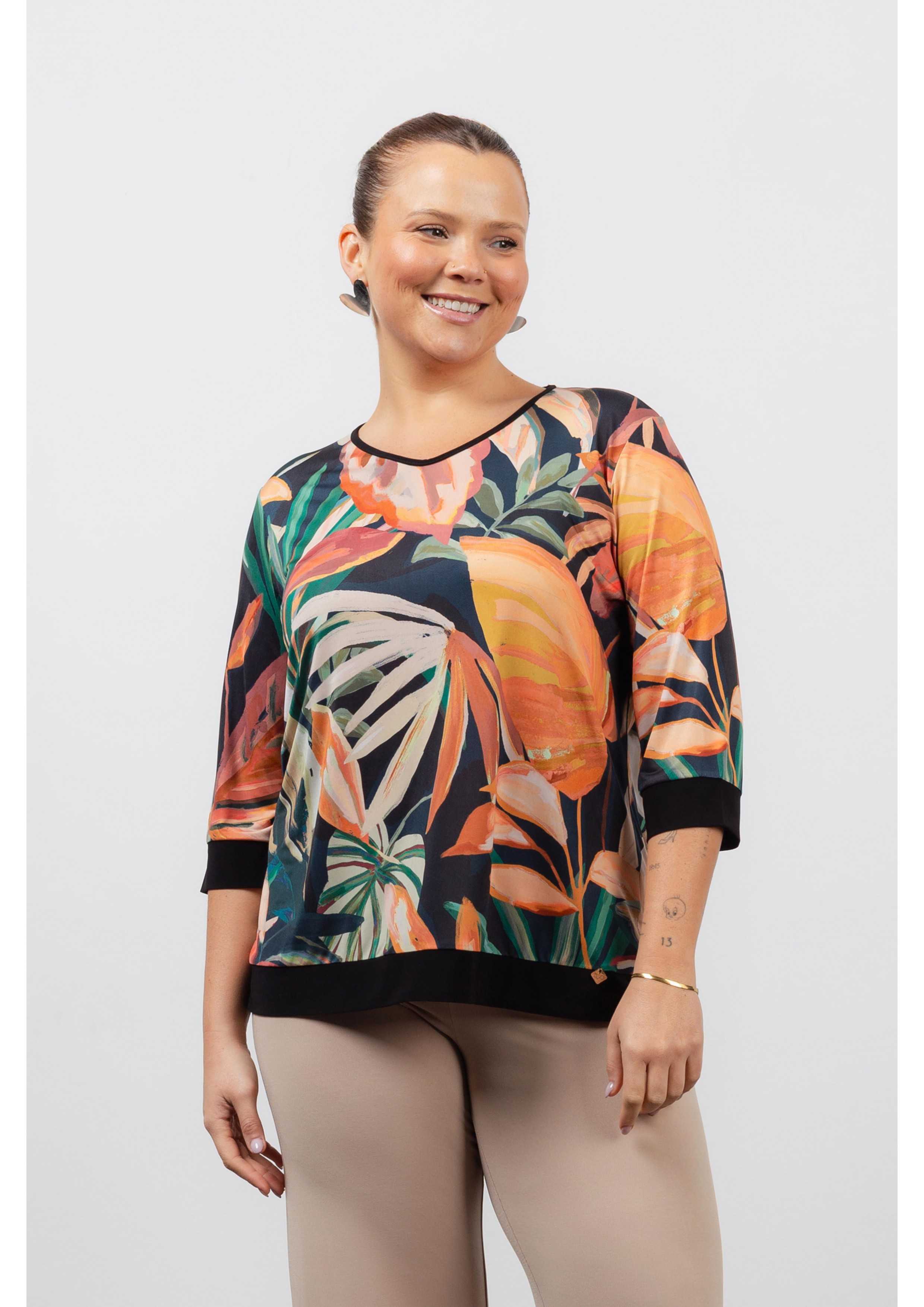Camiseta de punto estampada con manga 3/4 y escote en pico. Colección: Primavera Verano Disponible en Tallas Grandes Producto de diseño y fabricación propia. Somos una marca de confección de ropa con más de 50 años de experiencia Modelo: Altura 1.70m y está usando la talla 2XL. Composición: 95%Poliéster 5%Elastano