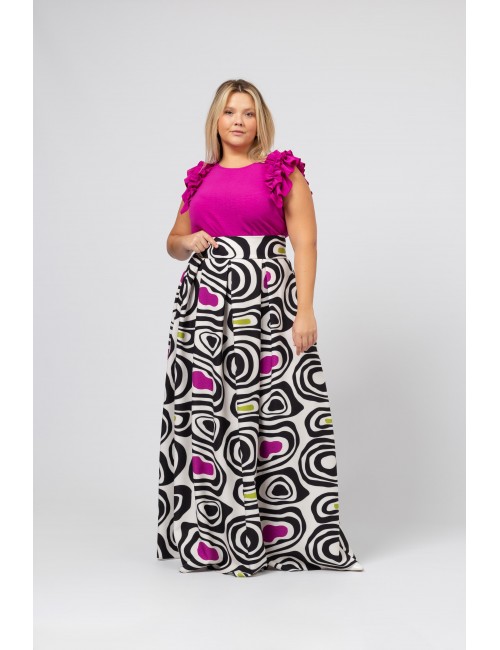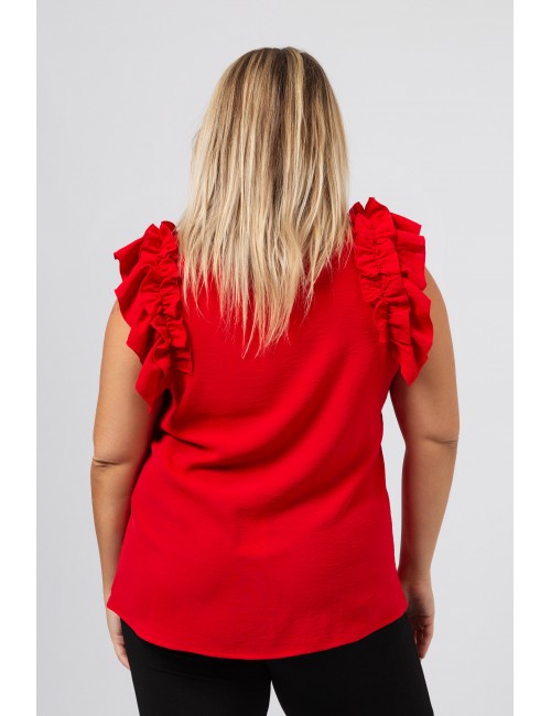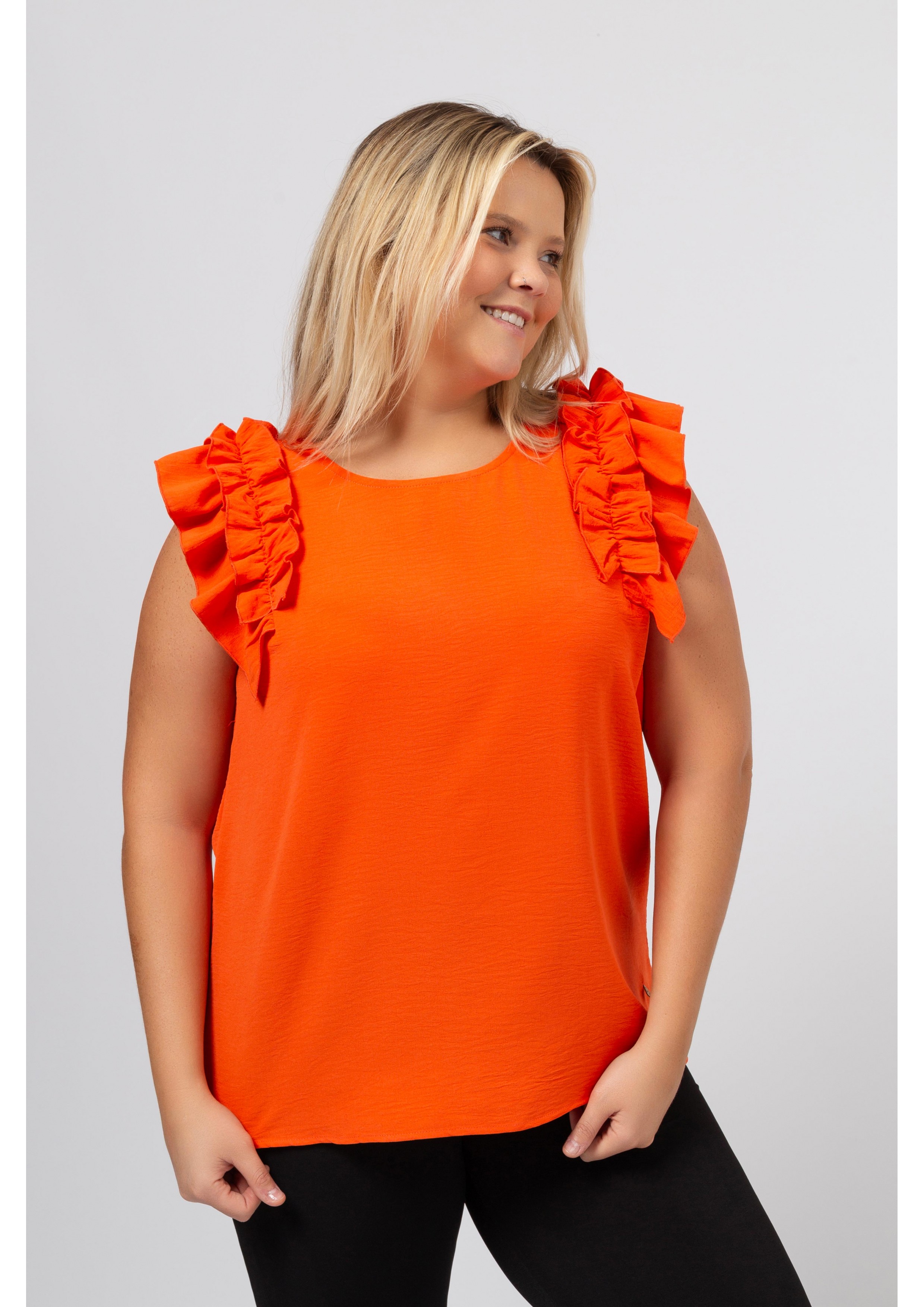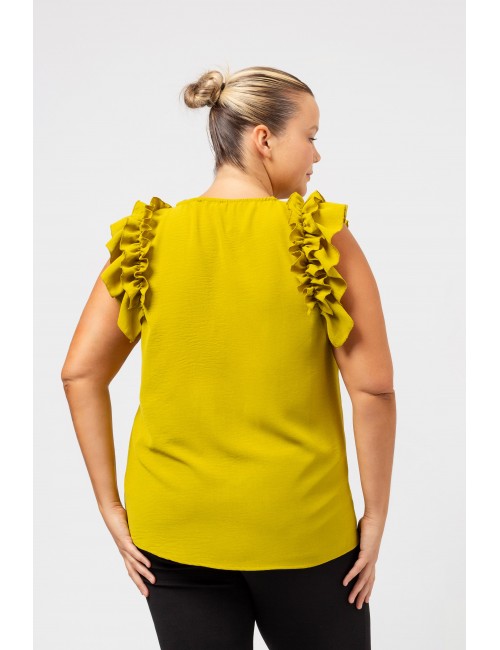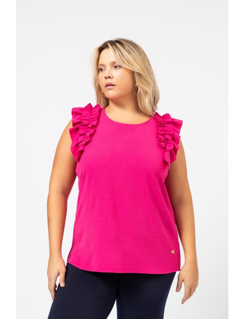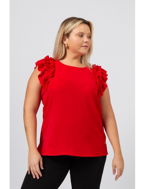 Top de tejido liso con volantes dobles en las mangas y escote redondo. Colección: Primavera Verano Disponible en Tallas Grandes Producto de diseño y fabricación propia. Somos una marca de confección de ropa con más de 50 años de experiencia Modelo: Altura 1.70m y está usando la talla 2XL. Composición: 100%Poliéster