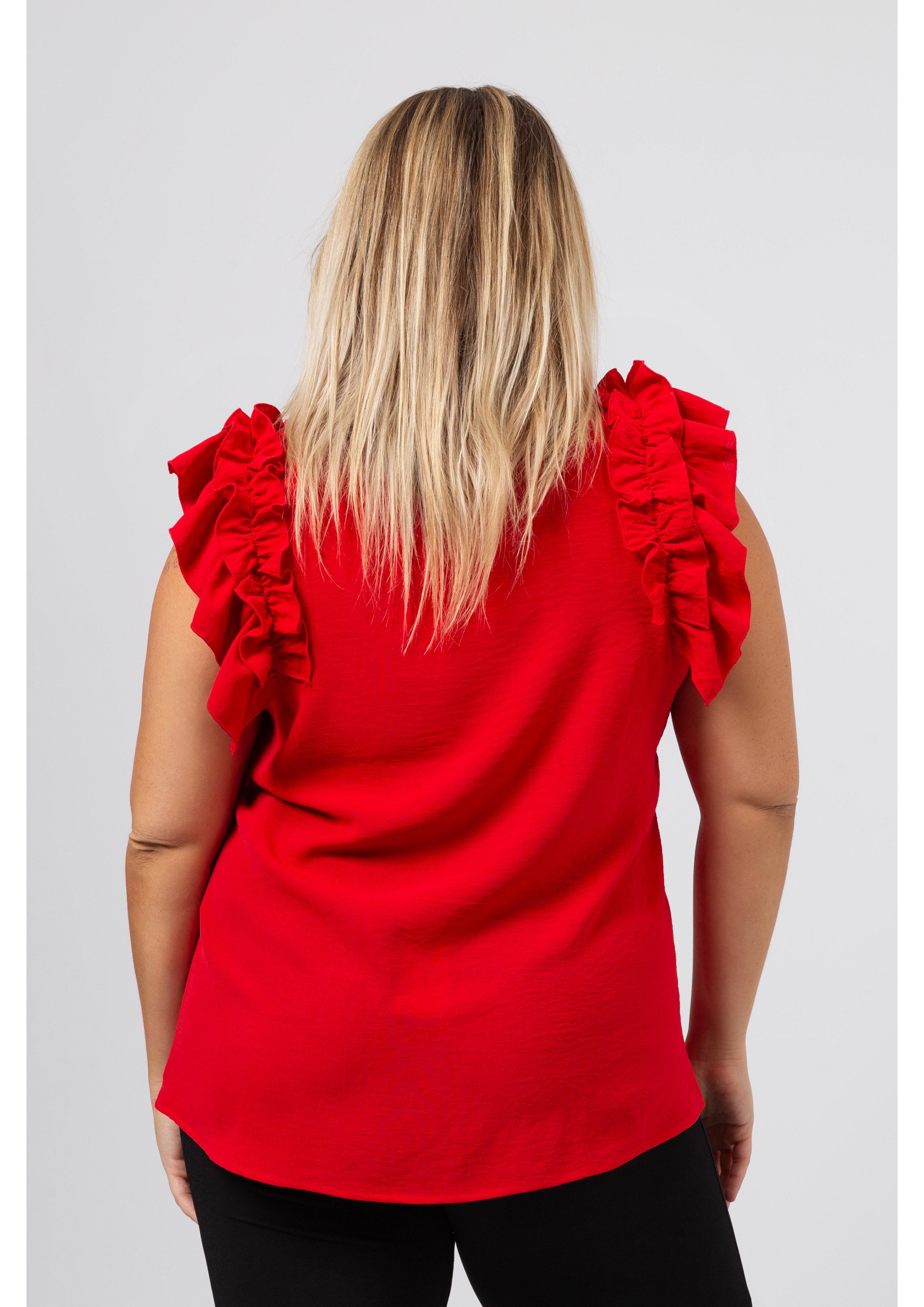 Top de tejido liso con volantes dobles en las mangas y escote redondo. Colección: Primavera Verano Modelo: Altura 1.70m y está usando la talla 2XL.