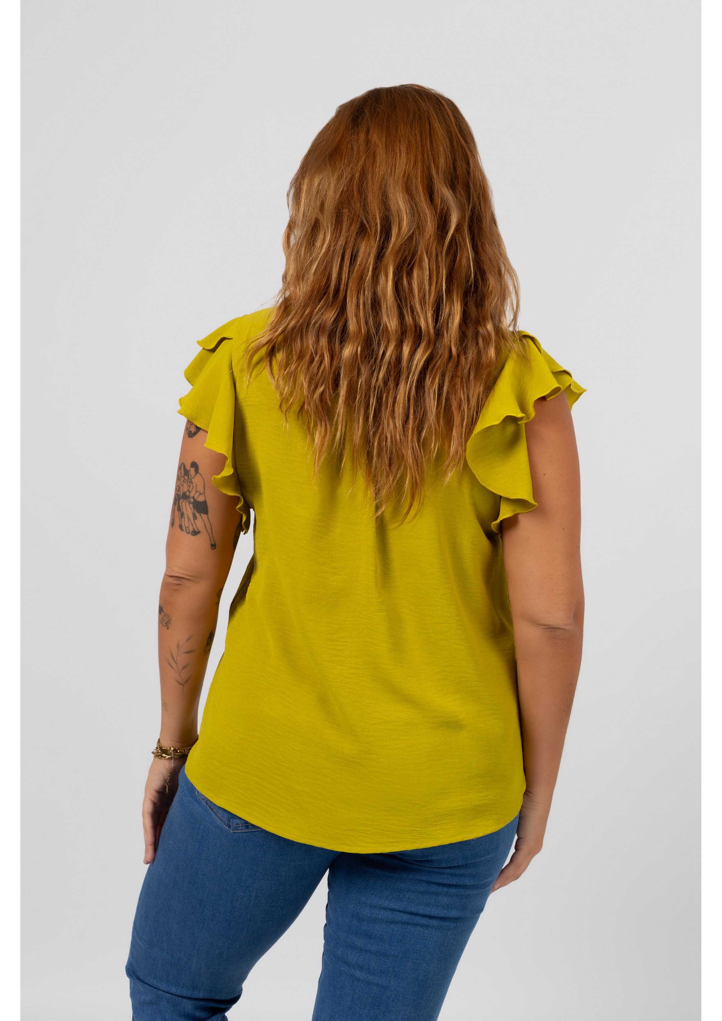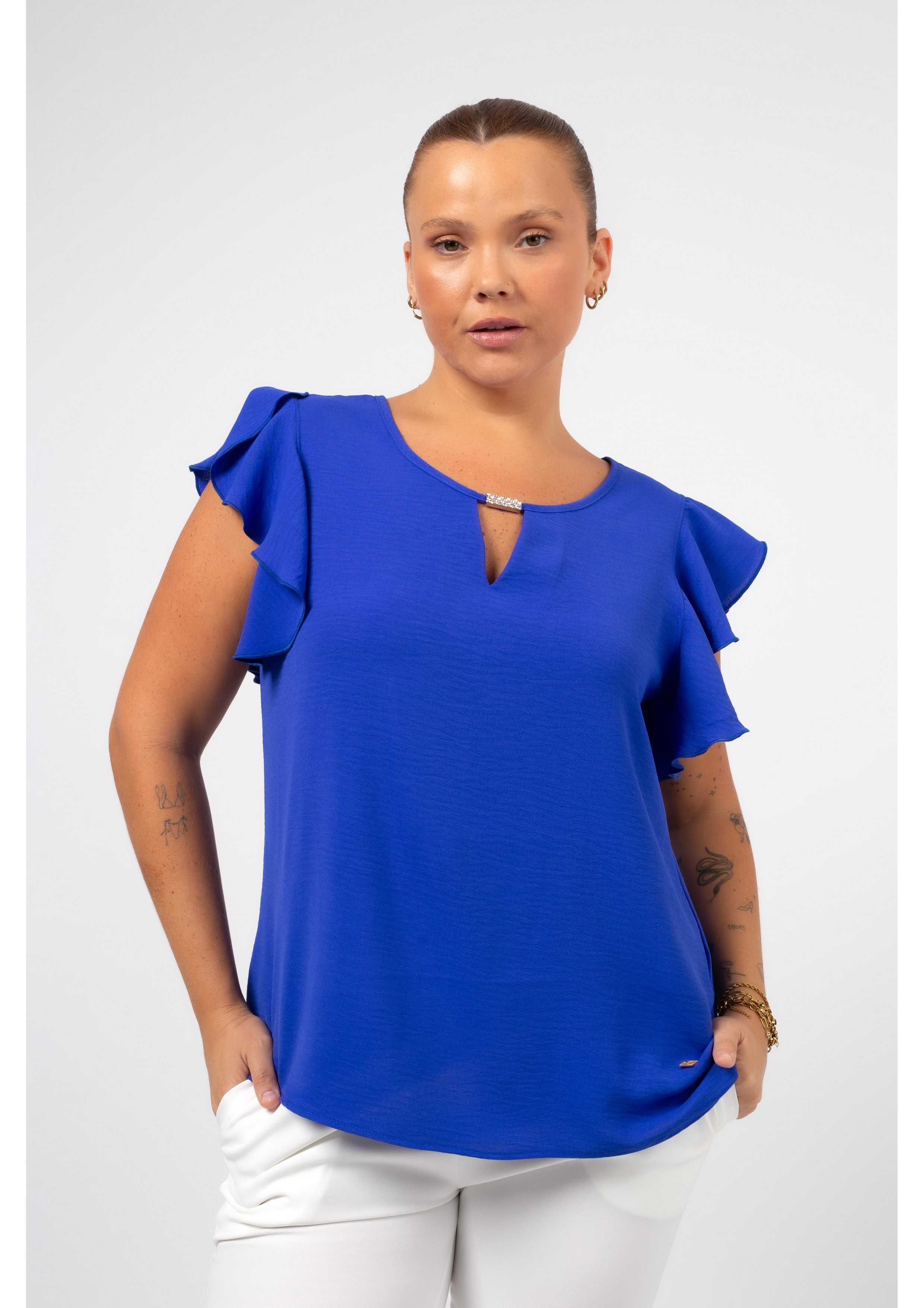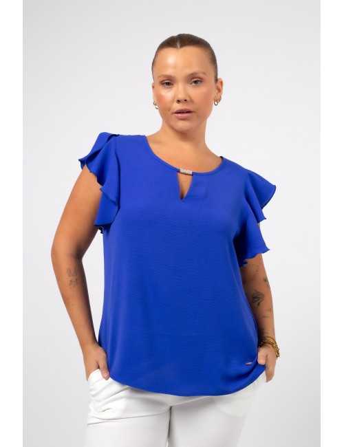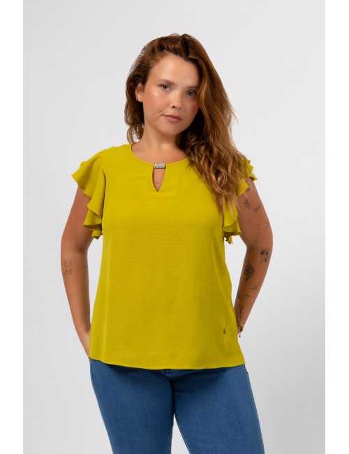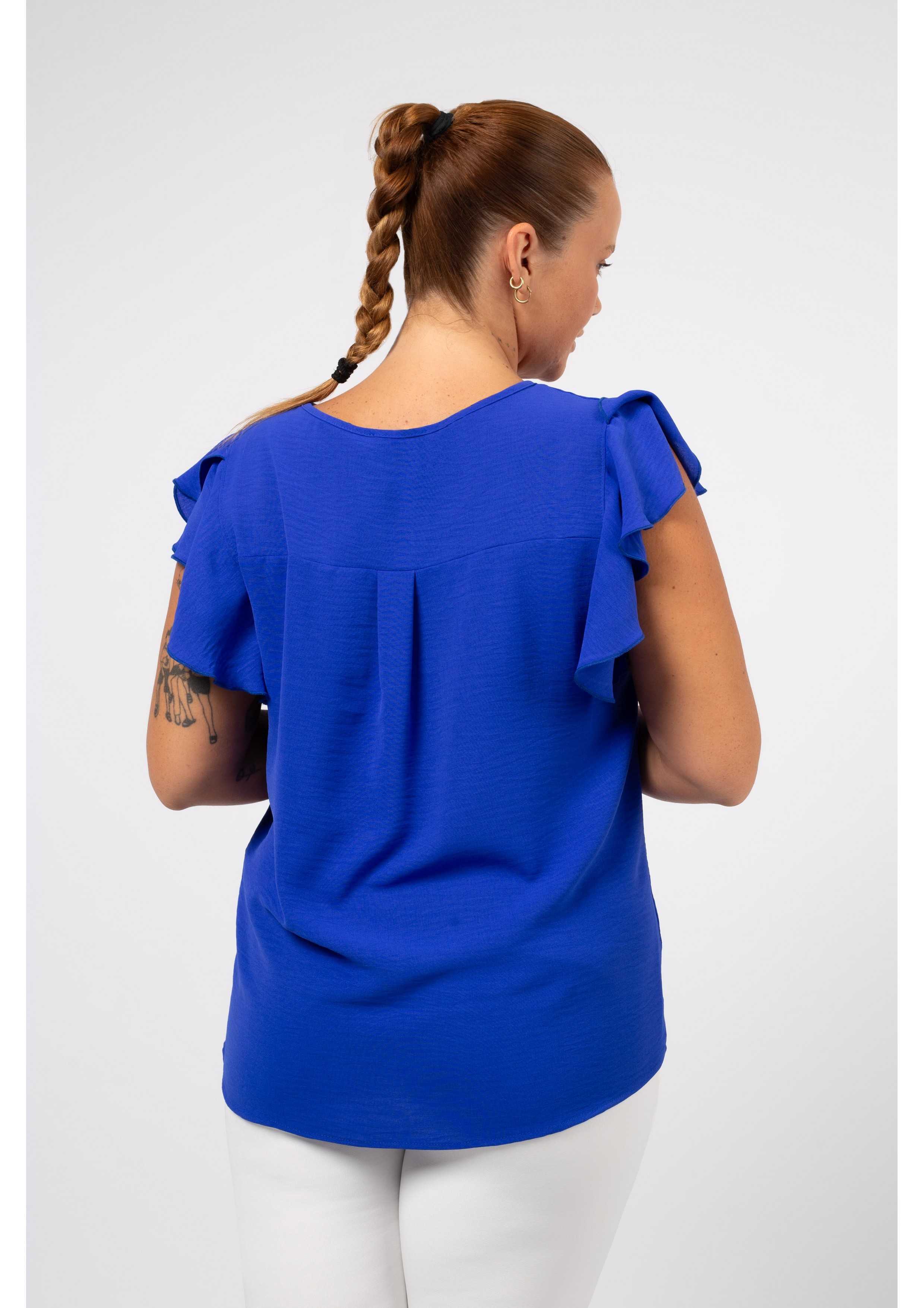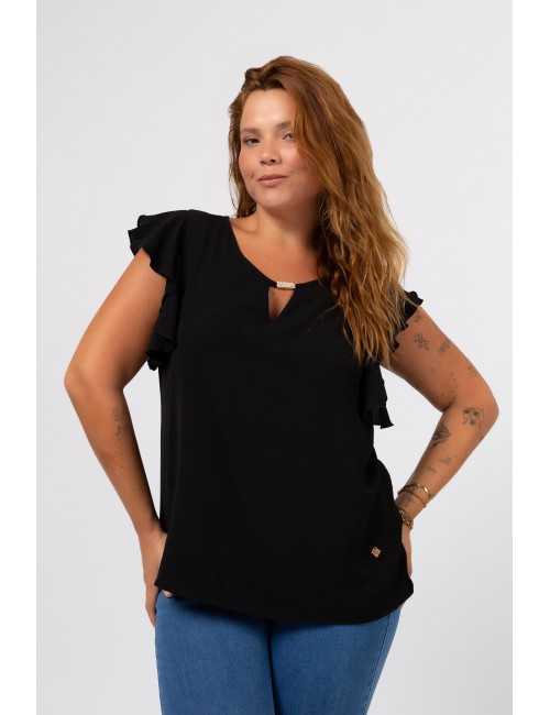 Top de tejido liso, volantes en las sisas, escote redondo con tapeta cerrada con aplicación en metal, escapulario en la espalda. Colección: Primavera Verano Disponible en Tallas Grandes Producto de diseño y fabricación propia. Somos una marca de confección de ropa con más de 50 años de experiencia Modelo: Altura 1.70m y está vistiendo la talla XL. Composición: 100%Poliéster