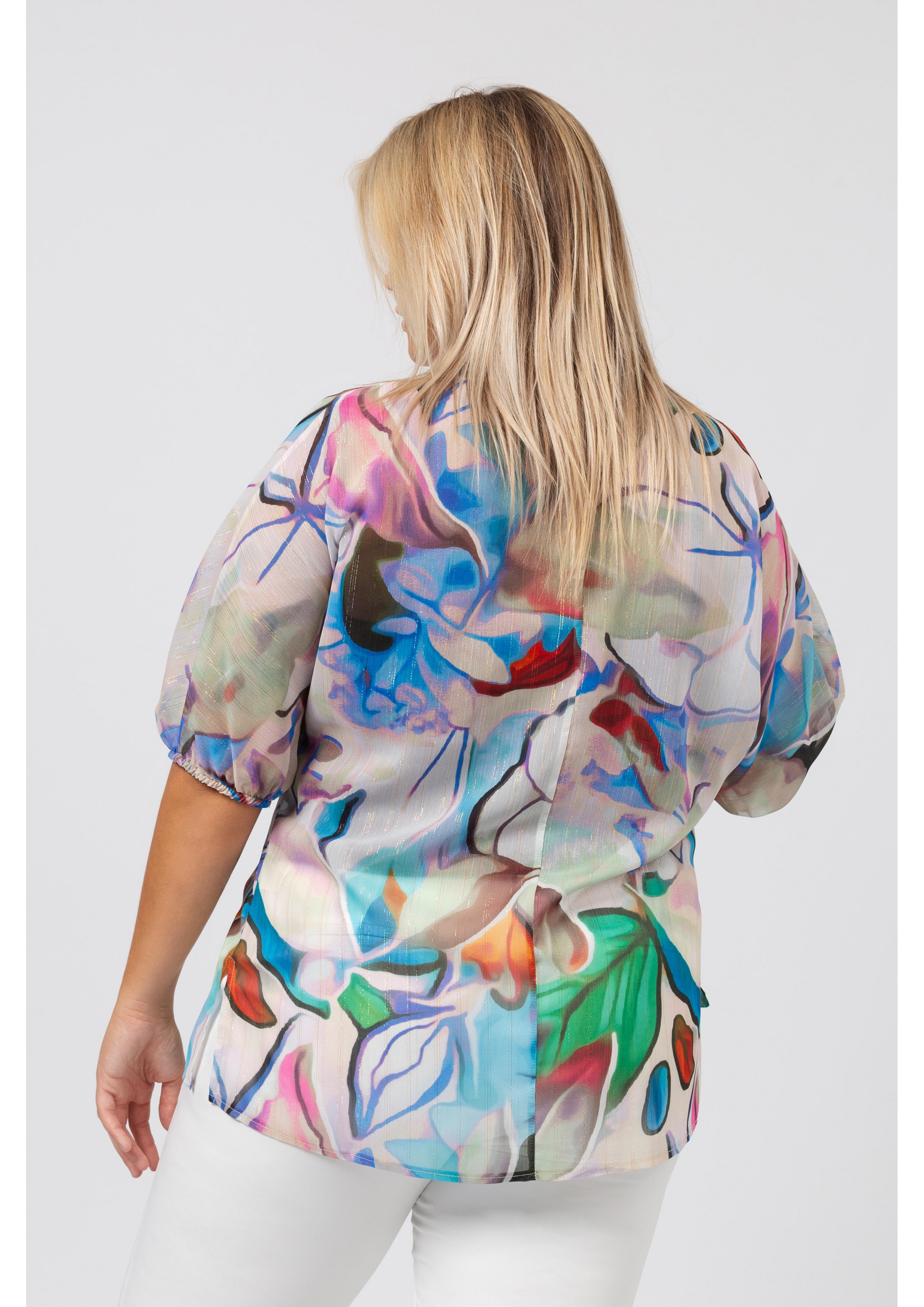 Túnica en tejido estampado con detalles en lurex, manga murciélago con elástico. Top interior suelto. Colección: Primavera Verano Disponible en Tallas Grandes Producto de diseño y fabricación propia. Somos una marca de confección de ropa con más de 50 años de experiencia. Modelo: Altura 1.70m y está vistiendo la talla 2XL. Composición: 98%Poliéster 6%Elastano | Forro: 94%Poliéster 6%Elastano