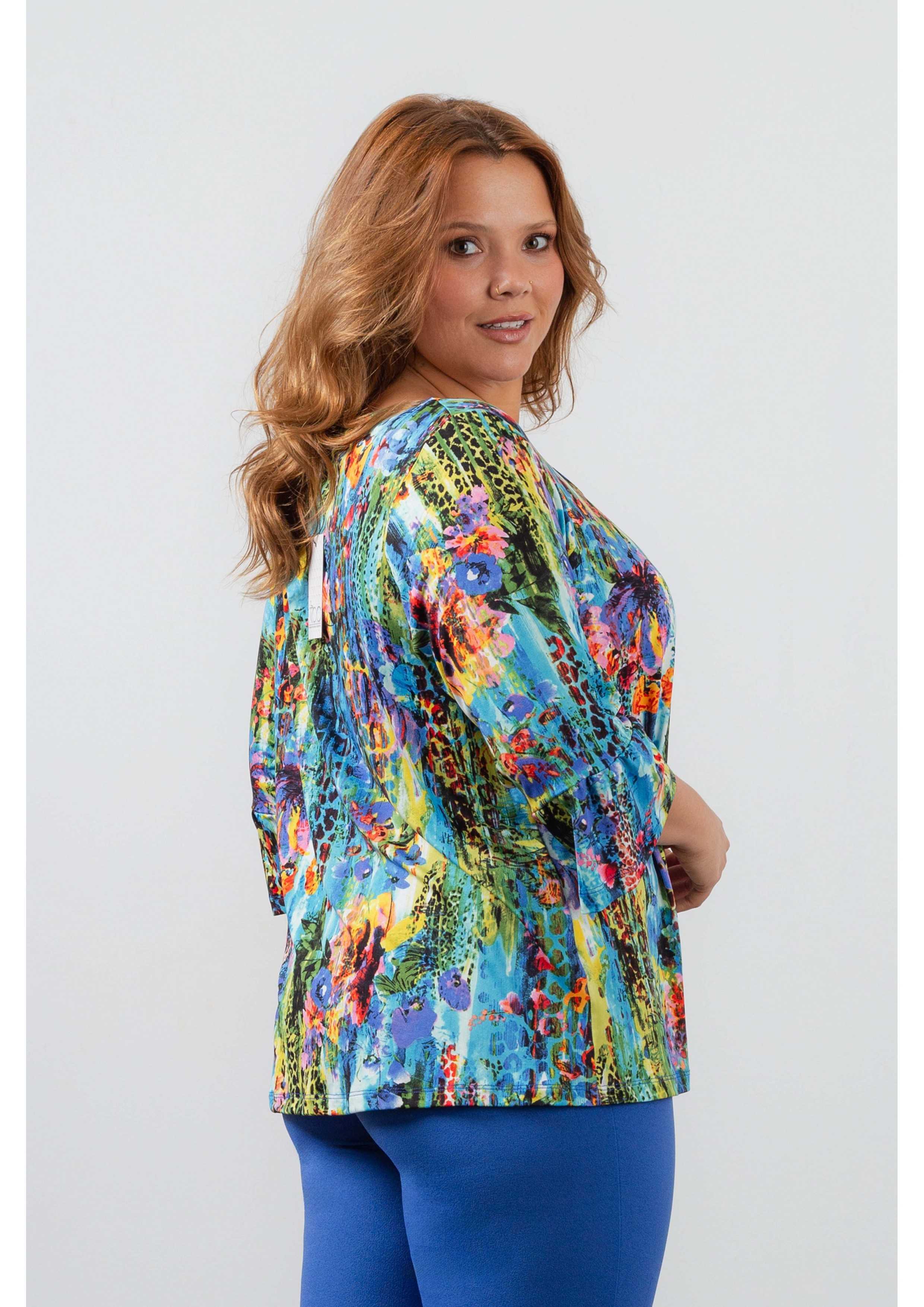 Túnica de malla estampada, manga 3/4 con volantes, escote redondo con ligera fruncido en el centro del frente. Colección: Primavera Verano Disponible en Tallas Grandes Producto de diseño y fabricación propia. Somos una marca de confección de ropa con más de 50 años de experiencia Modelo: Altura 1.70m y está vistiendo la talla 2XL.