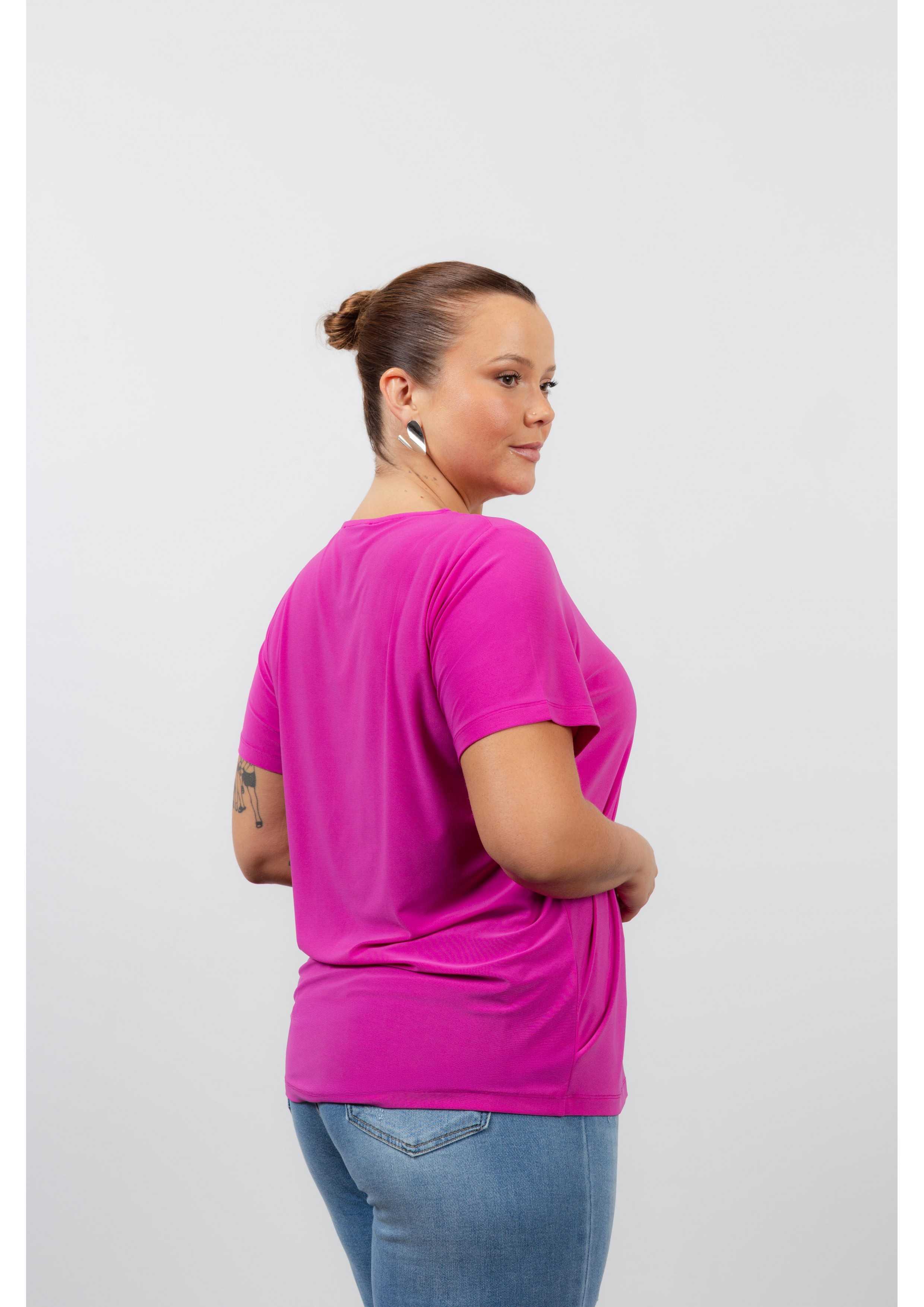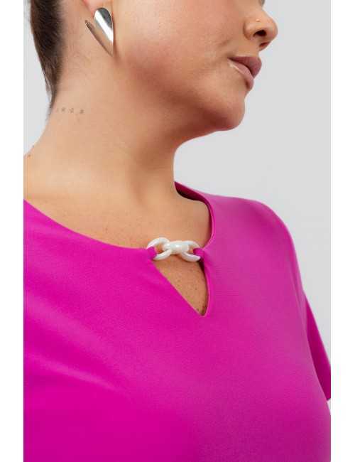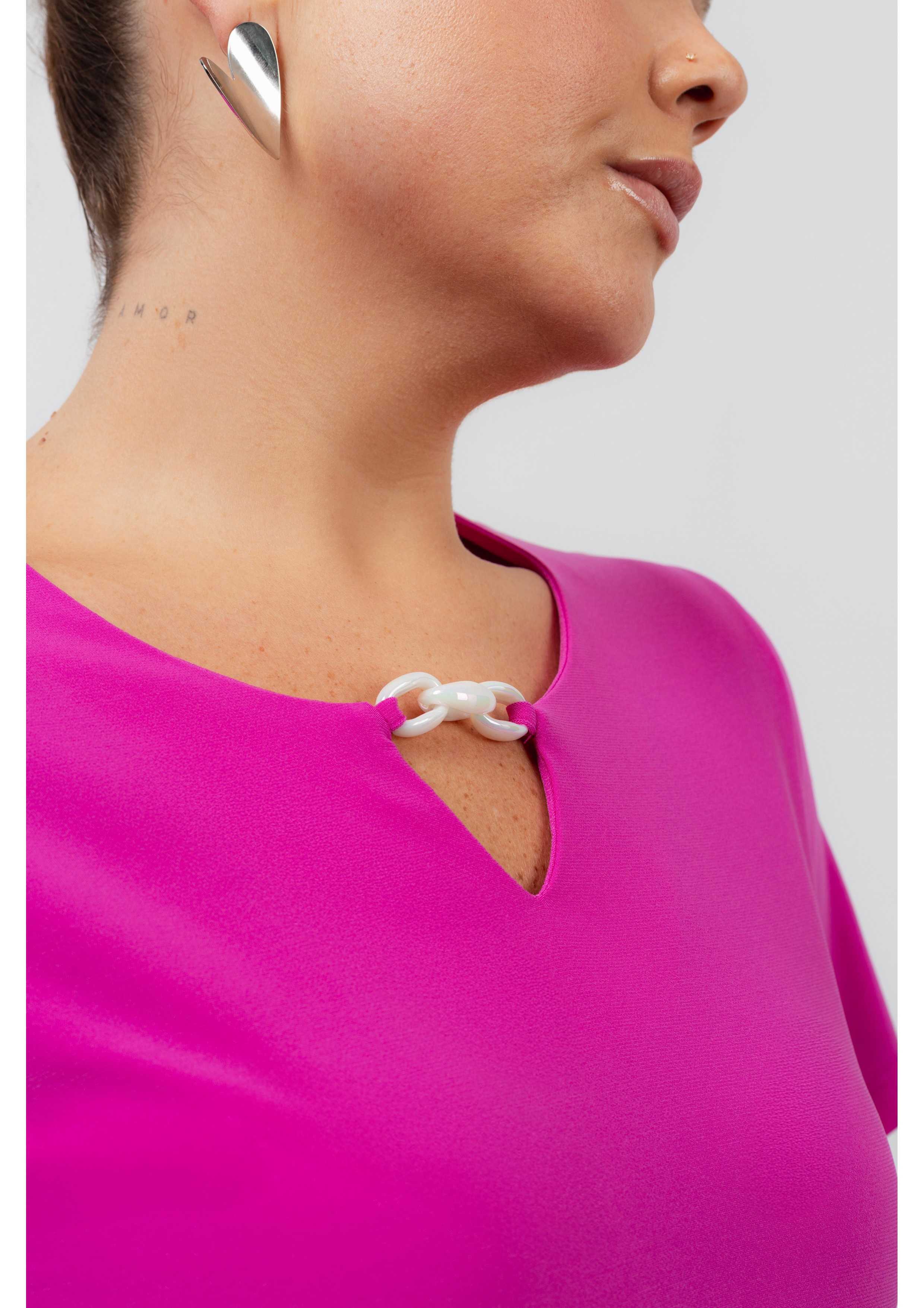 Túnica de punto liso con manga 3/4, escote redondo con aplique de cadena de plástico madreperla. Colección: Primavera Verano Modelo: Altura 1.70m y está usando la talla 2XL
