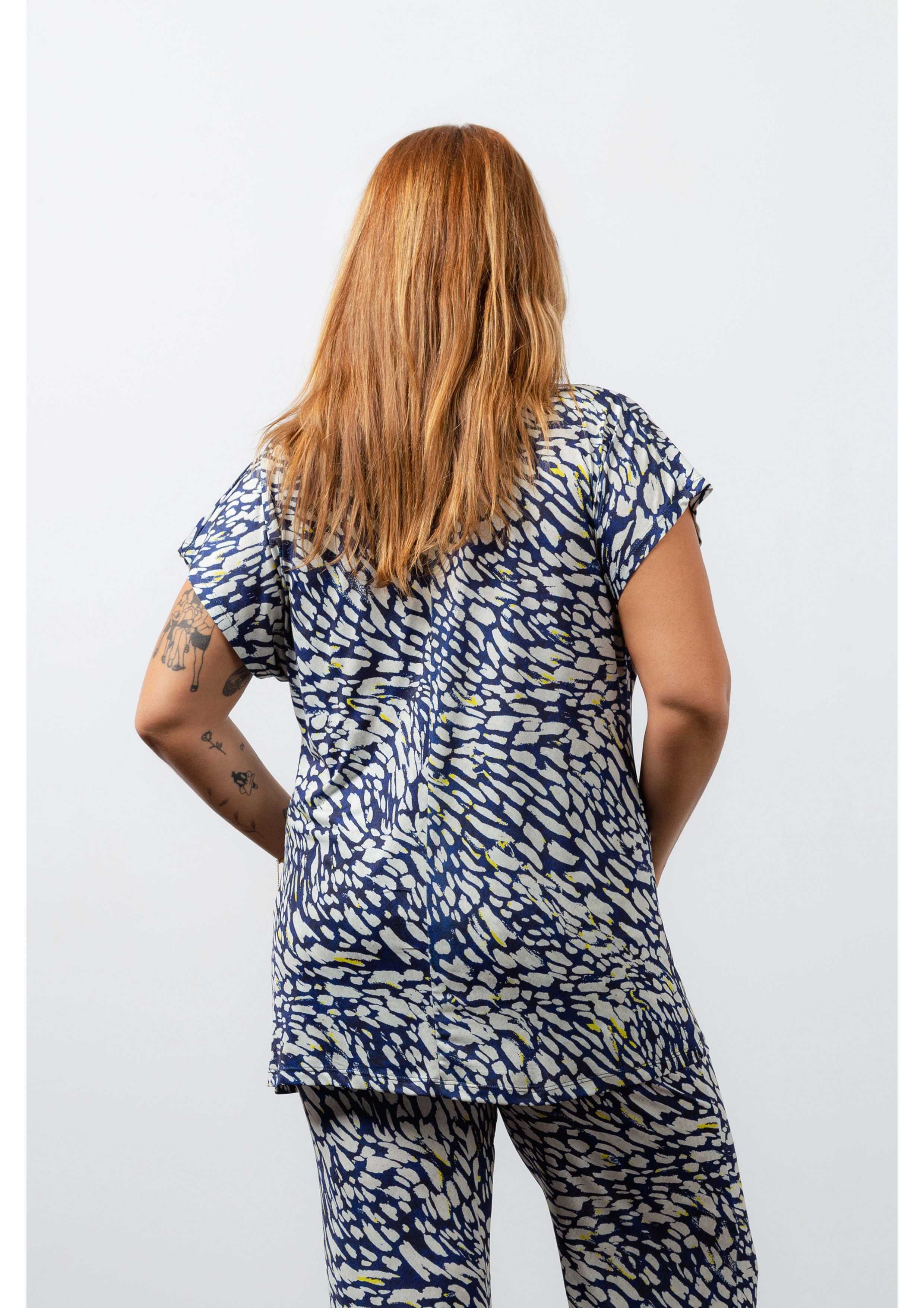 Túnica de malha estampada, escote drapeado. Corte recto. Colección: Primavera Verano Disponible en Tallas Grandes Producto de diseño y fabricación propia. Somos una marca de confección de prendas con más de 50 años de experiencia Modelo: Altura 1.70m y está vistiendo la talla XL. Composición: 95%Poliéster 5%Elastano