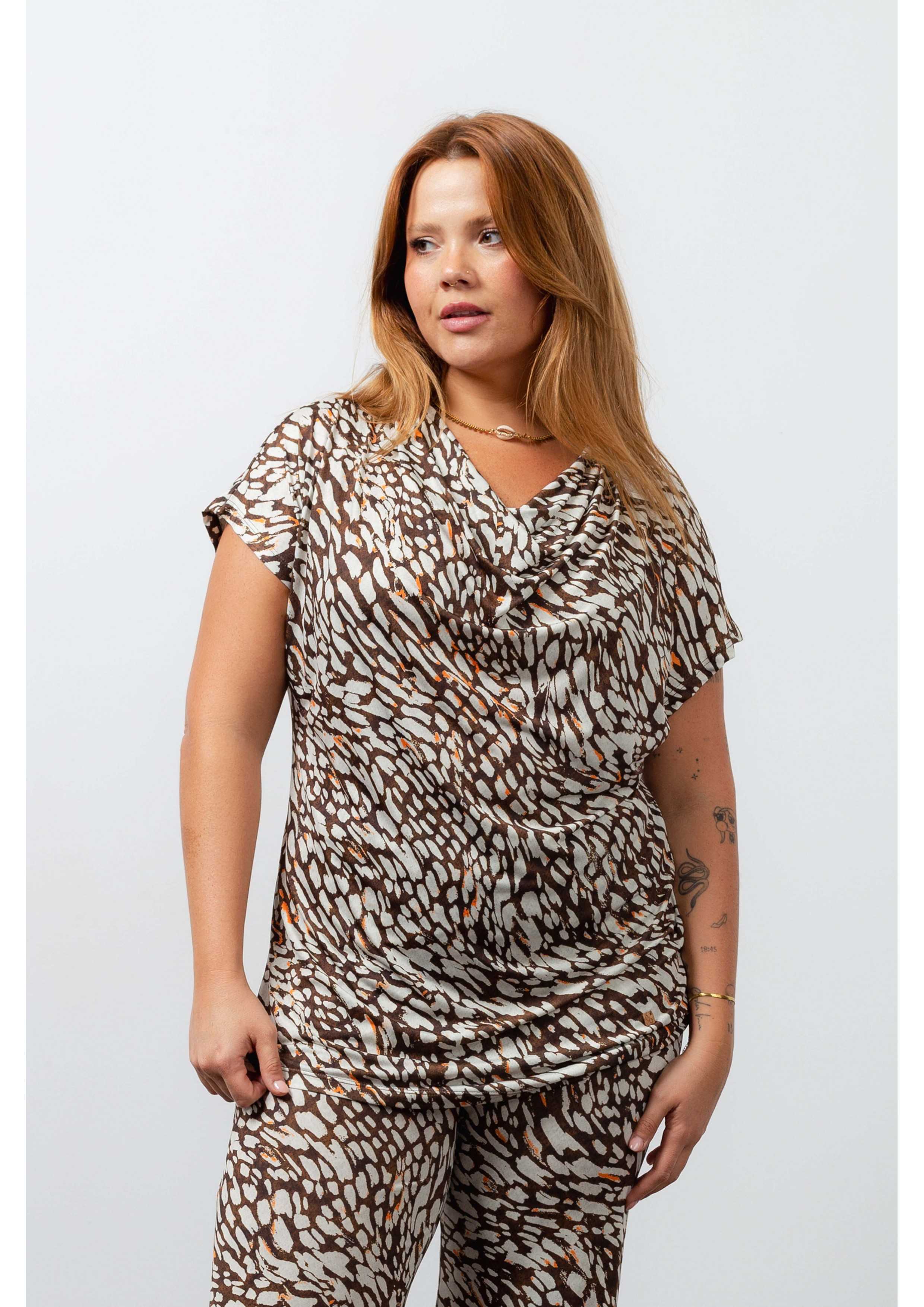 Túnica de malha estampada, escote drapeado. Corte recto. Colección: Primavera Verano Modelo: Altura 1.70m y está vistiendo la talla XL.