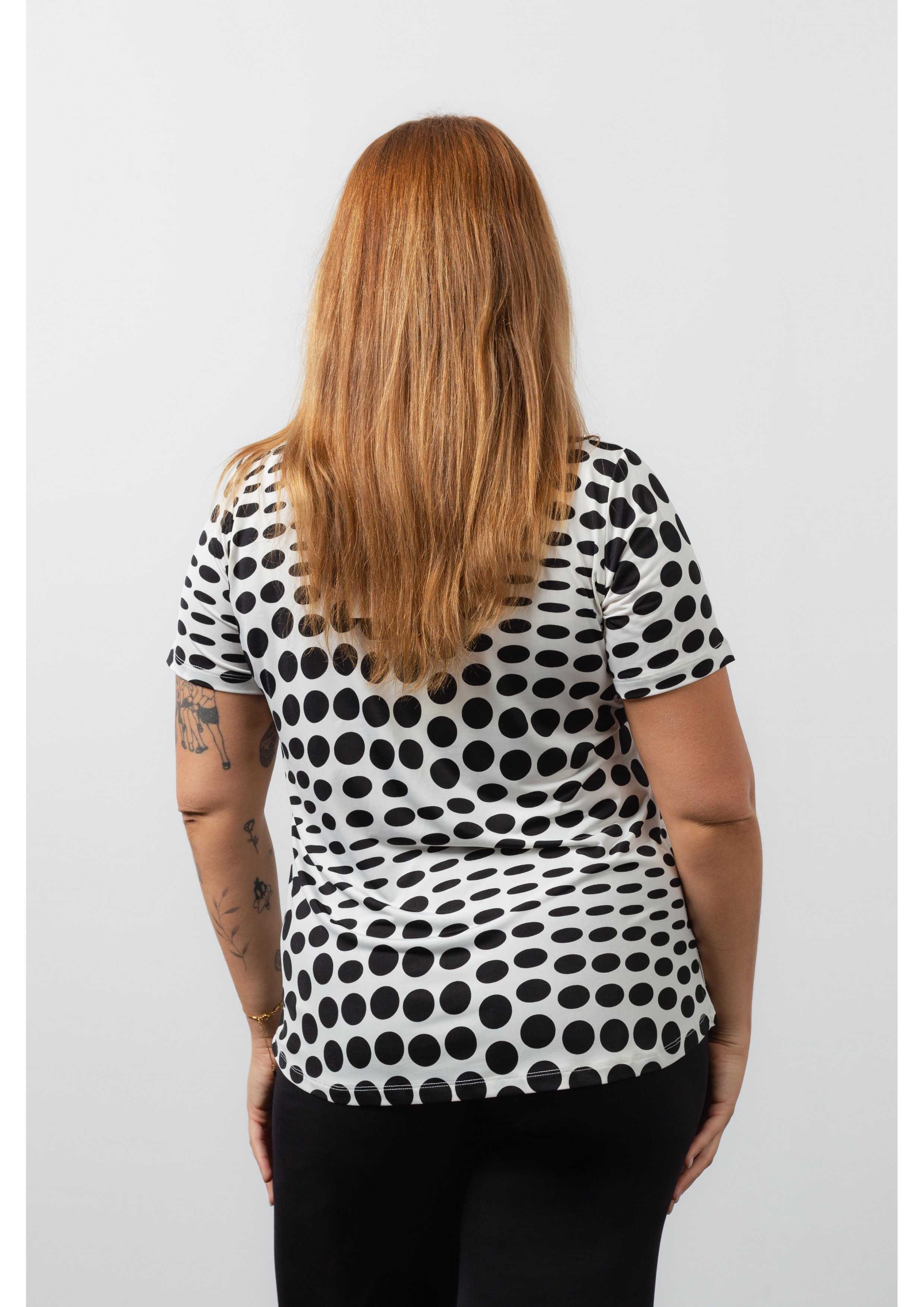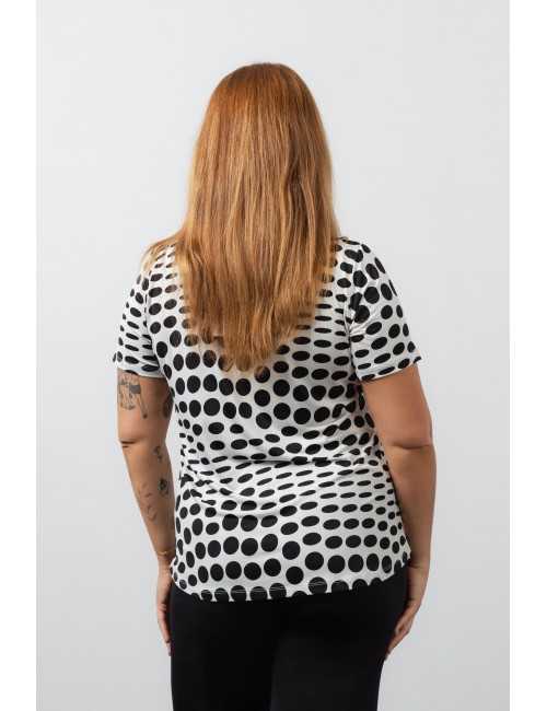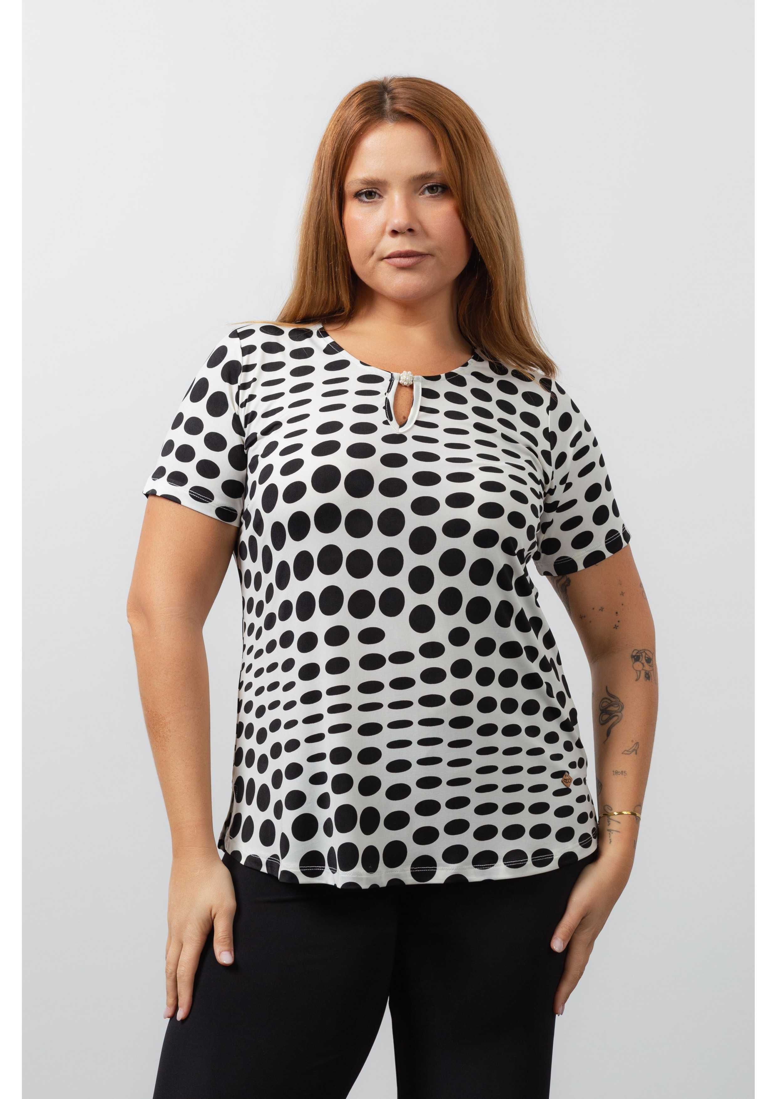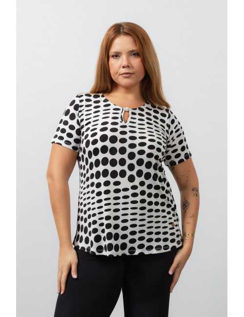 Túnica de malla estampada, bolas, manga corta, escote redondo con lágrima y aplique en la parte delantera. Aberturas laterales. Colección: Primavera Verano Disponible en Tallas Grandes Producto de diseño y fabricación propia. Somos una marca de confección de prendas con más de 50 años de experiencia Modelo: Altura 1.70m y está usando la talla XL. Composición: 94%Poliéster 6%Elastano