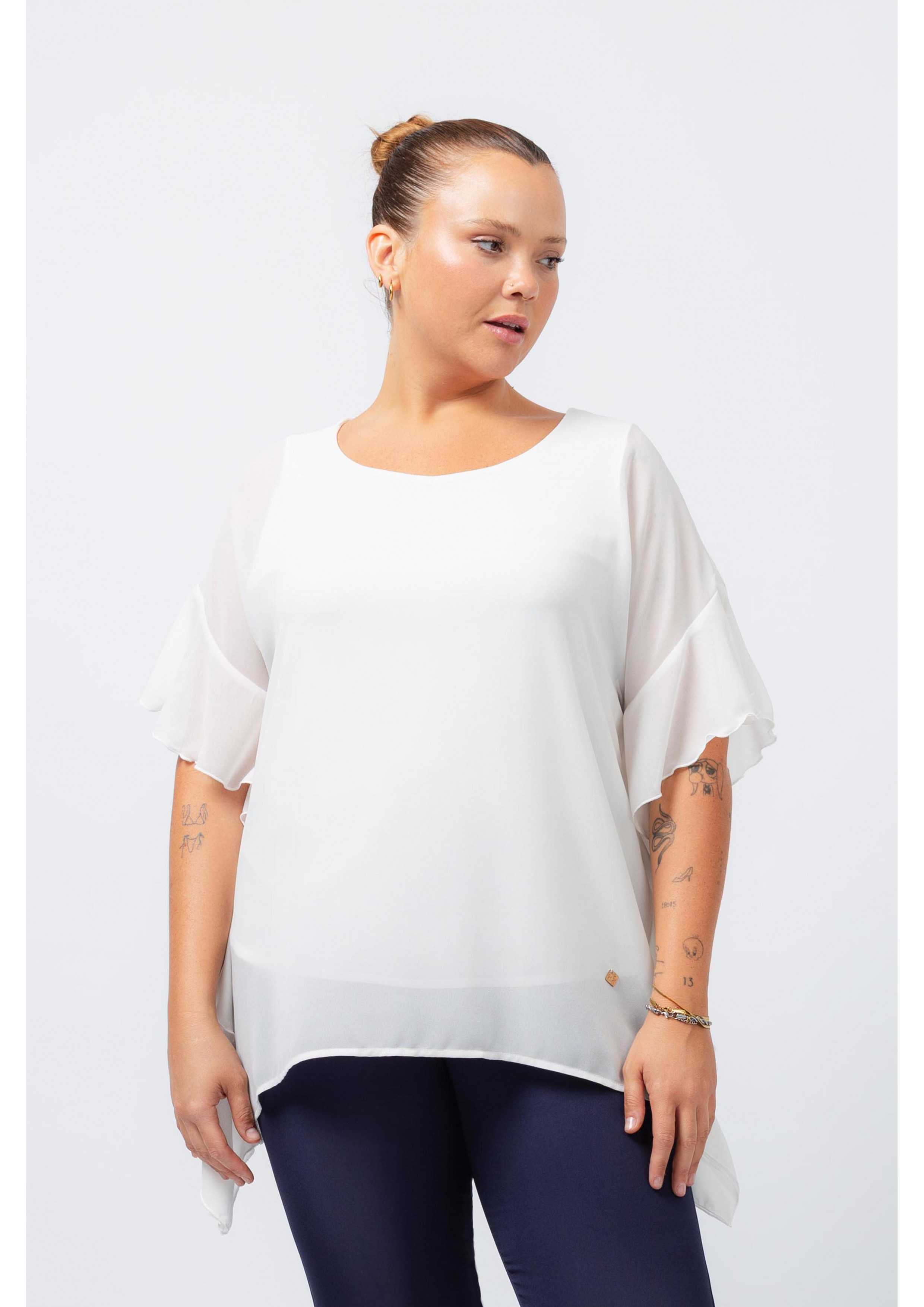Túnica en tejido liso, fino, prenda forrada, volantes en los laterales con acabados en rollo, escote redondo. Colección: Primavera Verano Modelo: Altura 1.70m y está usando la talla XL.