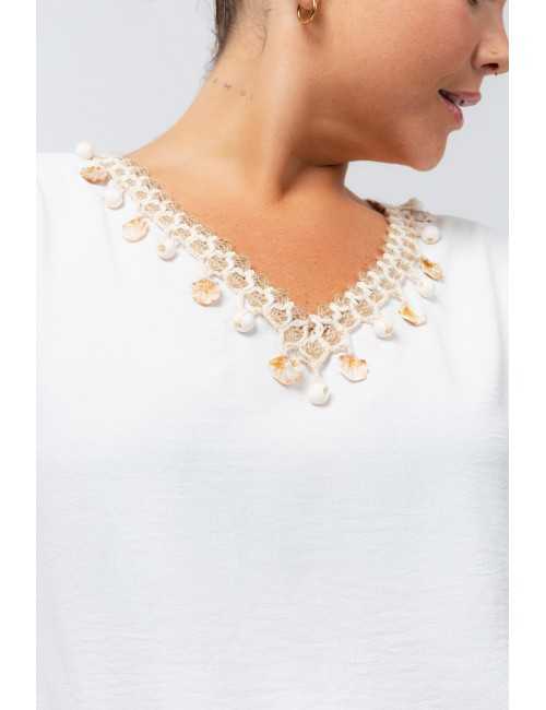 Túnica en tejido liso, hombros anchos. Escote en pico con aplicación de flecos motivos de playa. Colección: Primavera Verano Modelo: Altura 1.70m y está vistiendo la talla XL.