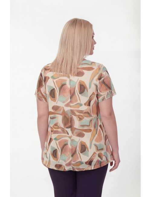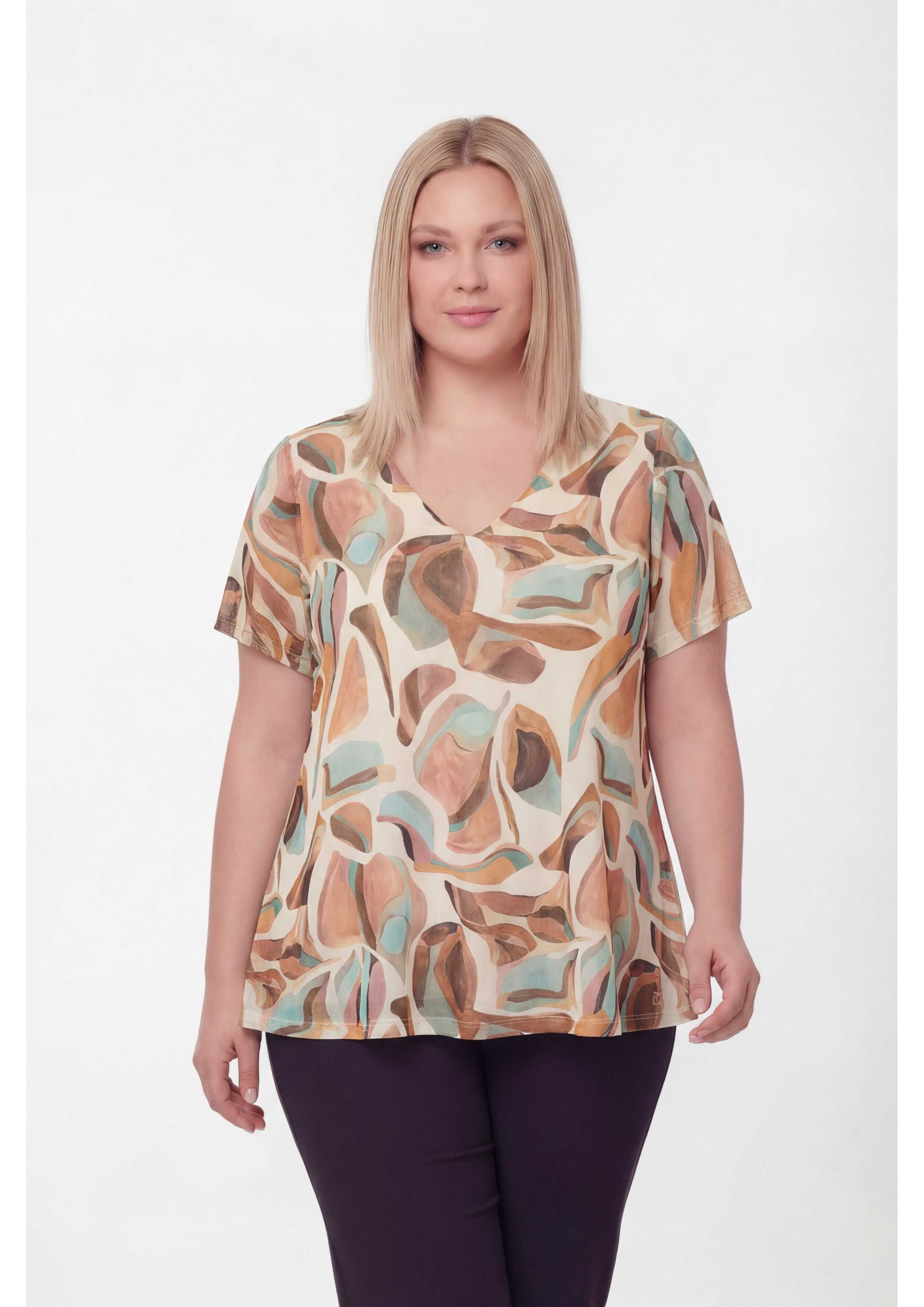 Túnica de punto resil estampada, tonos camel, manga corta, escote en pico. Corte en la espalda, modelo evasé. Prenda forrada.