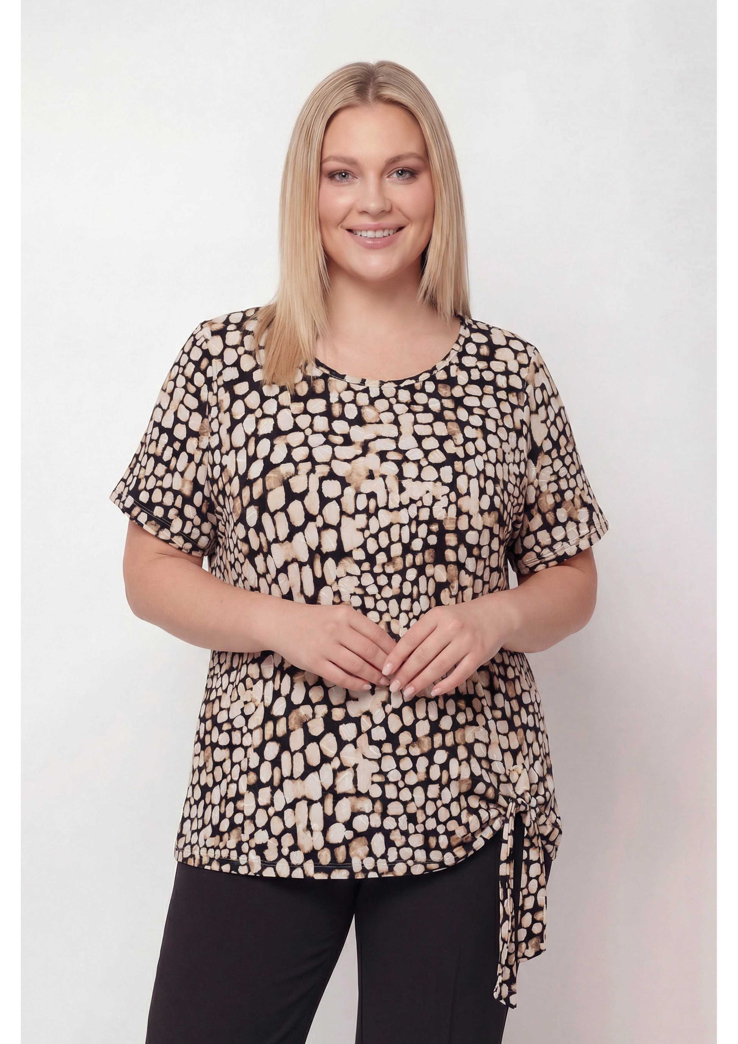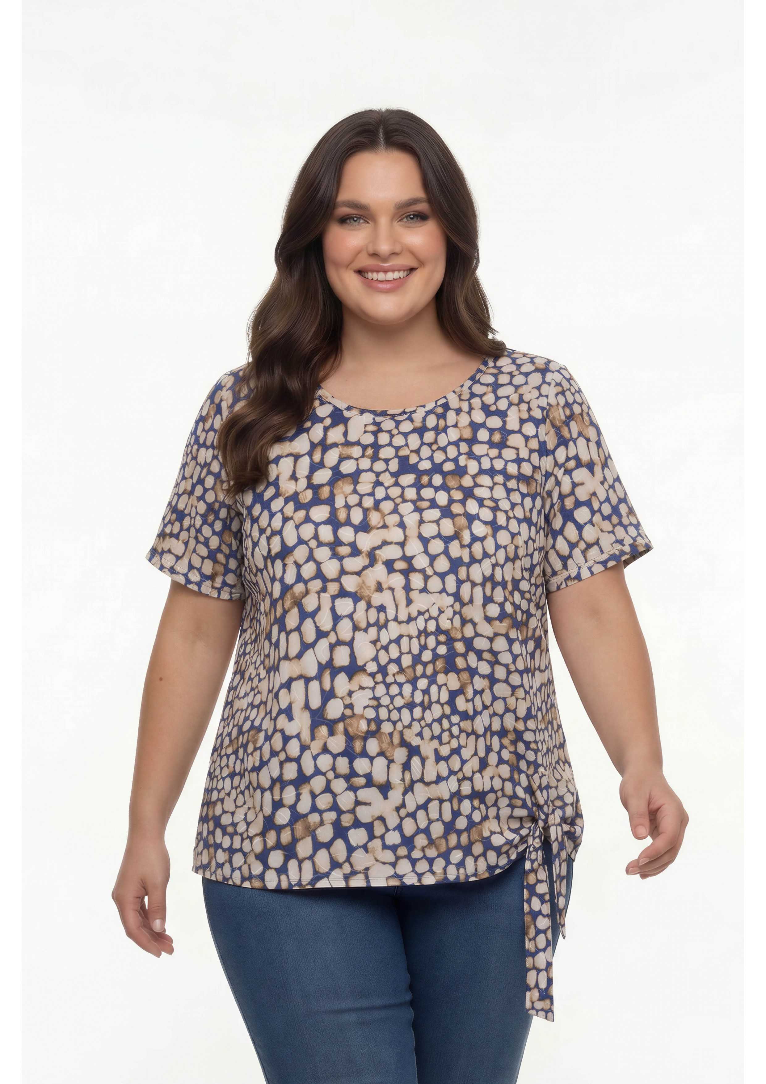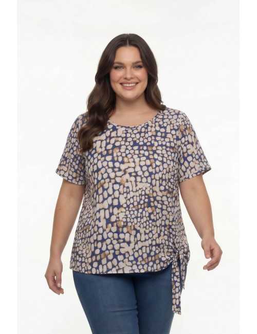 Túnica de punto estampada, escote redondo, manga corta. Lateral izquierda con tira para hacer lazo.
