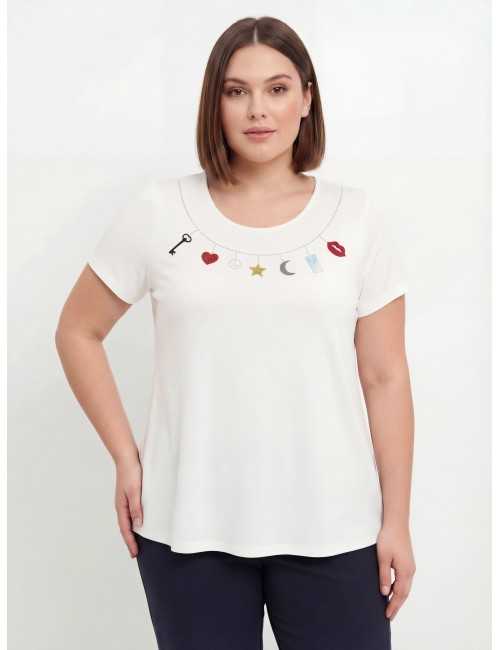 Túnica de tela lisa, estampado en el cuello delantero, manga corta. Modelo evasé. Colección: Otoño Invierno Modelo: Altura 1.70m y está usando la talla 2XL.
