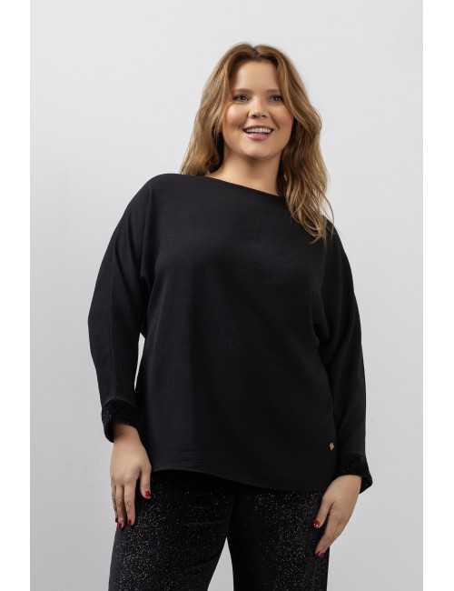Túnica de tejido liso, escote y puños en malla de terciopelo con hilo lurex. Corte en la espalda. Manga murciélago. Colección: Otoño Invierno Modelo: Altura 1.70m y está usando la talla 2XL.