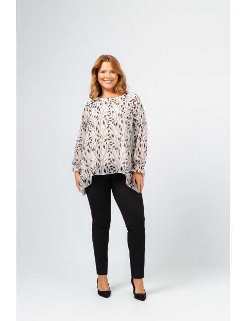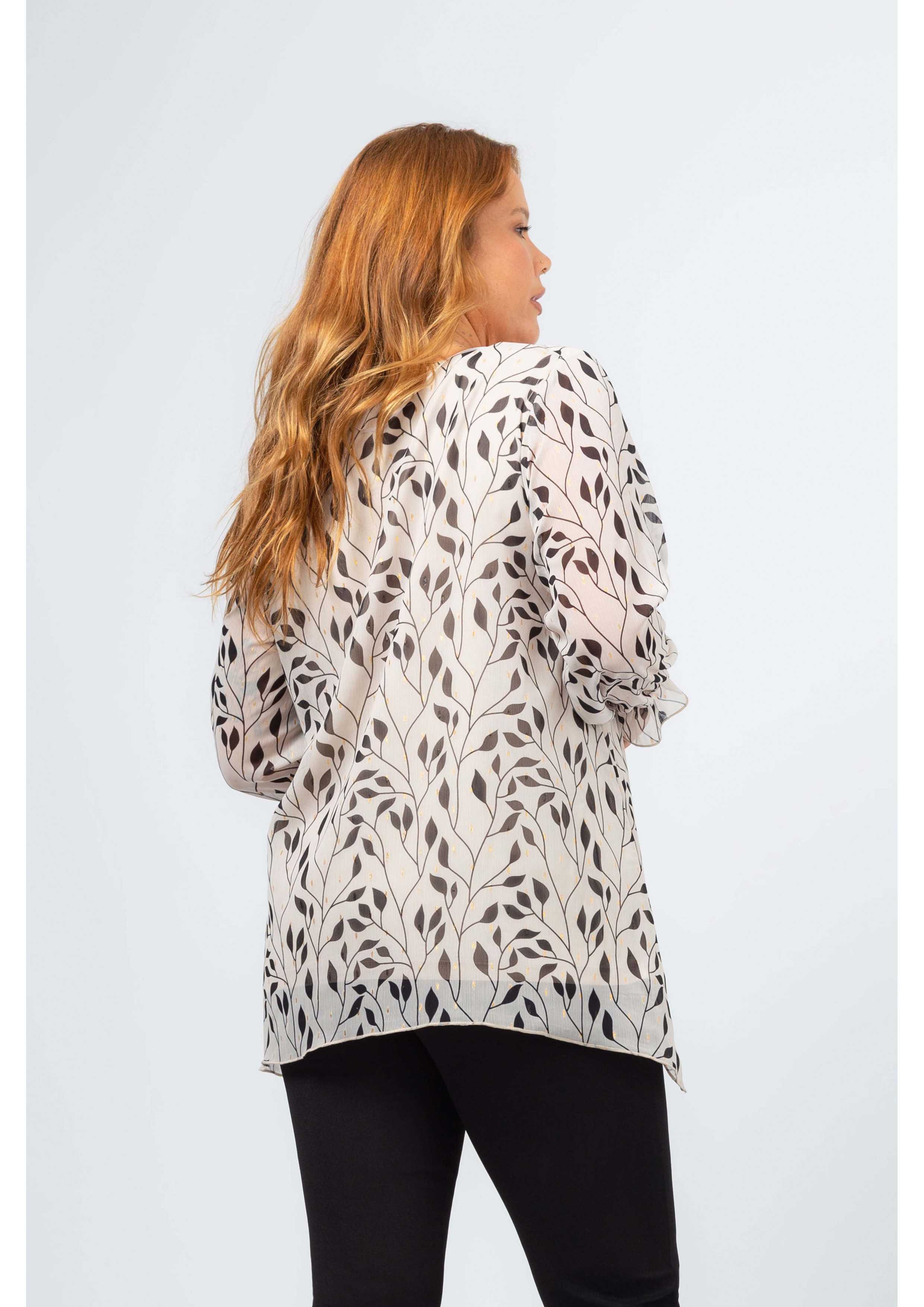 Túnica de tejido floreado, forrada. Modelo evasé con picos laterales, manga larga con elástico. Acabados en rolinho. Colección: Otoño Invierno Disponible en Tallas Grandes Producto de diseño y fabricación propia. Somos una marca de confección de ropa con más de 50 años de experiencia Modelo: Altura 1.70m y está vistiendo la talla XL. Composición: 95% Poliéster 5% Metal| 94% Poliéster 6% Elastano