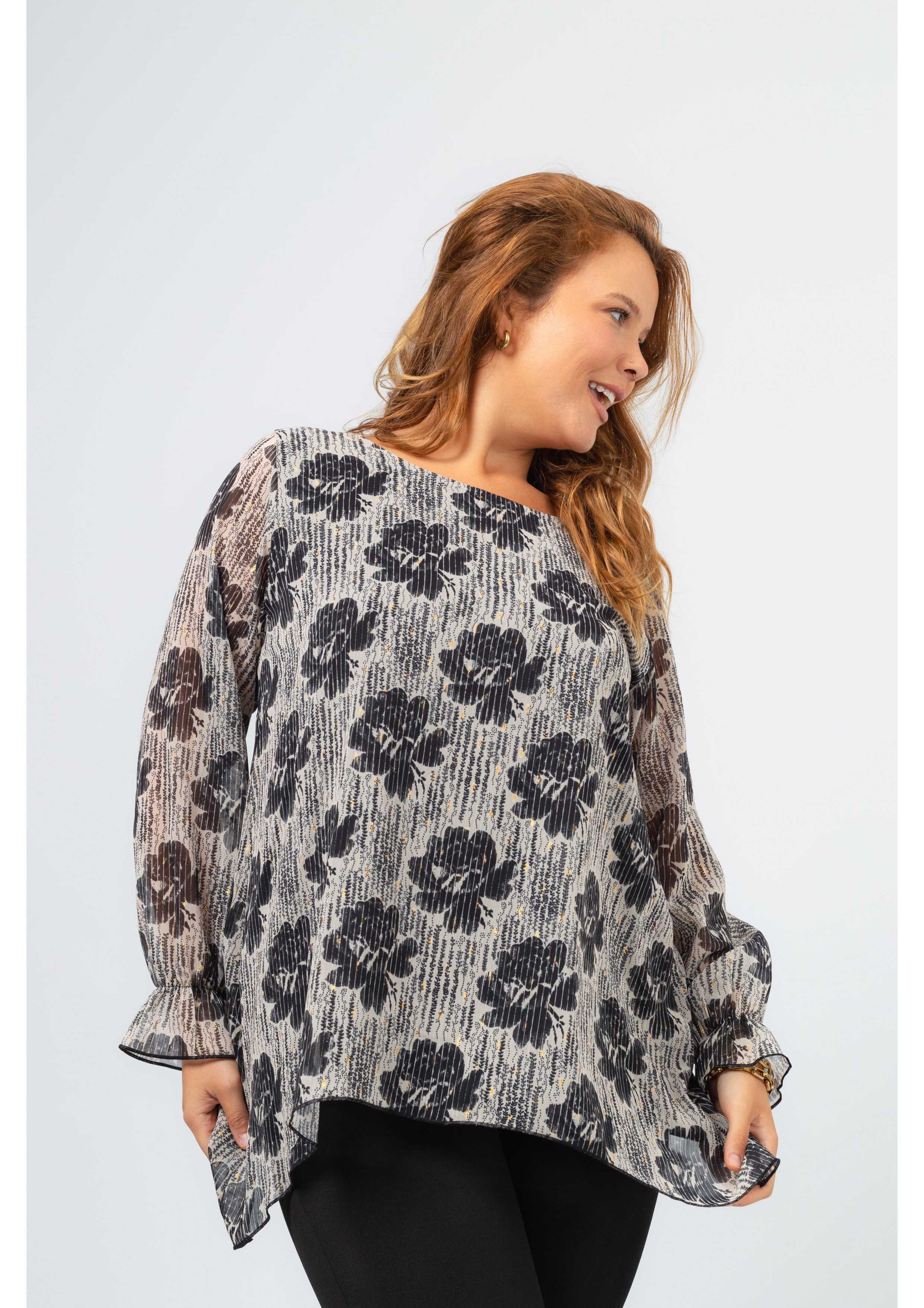 Túnica de tejido floreado, forrada. Modelo evasé con picos laterales, manga larga con elástico. Acabados en rolinho. Colección: Otoño Invierno Disponible en Tallas Grandes Producto de diseño y fabricación propia. Somos una marca de confección de ropa con más de 50 años de experiencia Modelo: Altura 1.70m y está vistiendo la talla XL. Composición: 95% Poliéster 5% Metal | 94% Poliéster 6% Elastano