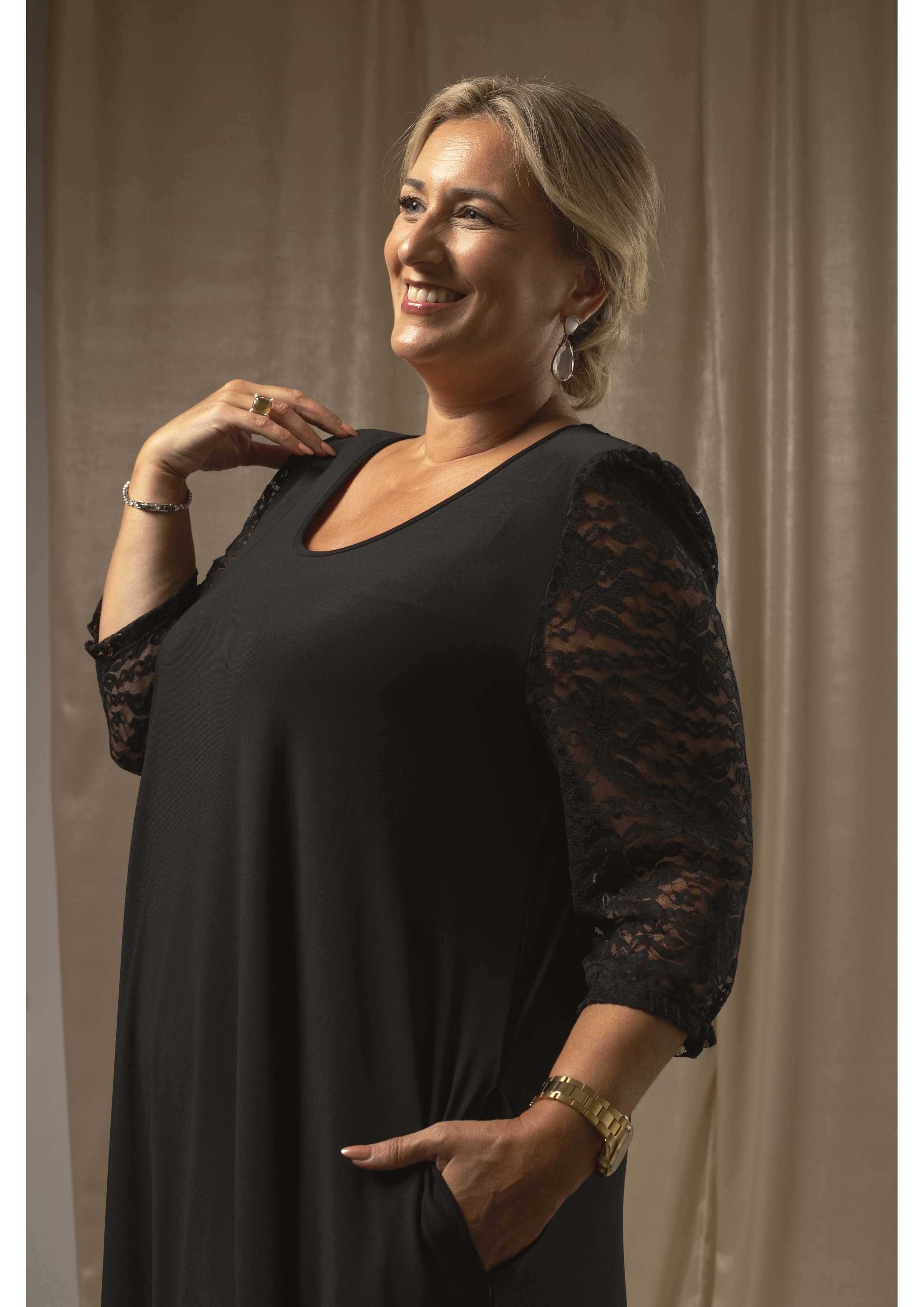 Vestido de punto liso, manga fruncida 3/4 en encaje y remate en la parte inferior también en encaje. Escote redondo. Corte en la espalda. Picos en la base. Lleva hombreras. Colección: Otoño Invierno Disponible en Tallas Grandes Producto de diseño y fabricación propia. Somos una marca de confección de ropa con más de 50 años de experiencia Modelo: Altura 1.65m y está vistiendo la talla 3XL. Composición: 94%Poliéster 6%Elastano|ENCANTO 88%Nylon 12%Elastano