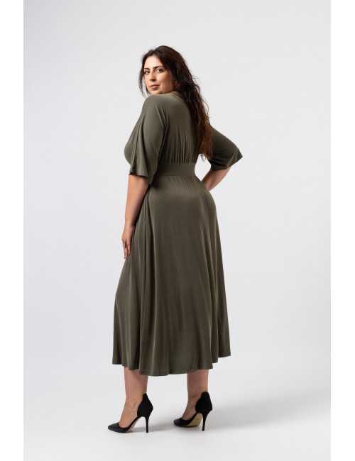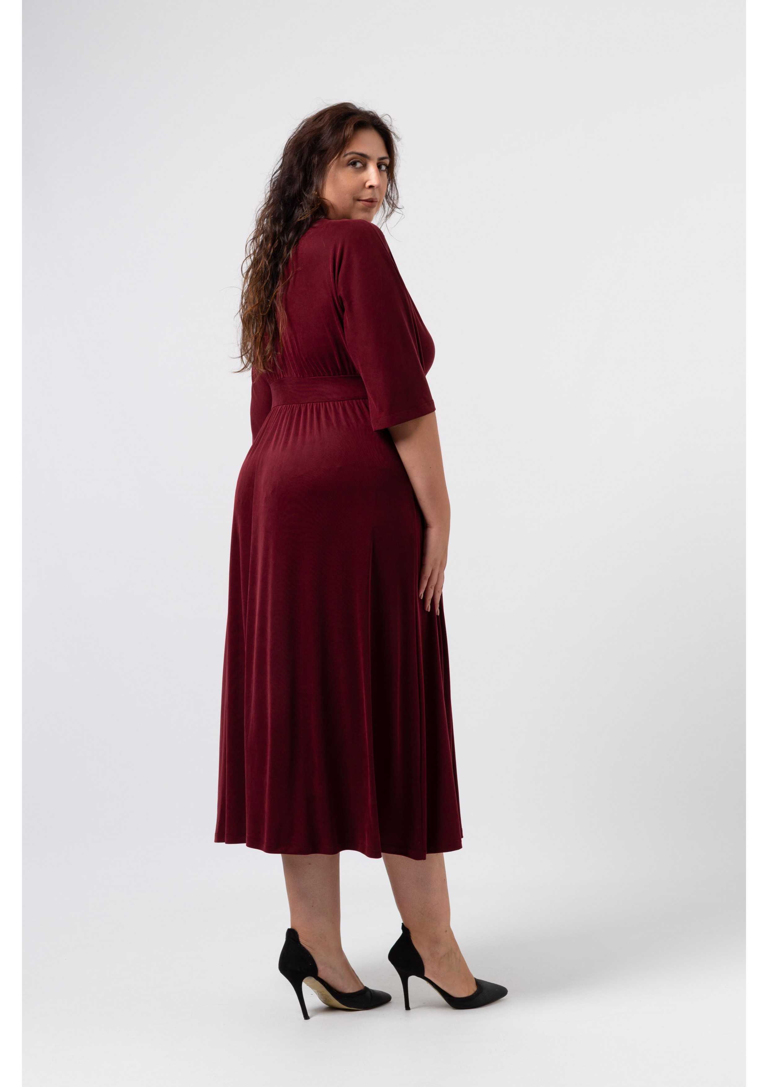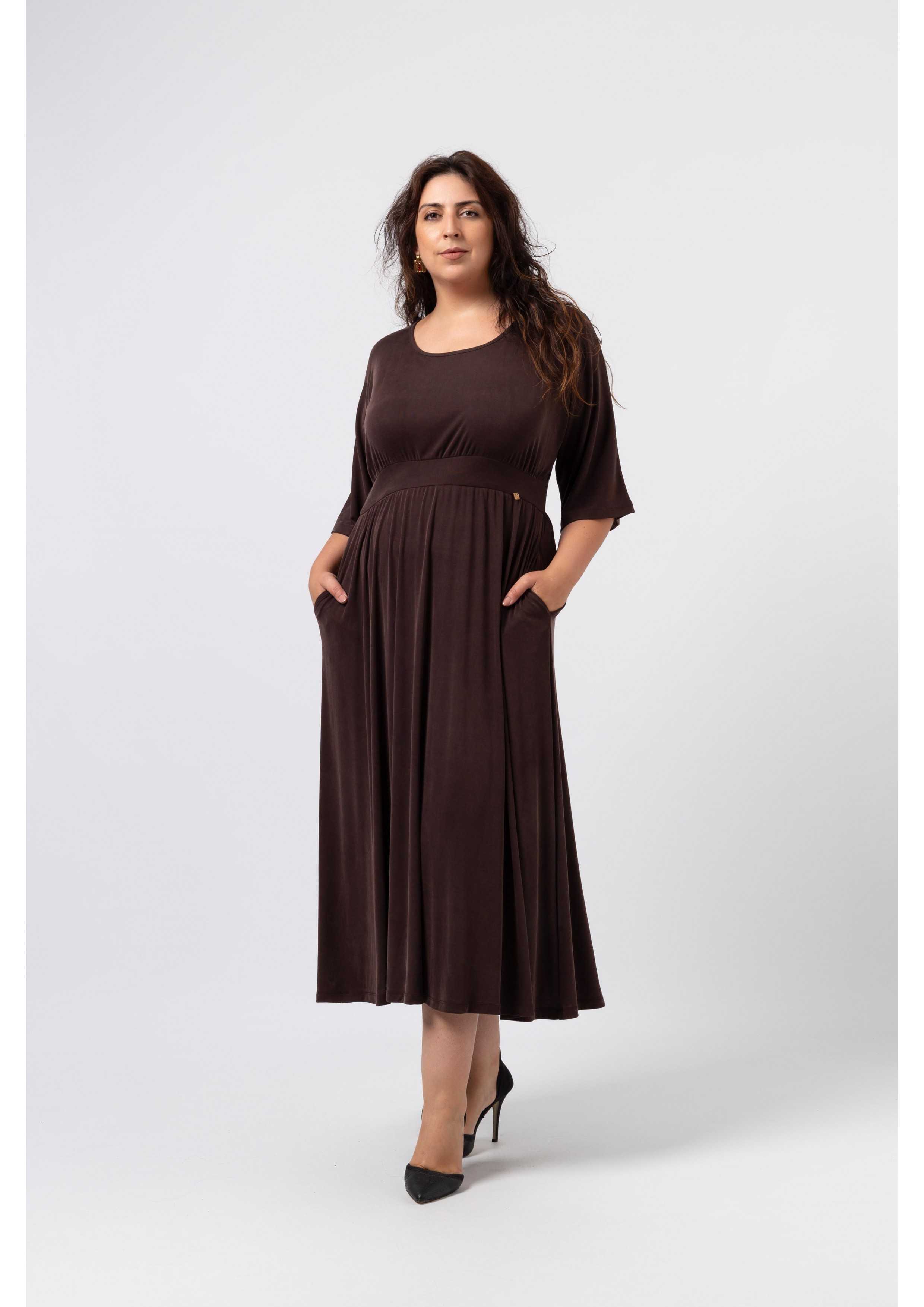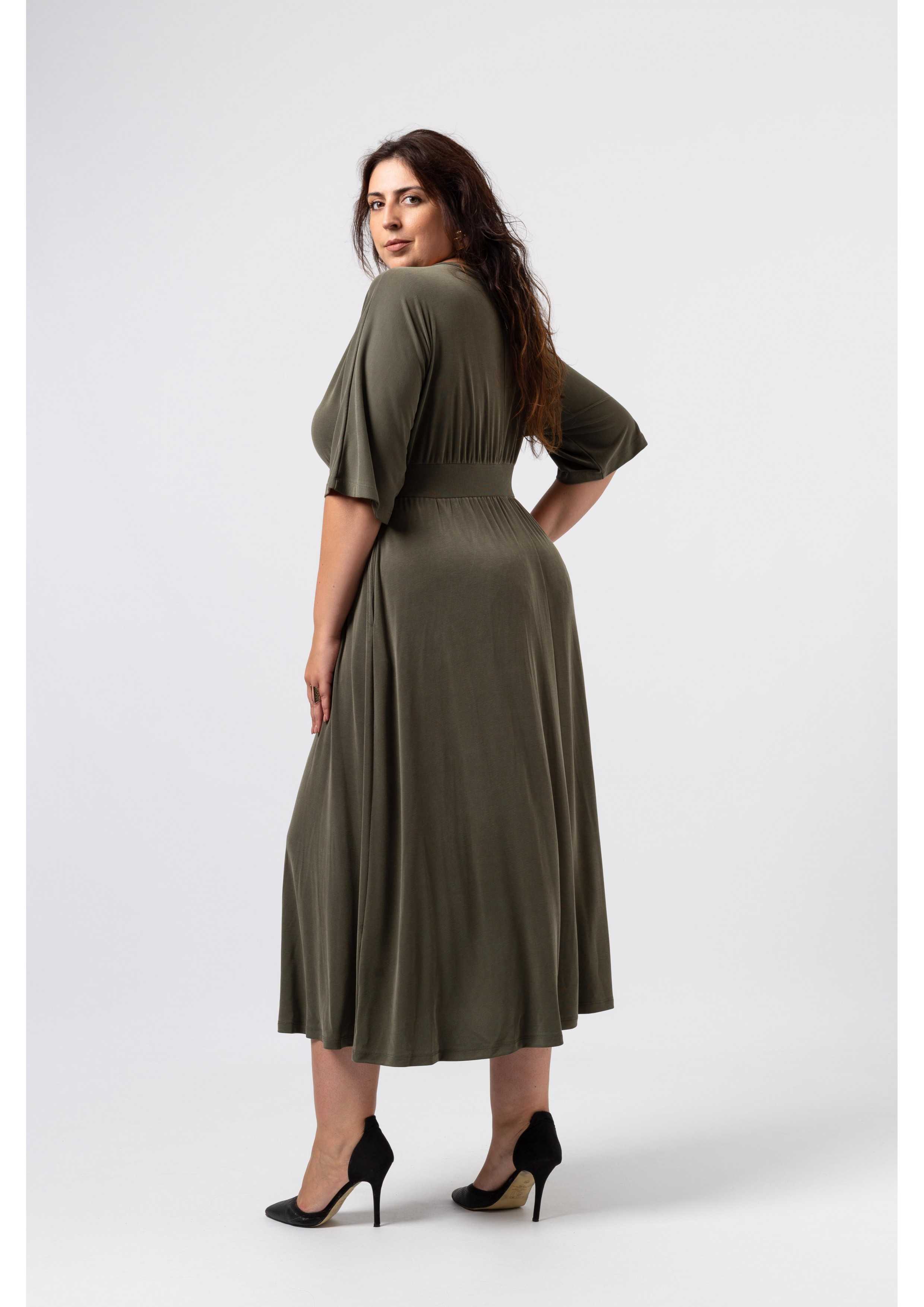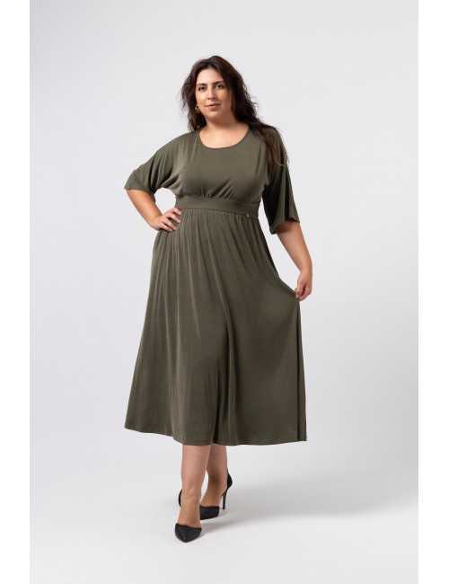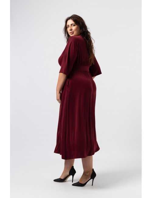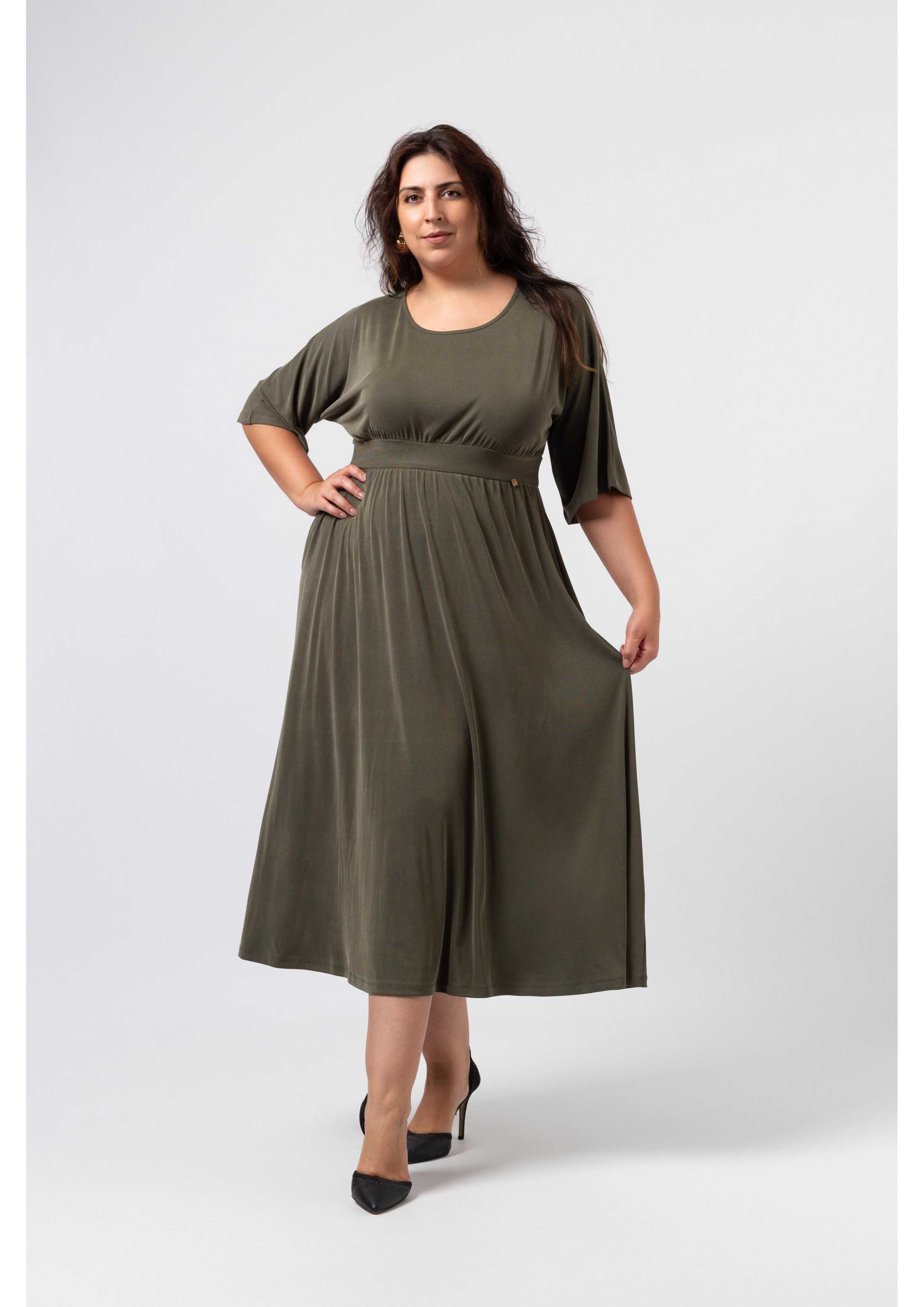 Vestido de punto liso, tipo cupro, manga murciélago. Cinturón de punto doble. Frunces en el pecho y la falda, bolsillos laterales, escote ligeramente barco. Colección: Otoño Invierno Disponible en Tallas Grandes Producto de diseño y fabricación propia. Somos una marca de confección de ropa con más de 50 años de experiencia Modelo: Altura 1.73m y viste la talla 3XL. Modelo: Altura 1.65m y viste la talla 3XL. Composición: 87% Poliéster 10% Viscosa 3% Elastano