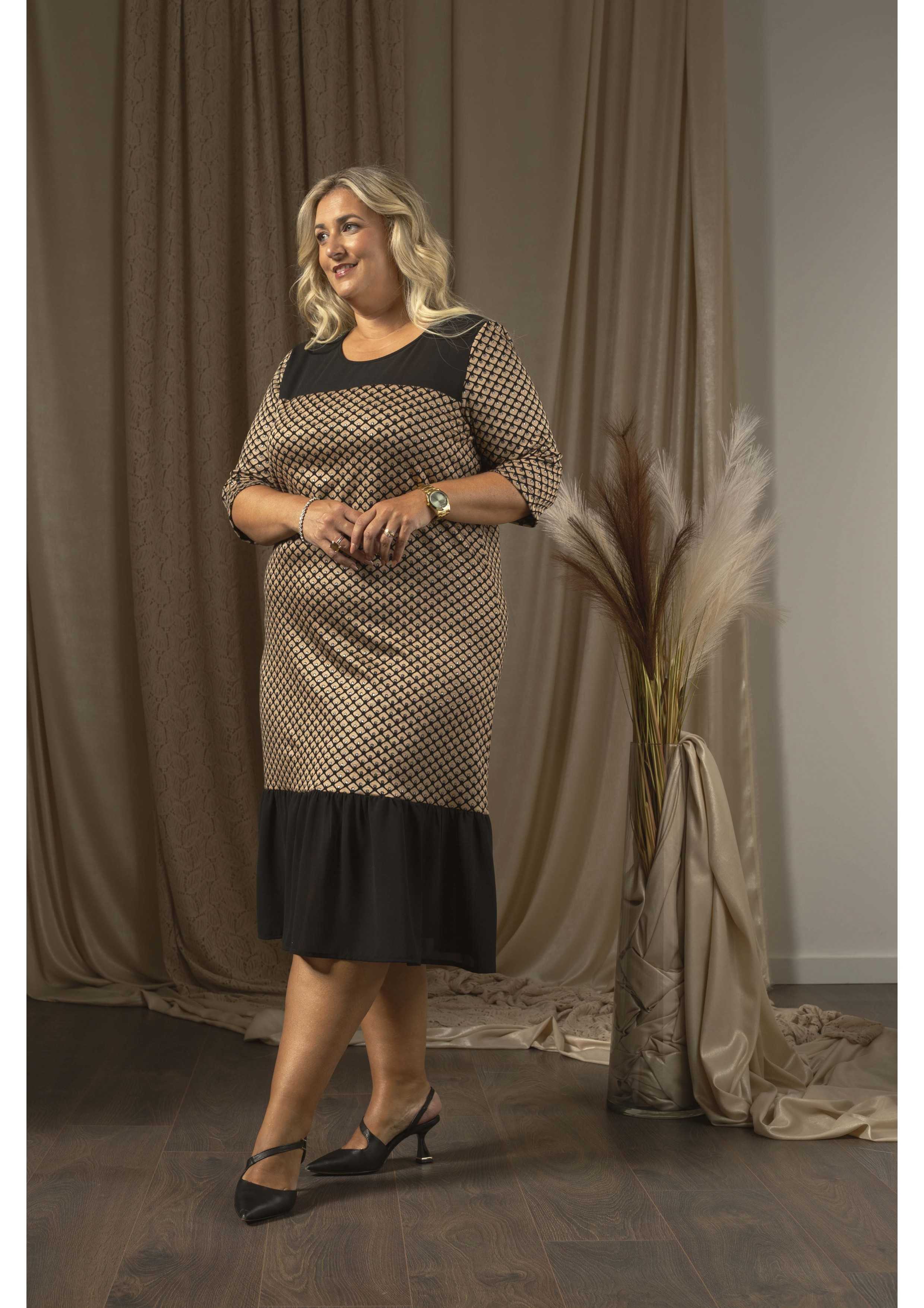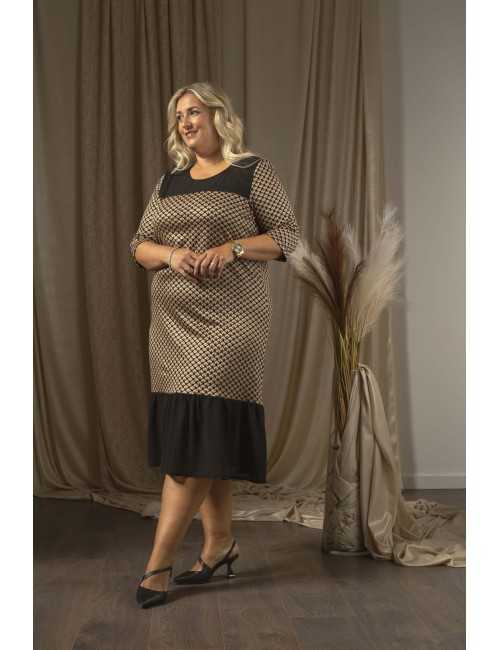 Vestido con cuerpo de malha estampado con brillo, pecho y volante en bajo liso. manga 3/4 Colección: Otoño Invierno Disponible en Tallas Grandes Producto de diseño y fabricación propia. Somos una marca de confección de ropa con más de 50 años de experiencia Modelo: Altura 1.65m y está usando la talla 3XL. Composición: 59%Poliéster 41%Viscosa|100%Poliéster
