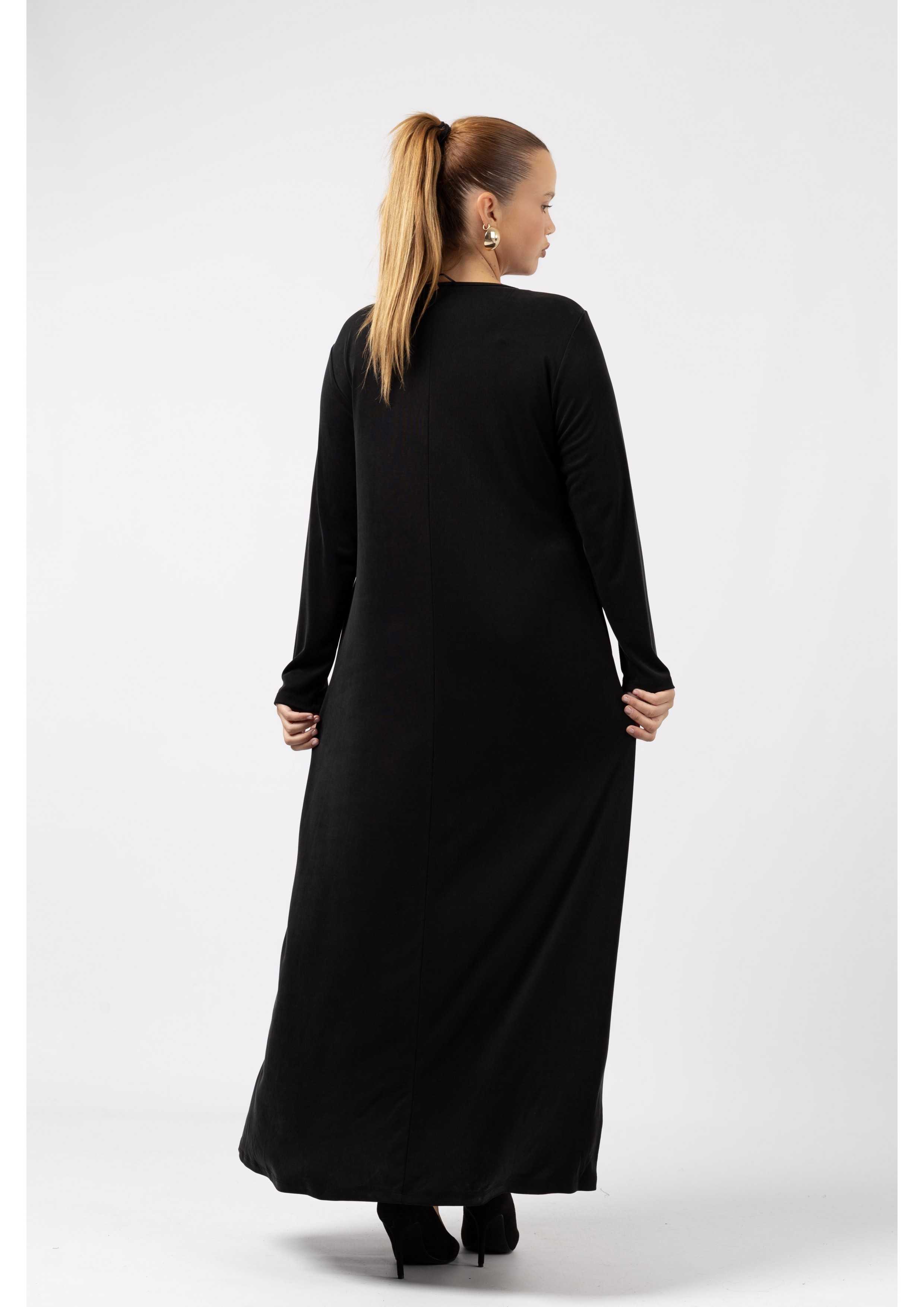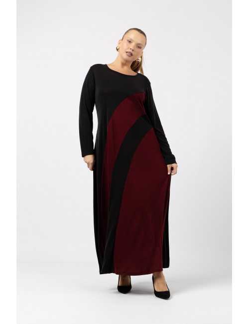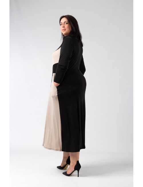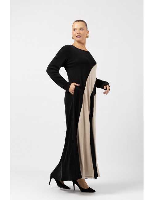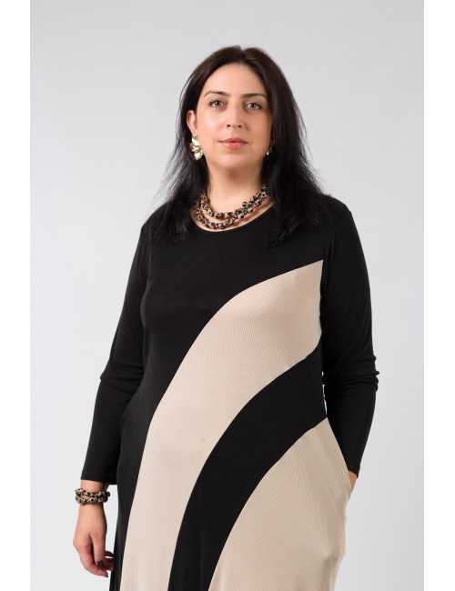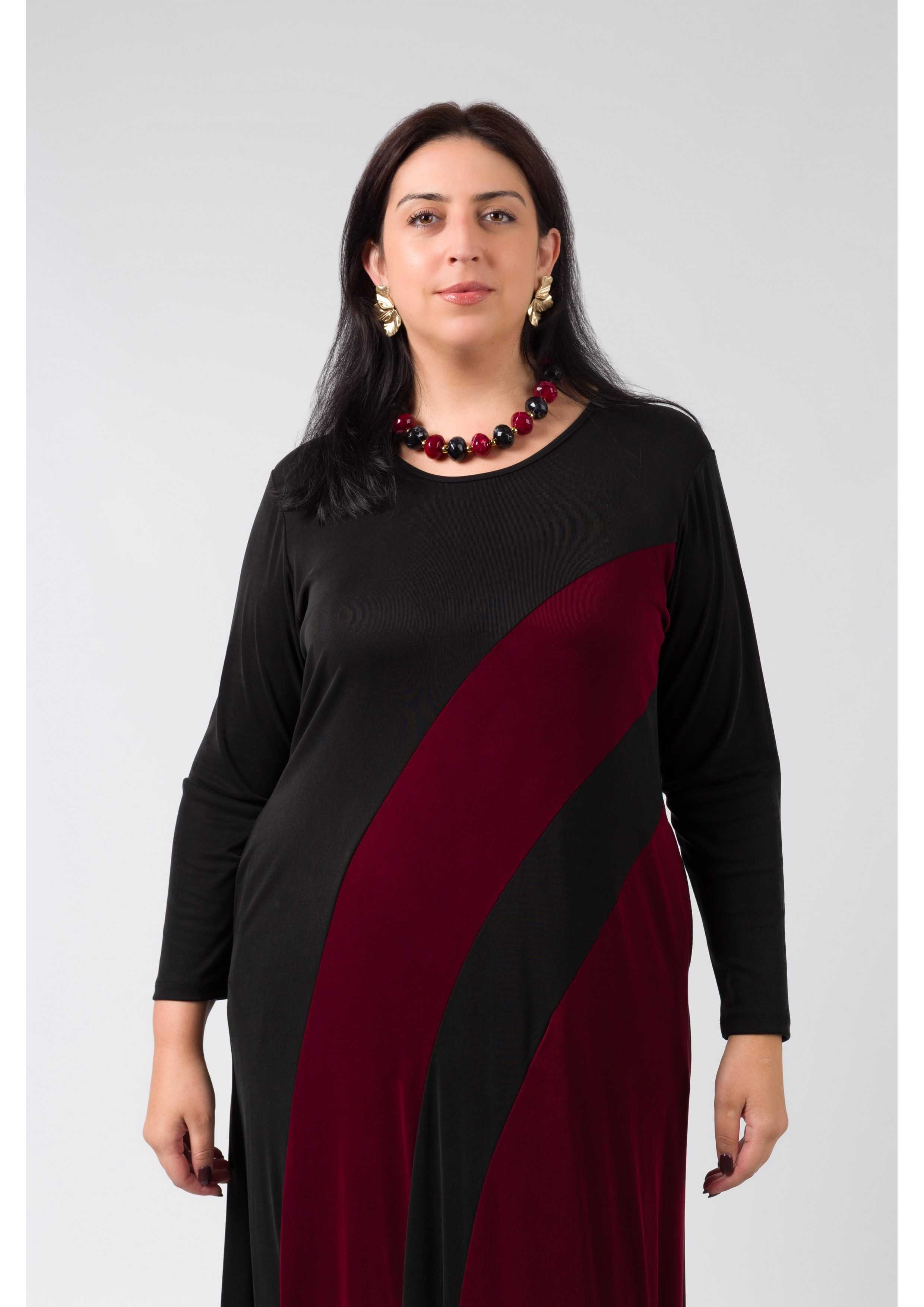 Vestido de punto liso, modal caña fina. Escote redondo. Manga larga. Inserciones diagonales en contraste en el frente y bolsillos laterales. Colección: Otoño Invierno Disponible en Tallas Grandes Producto de diseño y fabricación propia. Somos una marca de confección de ropa con más de 50 años de experiencia Modelo: Altura 1.73m y está usando el tamaño 3XL. Composición: 87% Poliéster 10% Viscosa 3% Elastano