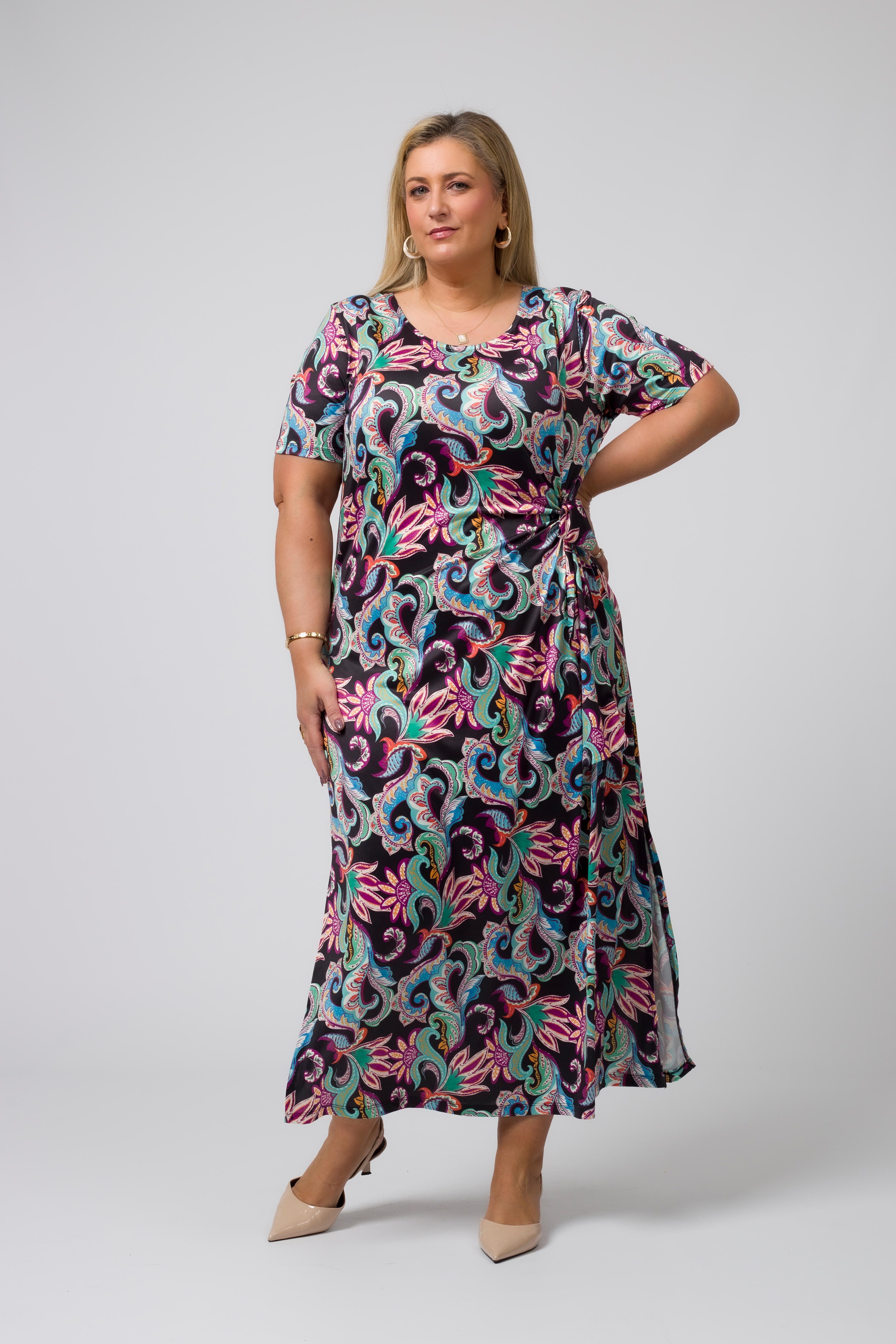 Vestido de punto estampado con escote redondo y desgastes en los laterales y lazo drapeado en el lateral. Colección: Primavera Verano Disponible en Tallas Grandes Producto de diseño y fabricación propia. Somos una marca de confección de ropa con más de 50 años de experiencia Modelo: Altura 1.65m y está usando la talla 3XL. Composición: 96%Poliéster 4%Elastano