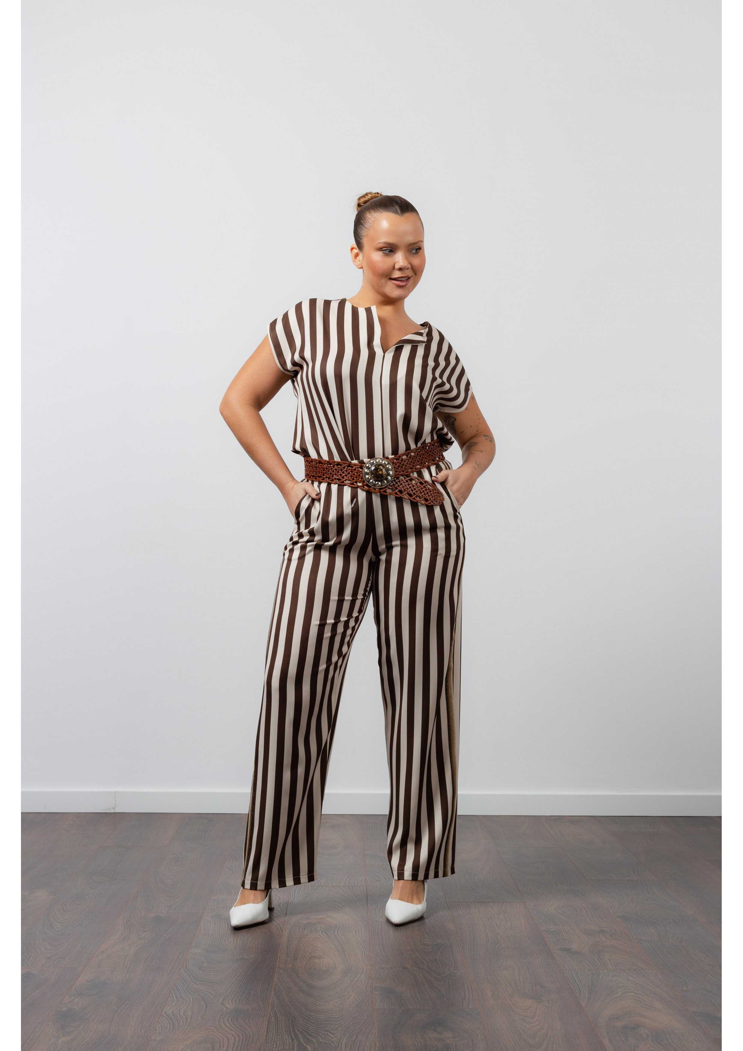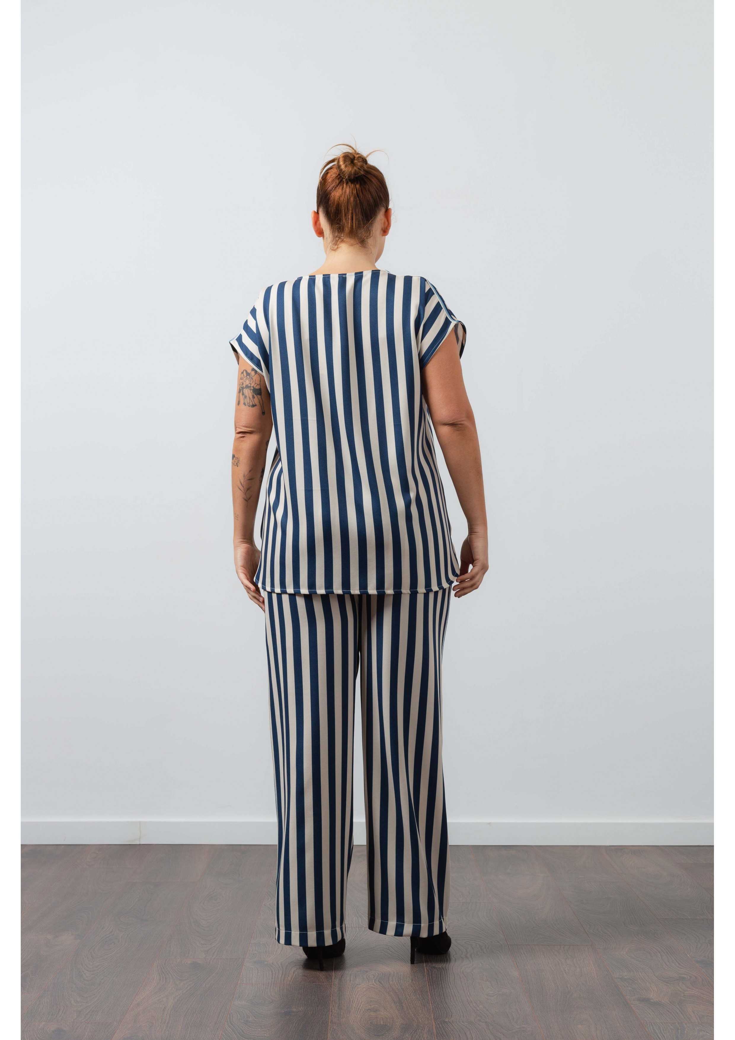 Conjunto en tejido de rayas verticales. Túnica y pantalón con aplicación de cinta de fantasía, hombros y lateral de la pierna. Túnica con escote redondo y lágrima, base redonda. Pantalón con bolsillos laterales, elástico en la cintura. Colección: Primavera Verano Modelo: Altura 1.70m y está usando la talla XL. Accesorio no incluido.