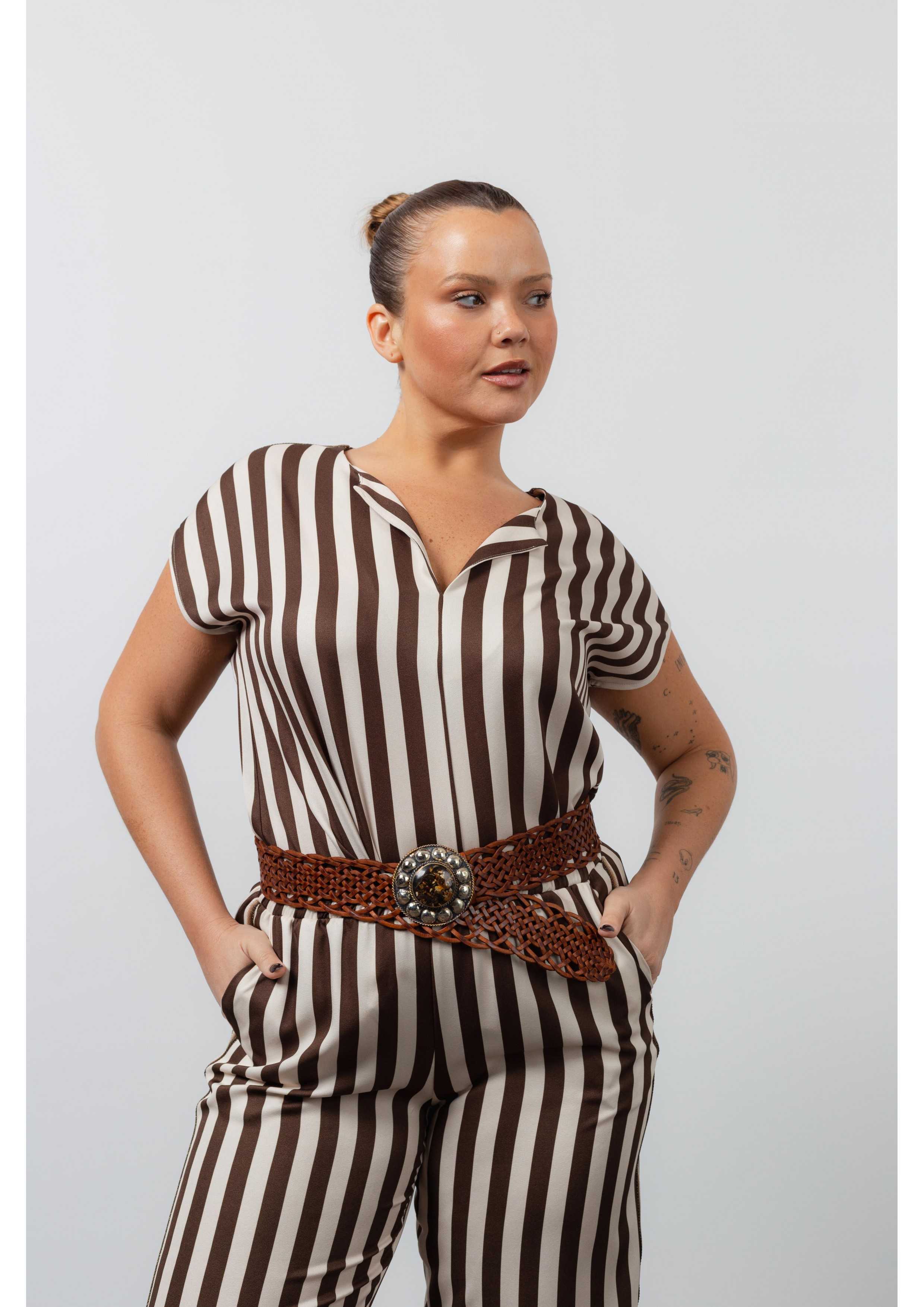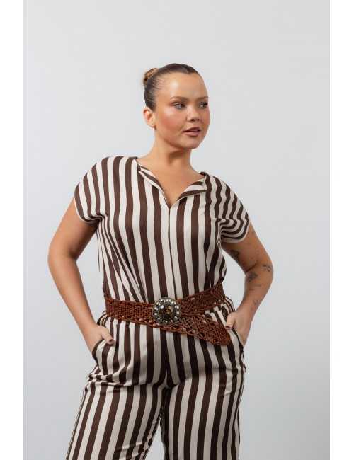 Conjunto en tejido de rayas verticales. Túnica y pantalón con aplicación de cinta de fantasía, hombros y lateral de la pierna. Túnica con escote redondo y lágrima, base redonda. Pantalón con bolsillos laterales, elástico en la cintura. Colección: Primavera Verano Disponible en Tamanos Grandes Producto de diseño y fabricación propia. Somos una marca de confección de ropa con más de 50 años de experiencia Modelo: Altura 1.70m y está usando la talla XL. Accesorio no incluido.