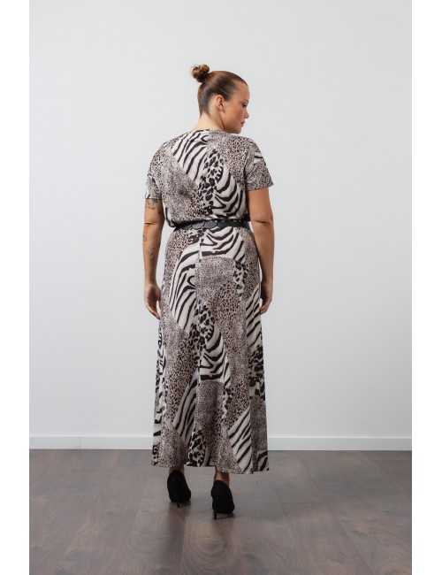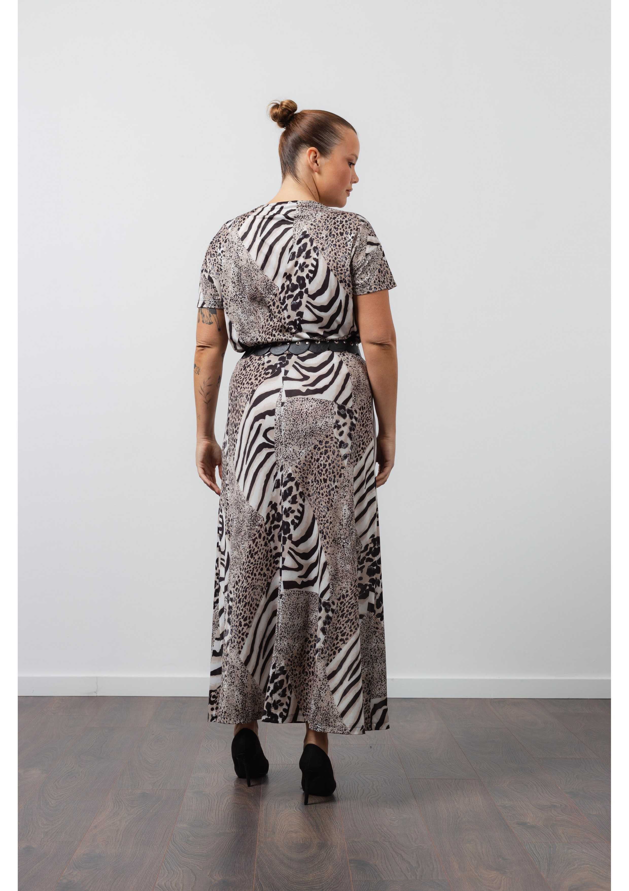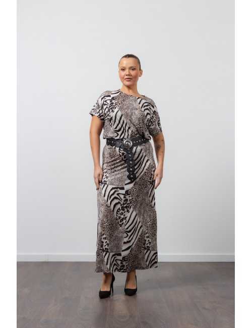 Conjunto de malla estampada, de falda y camiseta. Falda con elástico en la cintura, costura en la parte posterior. Camiseta de manga corta con escote redondo y colorete. Conjunto con cinturón. Colección: Primavera Verano Disponible en Tallas Grandes Producto de diseño y fabricación propia. Somos una marca de confección de ropa con más de 50 años de experiencia Modelo: Altura 1.70m y está usando la talla XL.