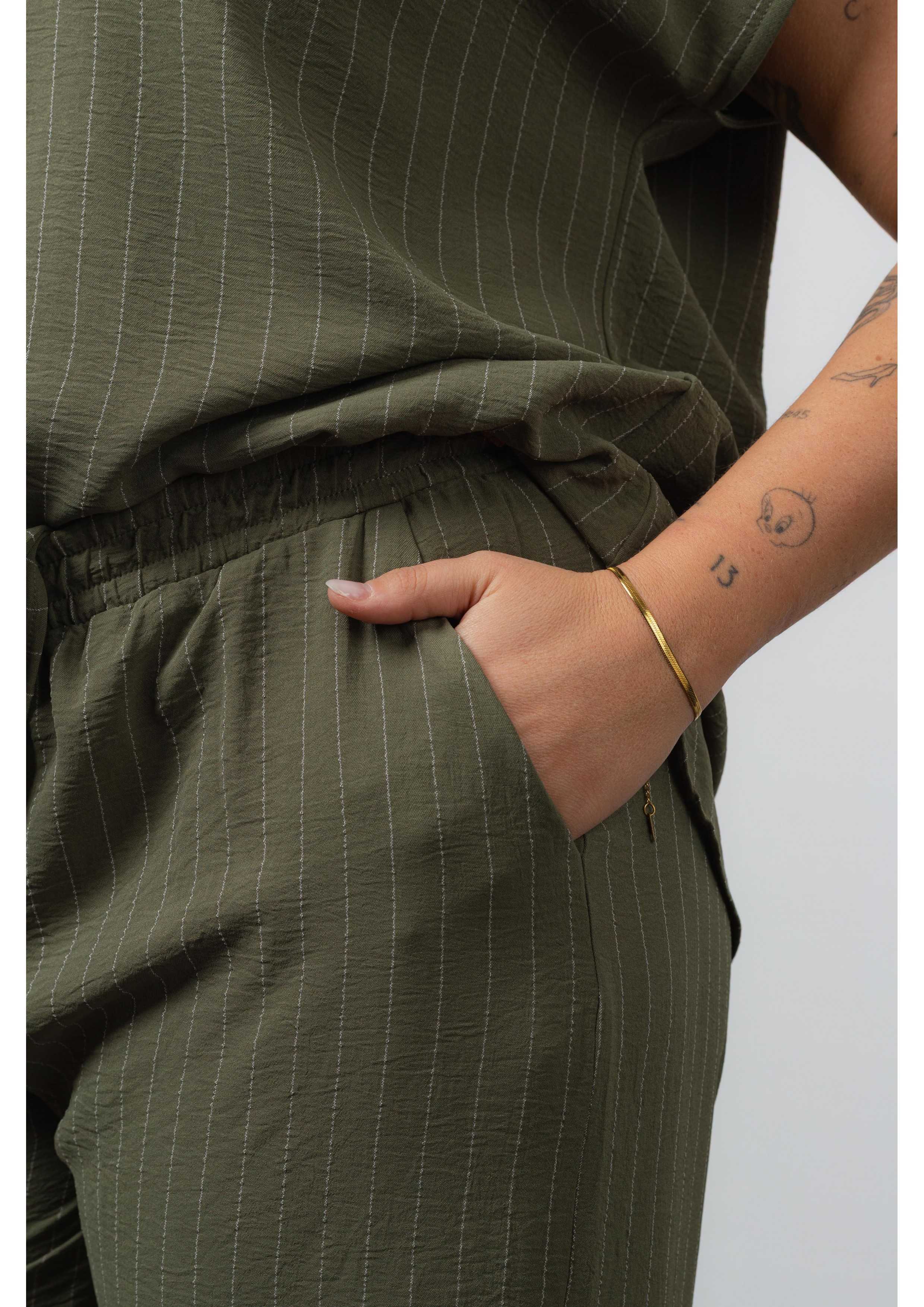 Conjunto en tejido liso de rayas verticales, túnica de cuello redondo con lágrima y aplique, base redondeada. Pantalón con bolsillos laterales, elástico alto en la cintura con doble pespunte. Colección: Primavera Verano Modelo: Altura 1.70m y está vistiendo la talla XL.