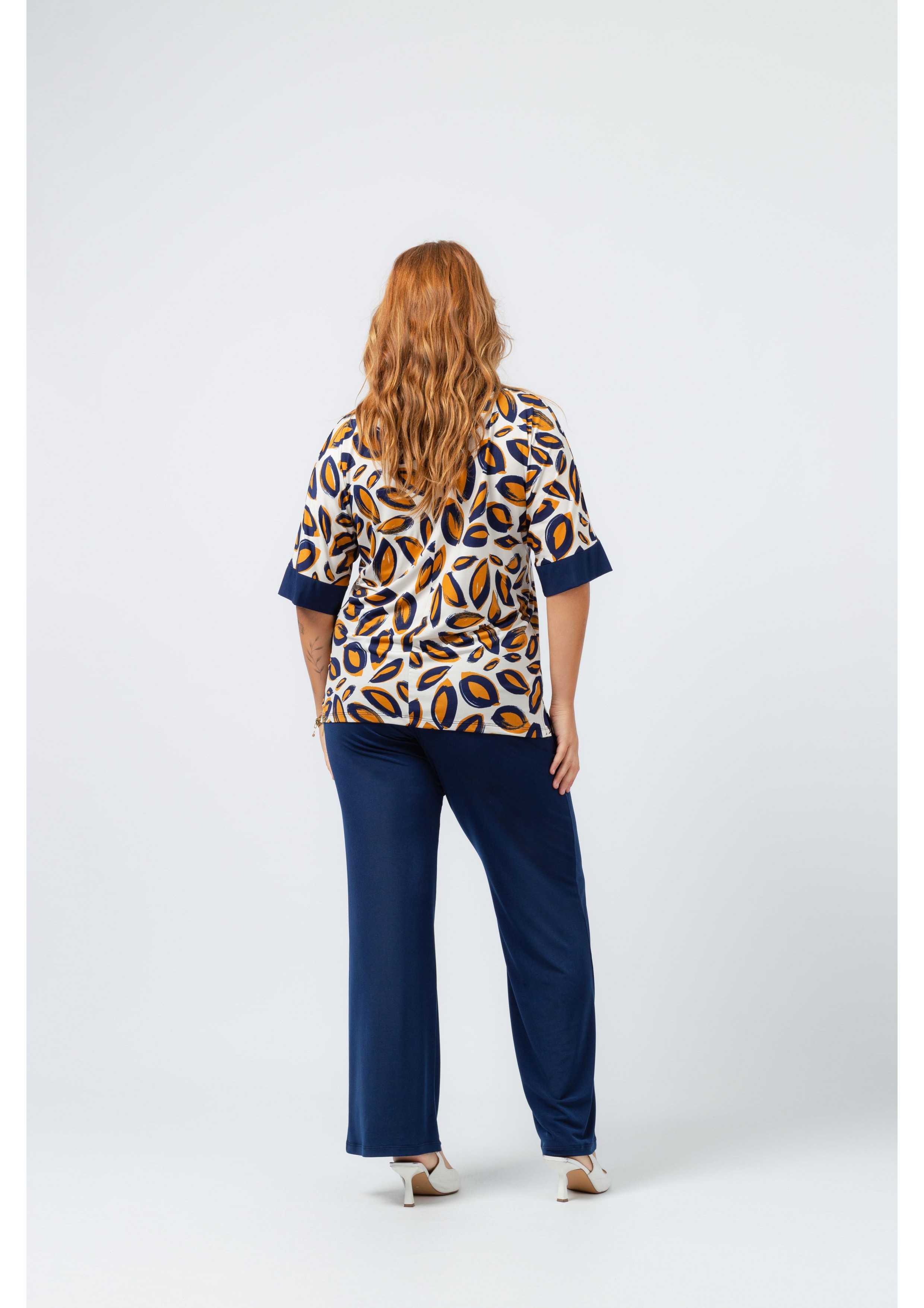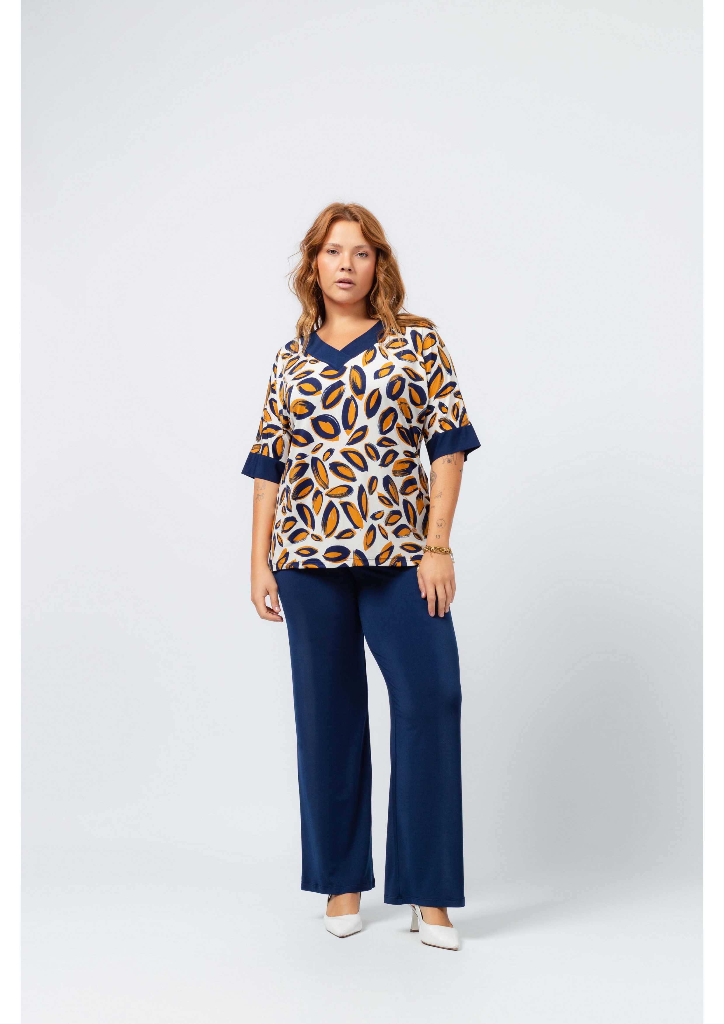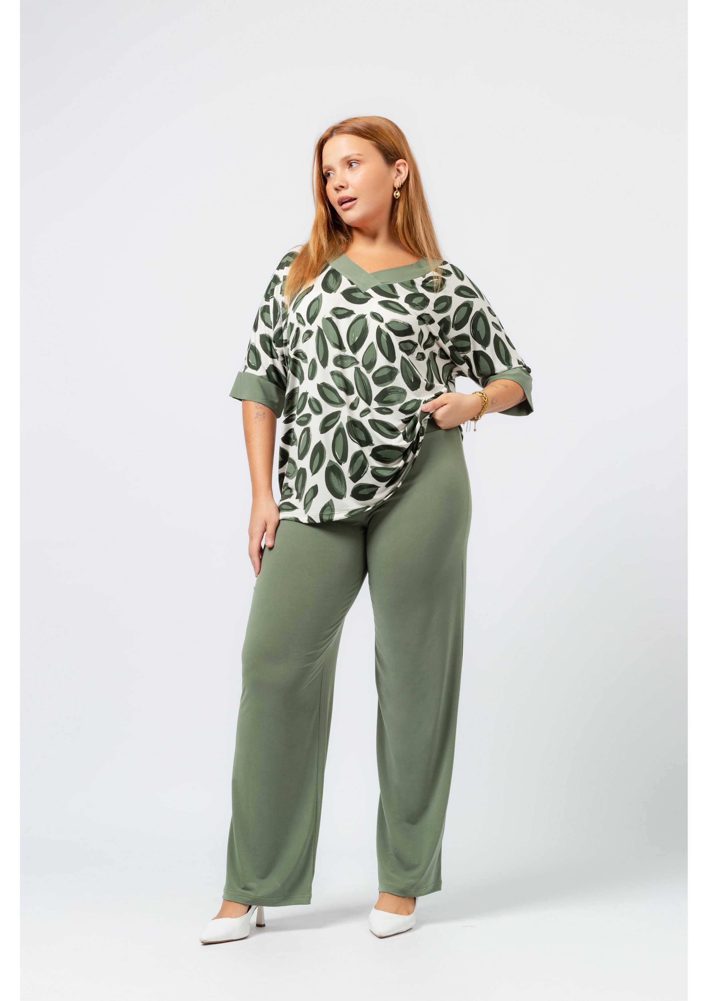 Conjunto de punto liso y estampado, camiseta estampada de manga murciélago, aberturas laterales, escote en pico y puños de punto liso, pantalón liso con cinturón alto con elástico, modelo holgado. Colección: Primavera Verano Disponible en Tallas Grandes Producto de diseño y fabricación propia. Somos una marca de confección de ropa con más de 50 años de experiencia Modelo: Altura 1.70m y está usando la talla XL. Composición: 94% Poliéster 6% Elastano