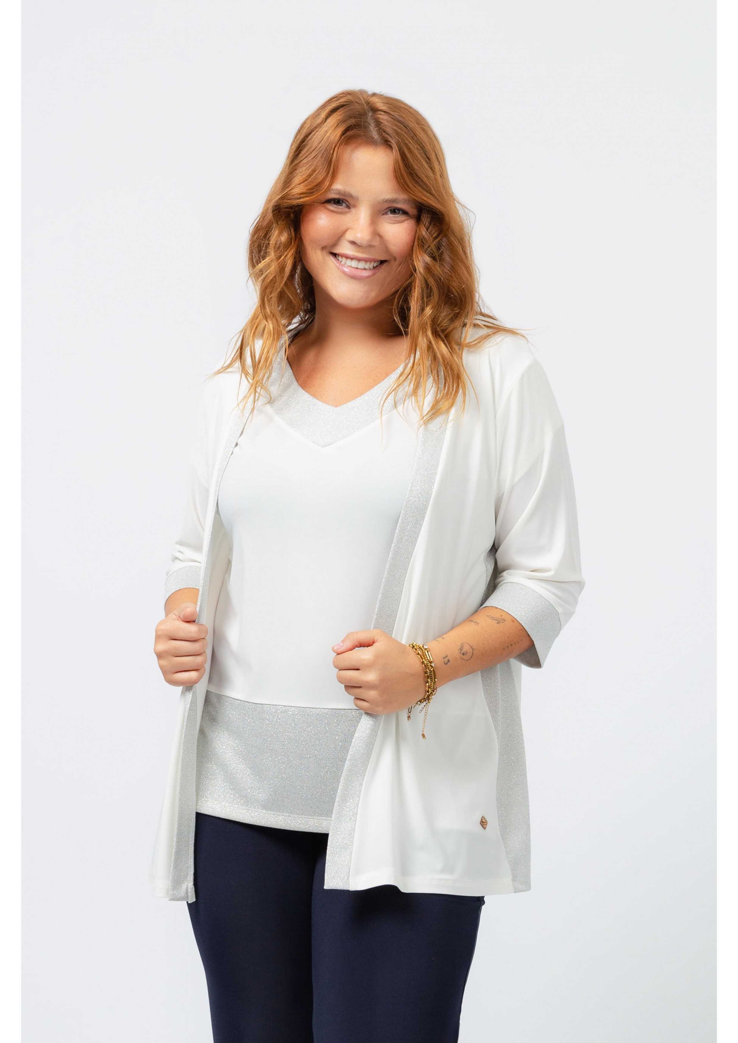Conjunto de punto liso, con detalles en punto lurex. Camiseta con escote en pico y detalle en la base, aberturas laterales. Chaqueta de manga 3/4 con puños, detalle lateral. Colección: Primavera Verano Modelo: Altura 1.70m y está usando la talla XL