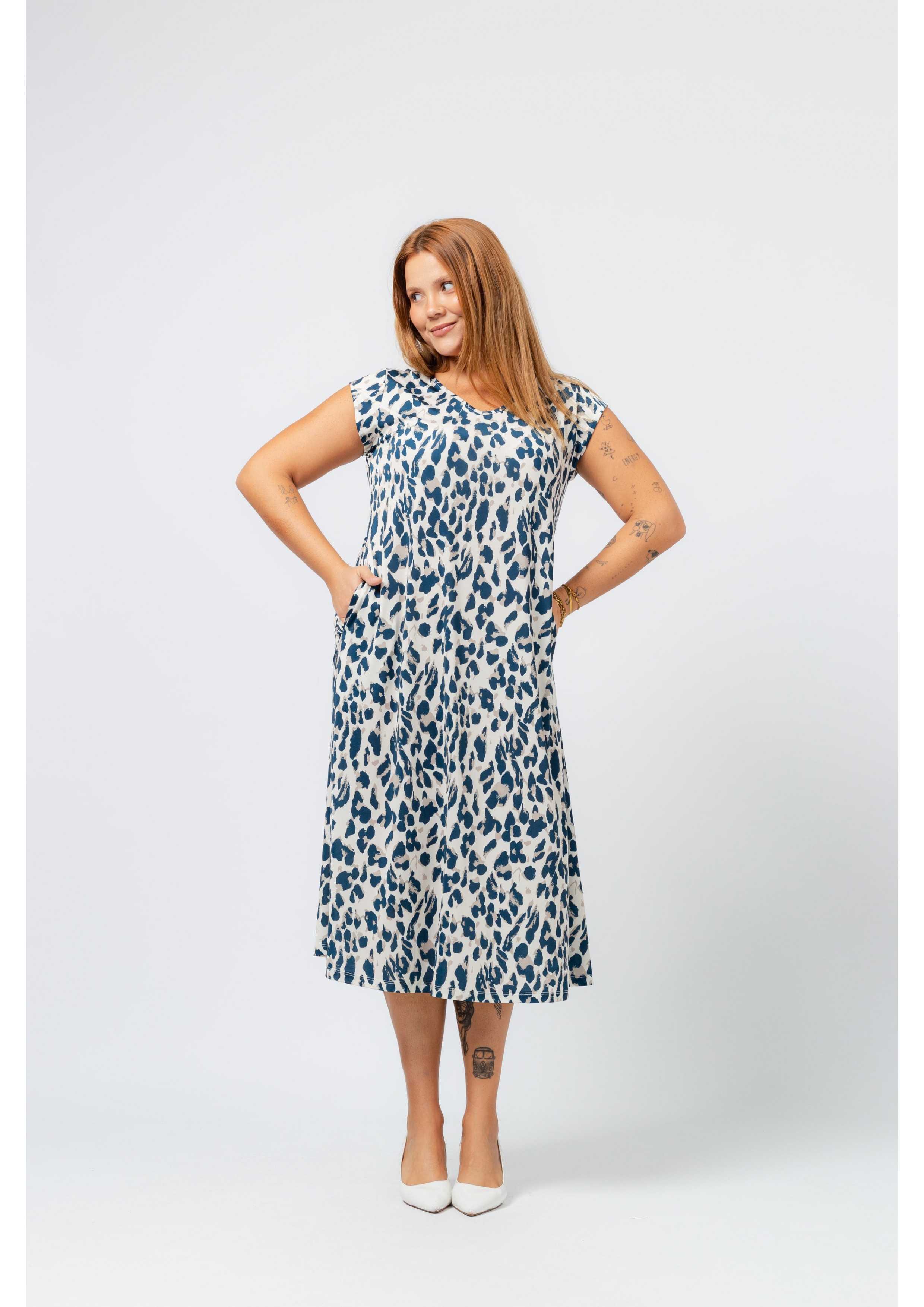 Vestido de malha estampada, manga corta tipo copa doblada. Bolsillos laterales. Escote en pico con colorete, corte en la espalda. Colección: Primavera Verano Modelo: Altura 1.70m y está vistiendo la talla XL