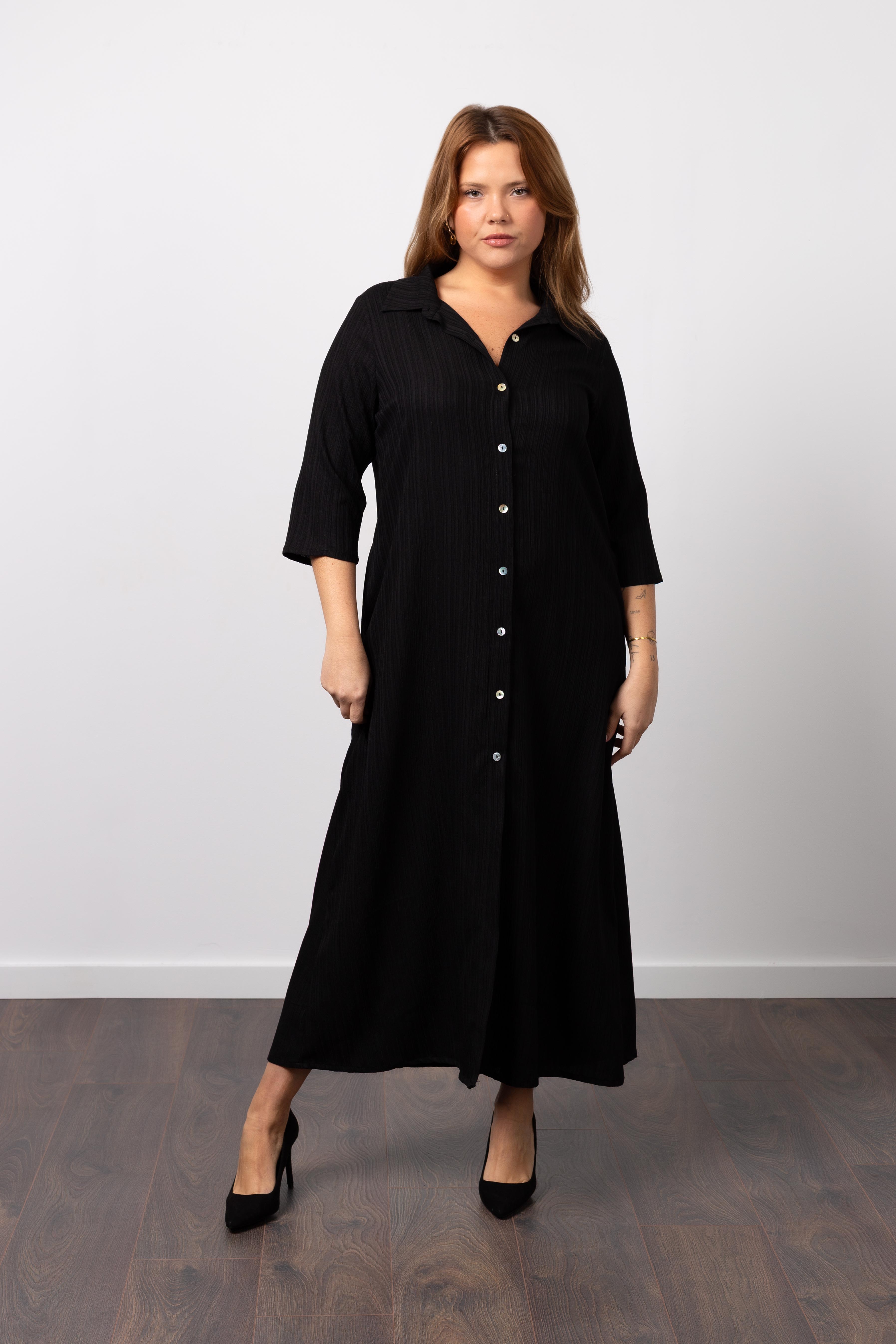 Vestido de tejido liso largo, modelo camisetero, manga 3/4, bolsillos laterales. Cuello con pie de gola. Colección: Primavera Verano Modelo: Altura 1.70m y está vistiendo la talla XL