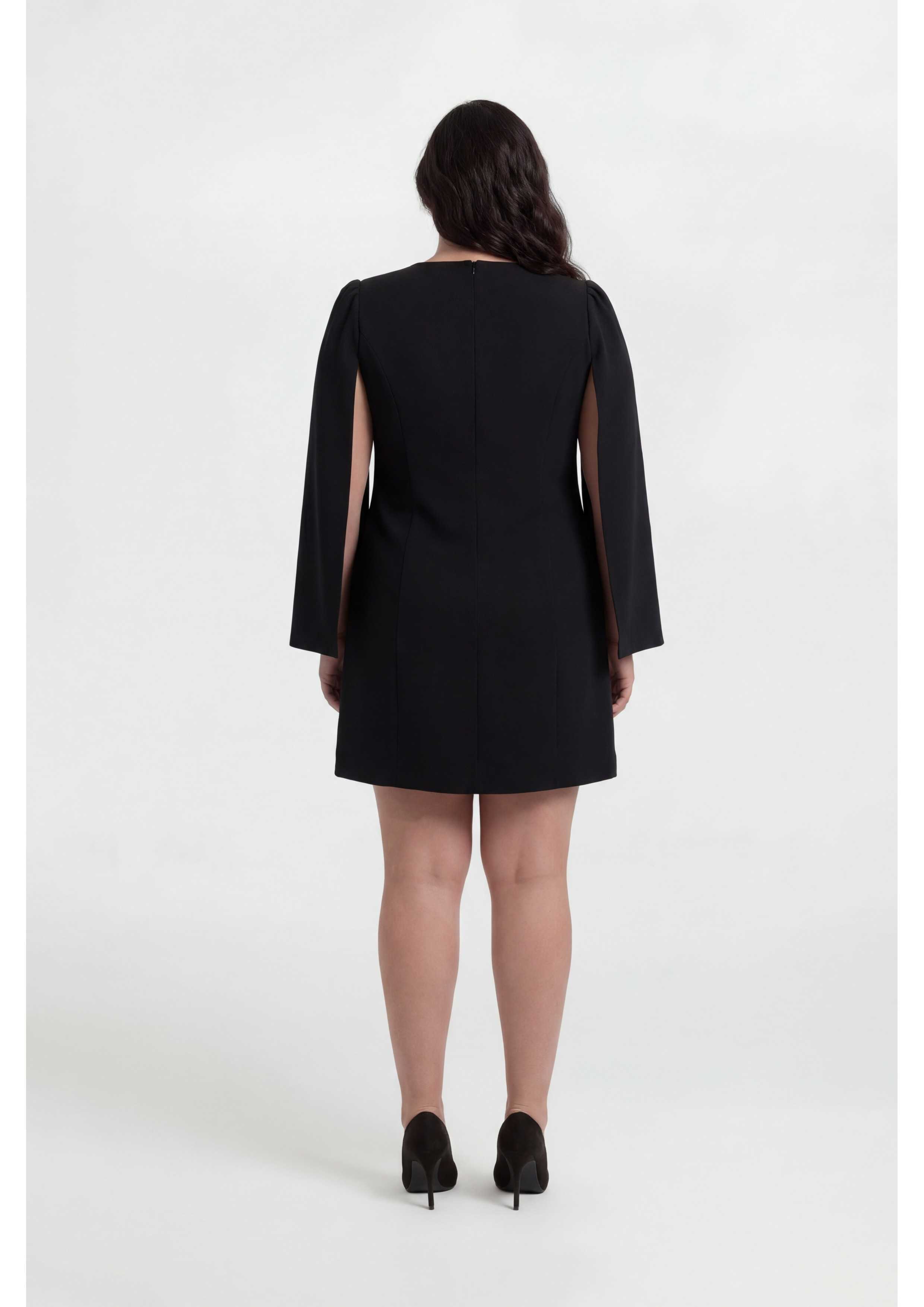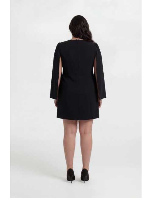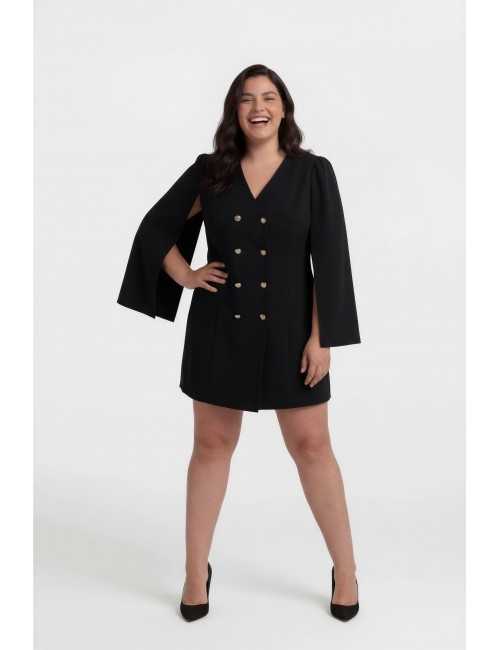 Vestido de tejido liso, estilo abrigo cruzado con botones dorados, con manga estilo capa y fruncido en el hombro. Lleva hombreras Colección: Otoño Invierno Modelo: Altura 1.70m y está vistiendo la talla XL, en negro. Modelo: Altura 1.73m y está vistiendo la talla 4XL, en azul oscuro.