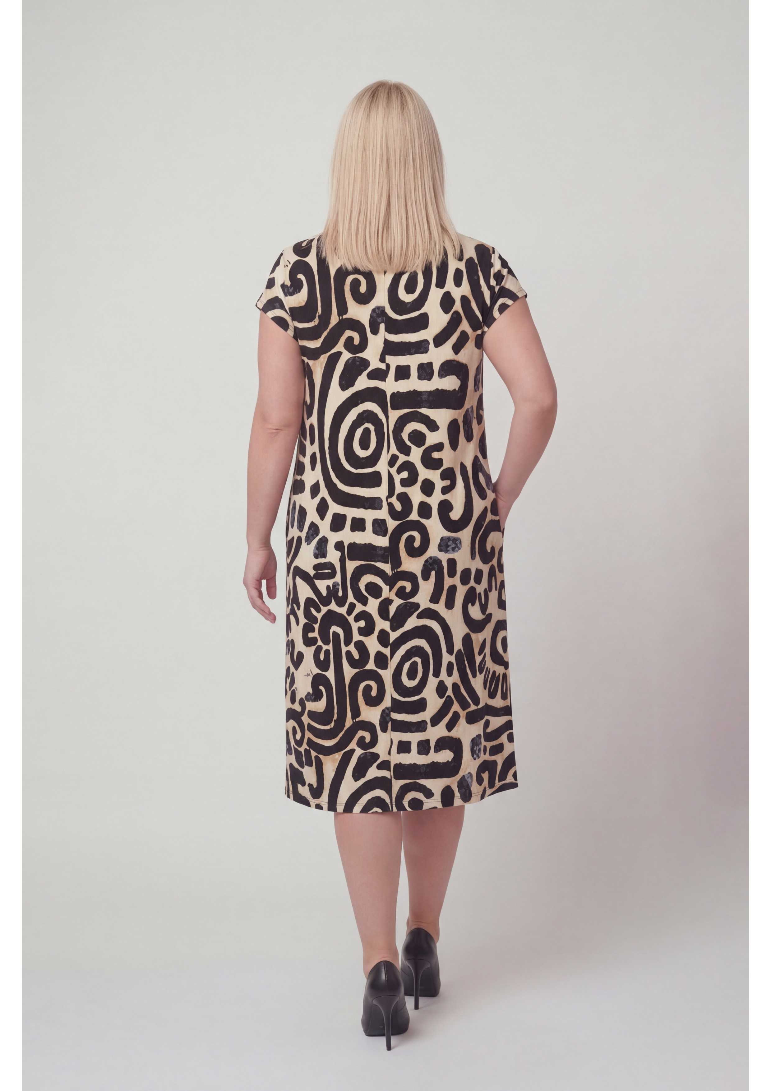Vestido de punto estampado, manga corta tipo copa, escote en pico con ribete y con tachuelas, bolsillos laterales. Corte en la espalda.