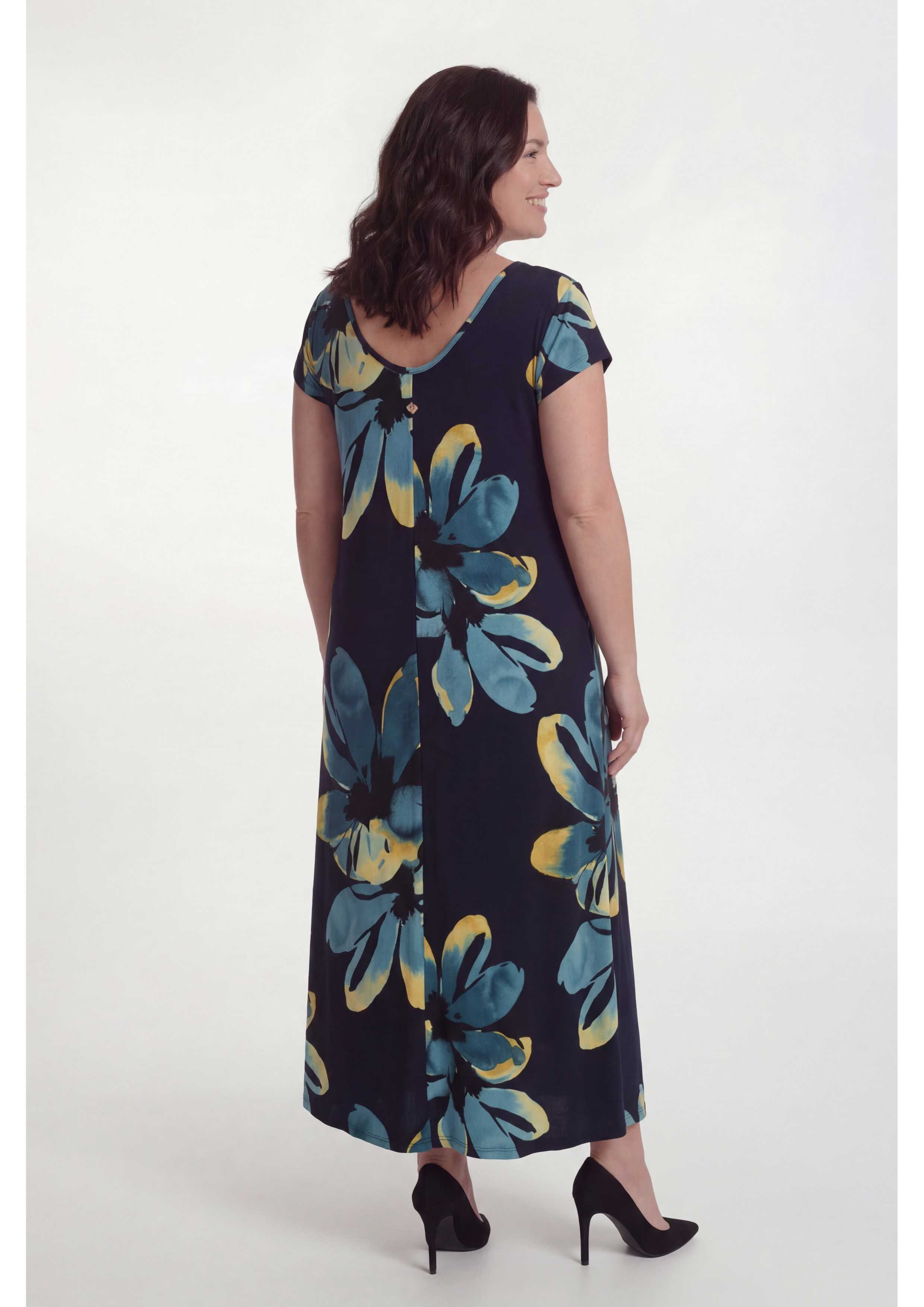 Vestido largo de punto estampado, tonos marino, bolsillos laterales pespunteados por el exterior, escote redondo más profundo en la espalda que en el frente. Corte en la espalda. Disponible en Tallas Grandes Producto de diseño y fabricación propia. Somos una marca de confección de ropa con más de 50 años de experiencia