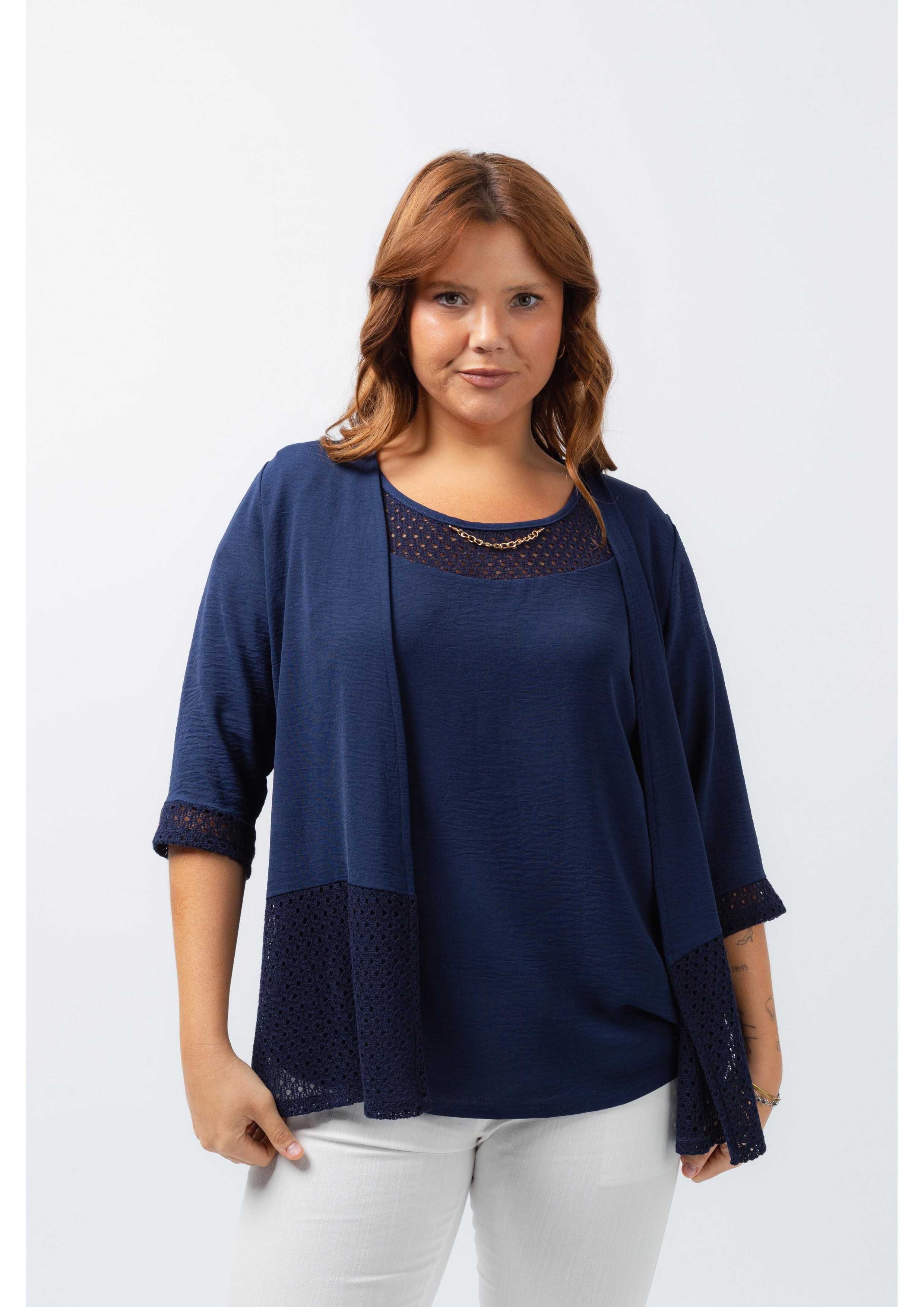 Ensemble en tissu uni. Débardeur à épaule dénudée, avec insertion en dentelle au décolleté et applique doré, fentes latérales. Veste à manches 3/4 avec poignet en dentelle, insertion en bas également en dentelle, coupe droite. Collection : Printemps Été Disponible en Grandes Tailles Produit de design et fabrication propre. Nous sommes une marque de confection de vêtements avec plus de 50 ans d'expérience Modèle : Taille 1,70m et porte la taille XL. Composition : DENTELLE 85% Polyester 15% Coton | UNI 100% Polyester